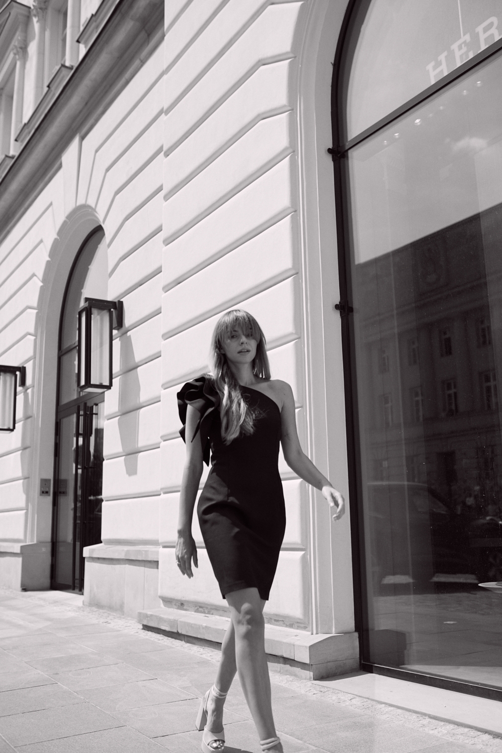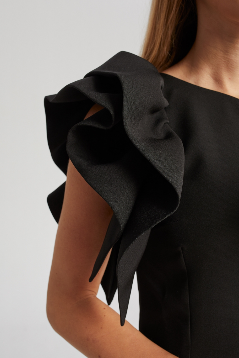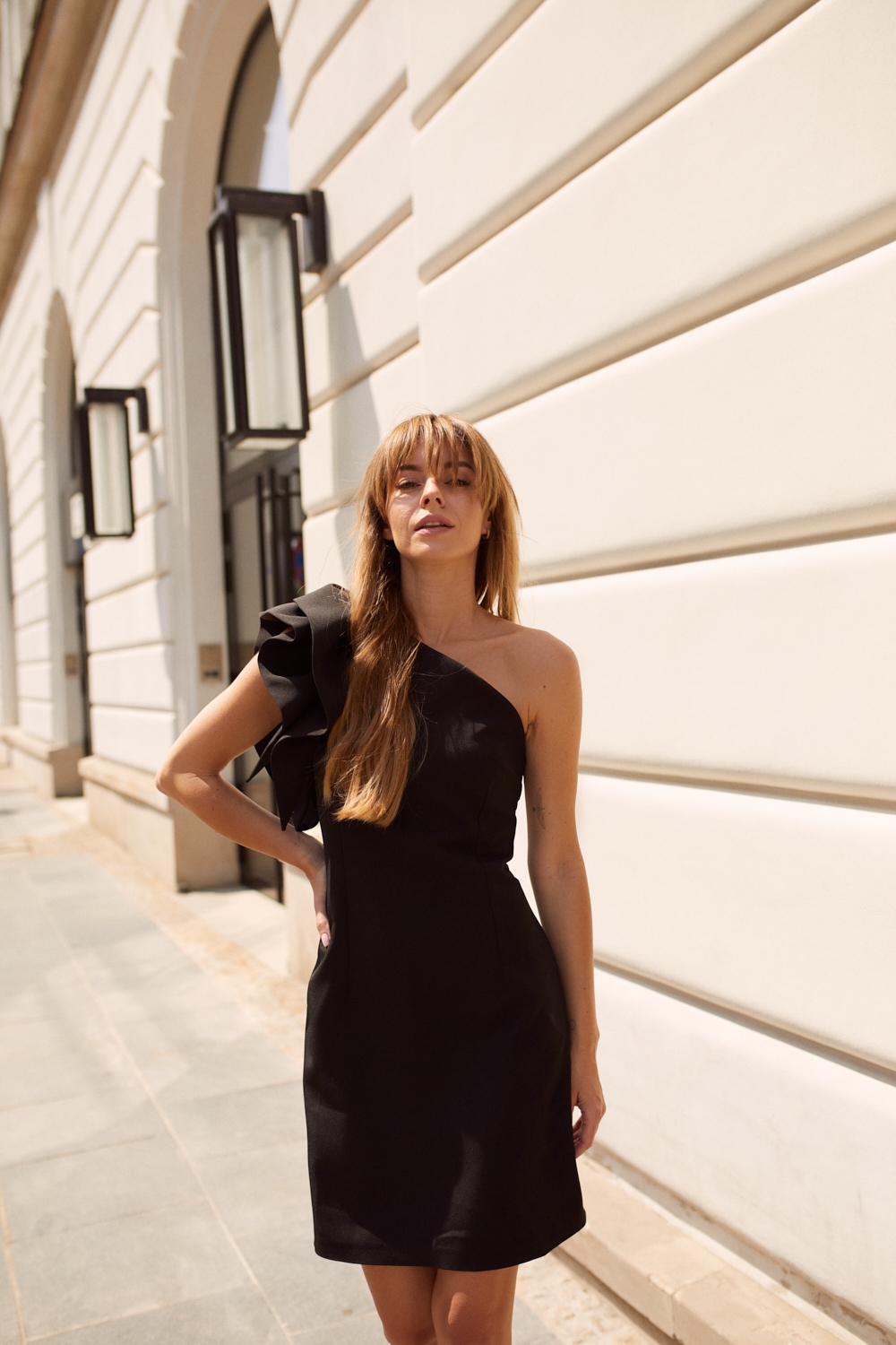 Czarna sukienka o dopasowanym fasonie przed kolano, uszyta z miękkiej tkaniny karelia (mieszanka wiskozy i poliestru), która się nie gniecie. To połączenie kobiecej elegancji i niebanalnego stylu: model przykuwa uwagę asymetrycznym dekoltem na jedno ramię, który zdobi efektowna falbana, nadająca całości wyrazistego charakteru. Dopasowany krój pięknie podkreśla sylwetkę i posiada małe rozcięcie z tyłu oraz kryty zamek z boku. Klasyczna czerń sprawia, że jest to doskonała propozycja na wyjątkowe okazje, wesele, letnie imprezy czy rodzinne przyjęcia.