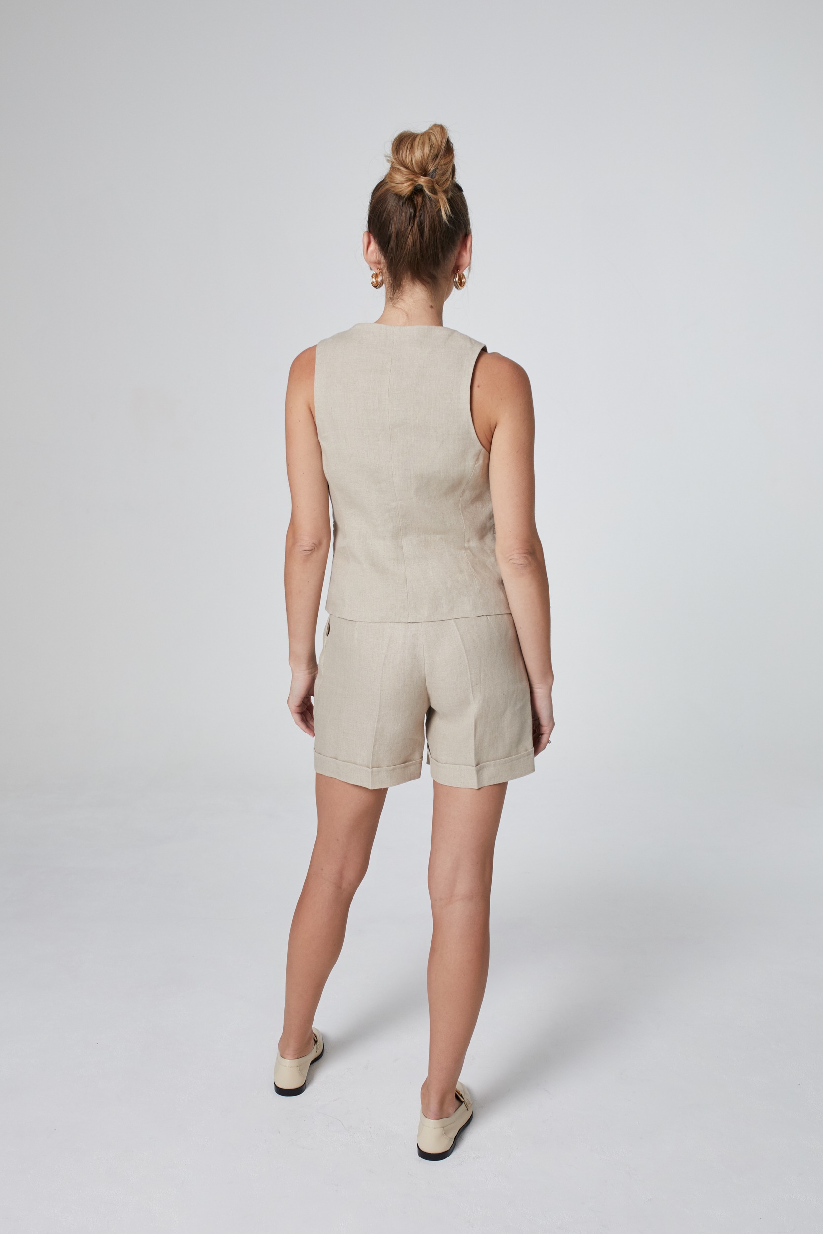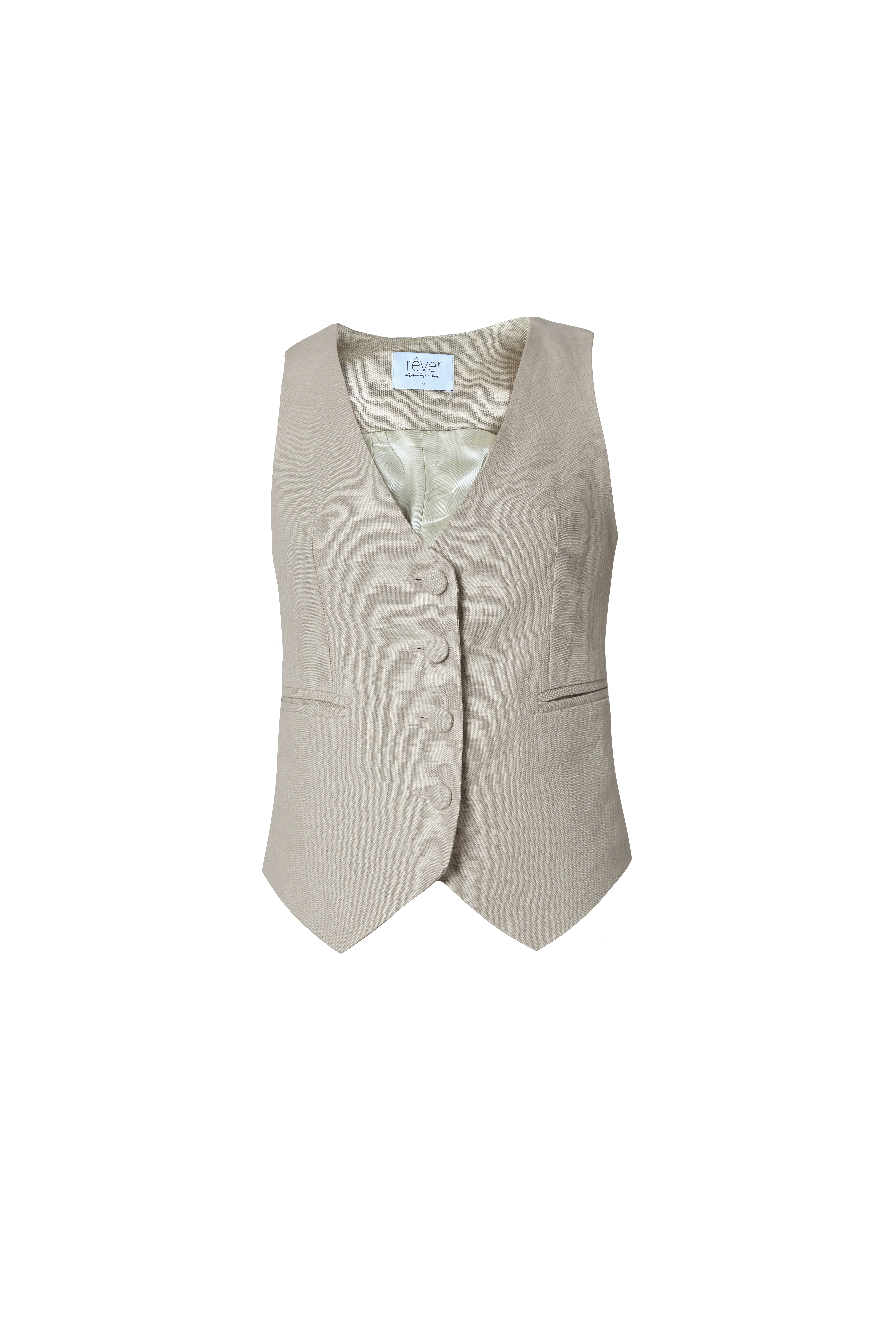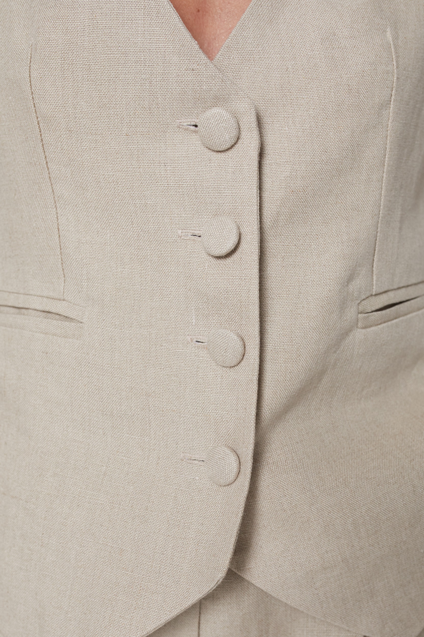 Klasyczna garniturowa kamizelka, która nada charakteru wielu stylizacjom. Uszyta z lnianej tkaniny w pięknym odcieniu jasnego beżu. Taliowany fason podkreśla kobiece kształty przełamując męski charakter tego modelu. Kieszenie z przodu oraz zapięcie na oblekane guziki. Kamizelka świetnie sprawdzi się jako alternatywa dla marynarki. Idealnie nadaje się do pracy, na spotkanie z przyjaciółmi oraz na co dzień. W połączeniu z szortami do kompletu stworzy nowoczesny letni zestaw.