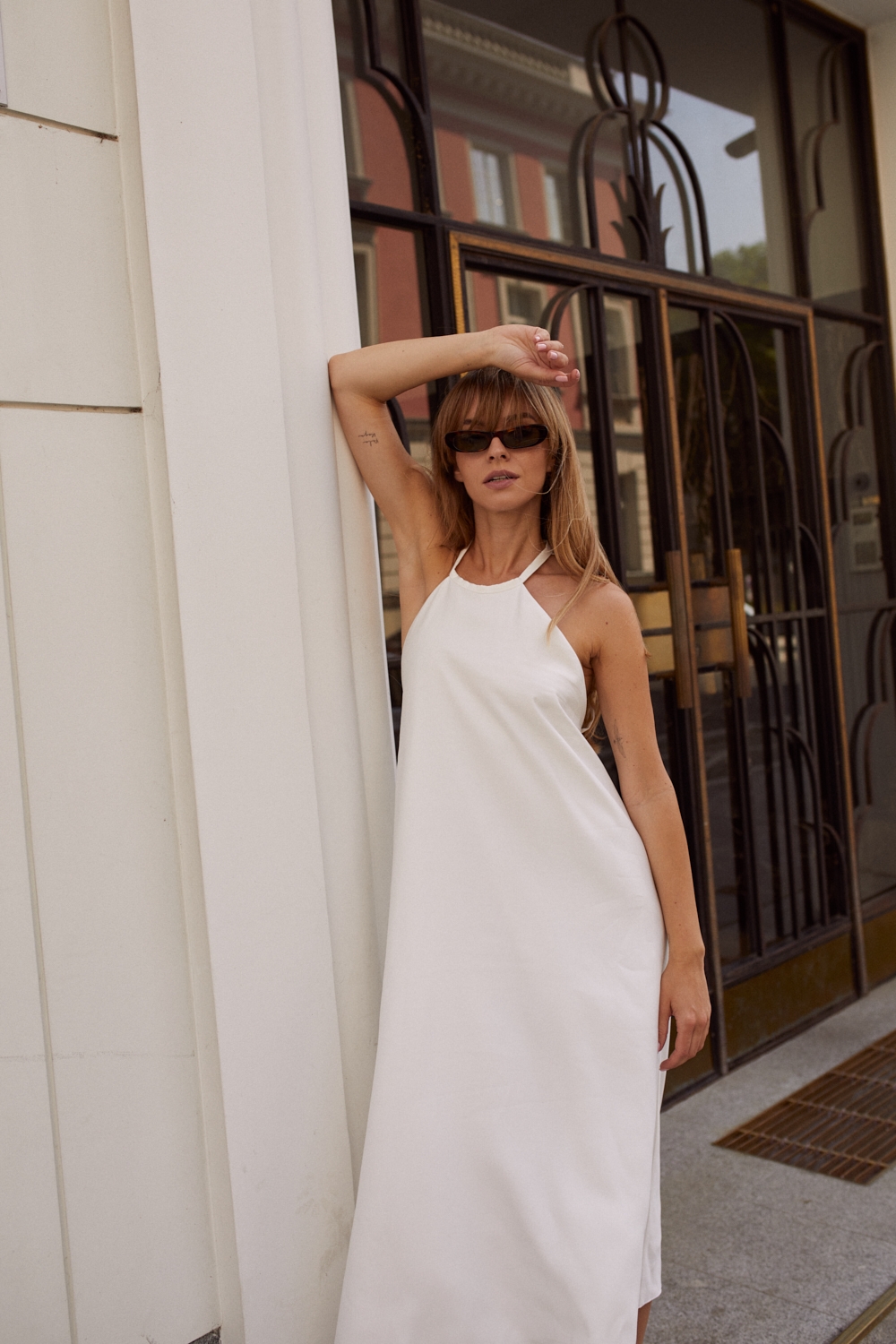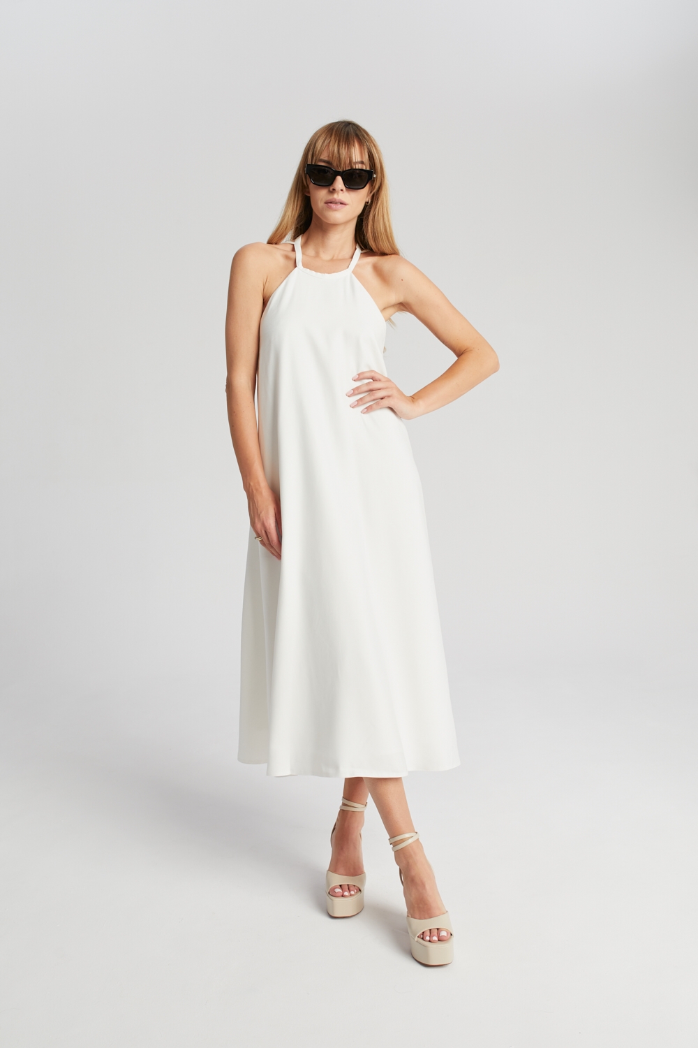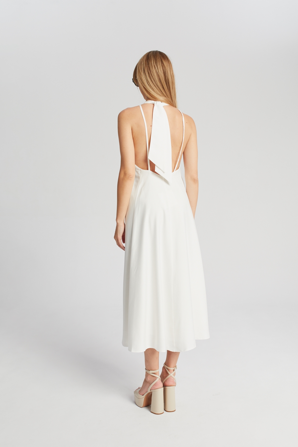 Śmietankowa sukienka midi o fasonie z dopasowaną górą i rozkloszowanym dołem, uszyta w 100% z przewiewnego rayonu. To zwiewny model, który pięknie eksponuje plecy, a wiązanie na szyi pozwala na łatwą regulację długości. Dla dodatkowego komfortu jest wykończona wiskozową podszewką. To idealny wybór na co dzień, na letnie spacery, wakacje, wesele lub inne letnie przyjęcia.