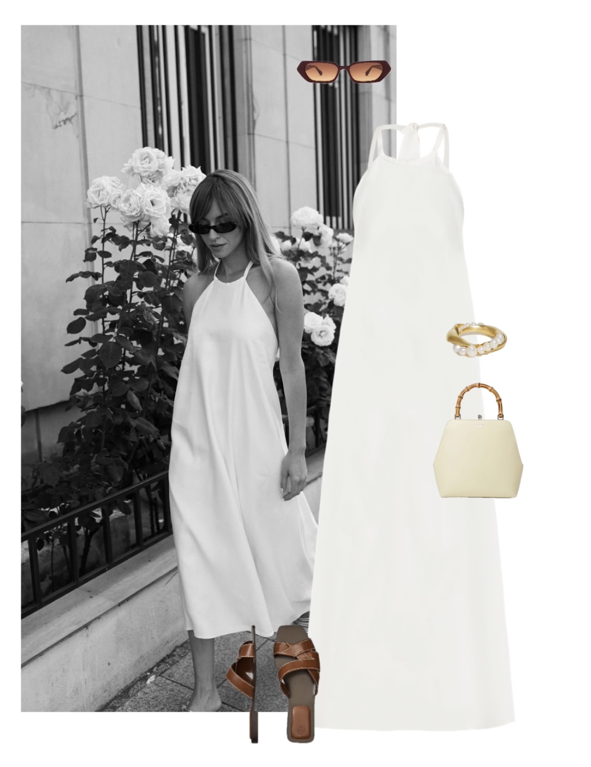 Fason: midi, wiązana na szyi. Dopasowana góra, rozkloszowany dół.