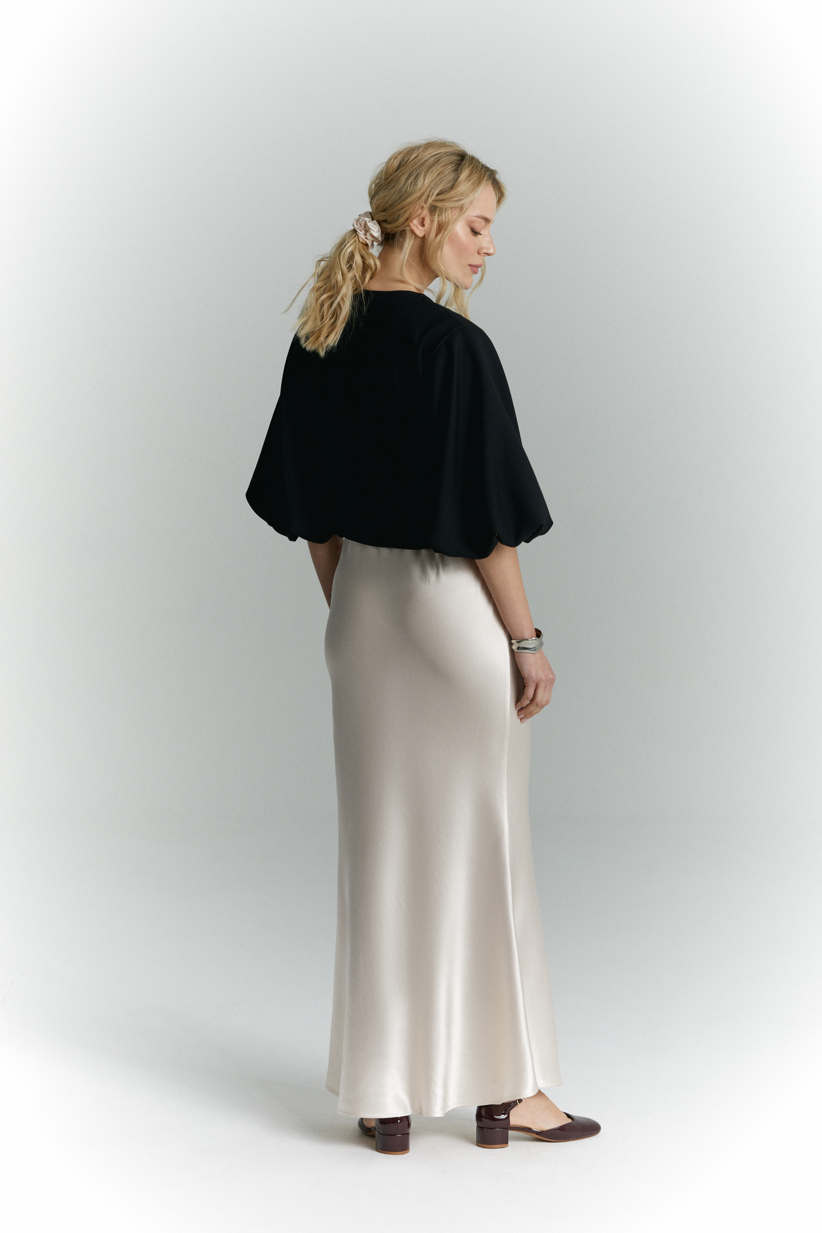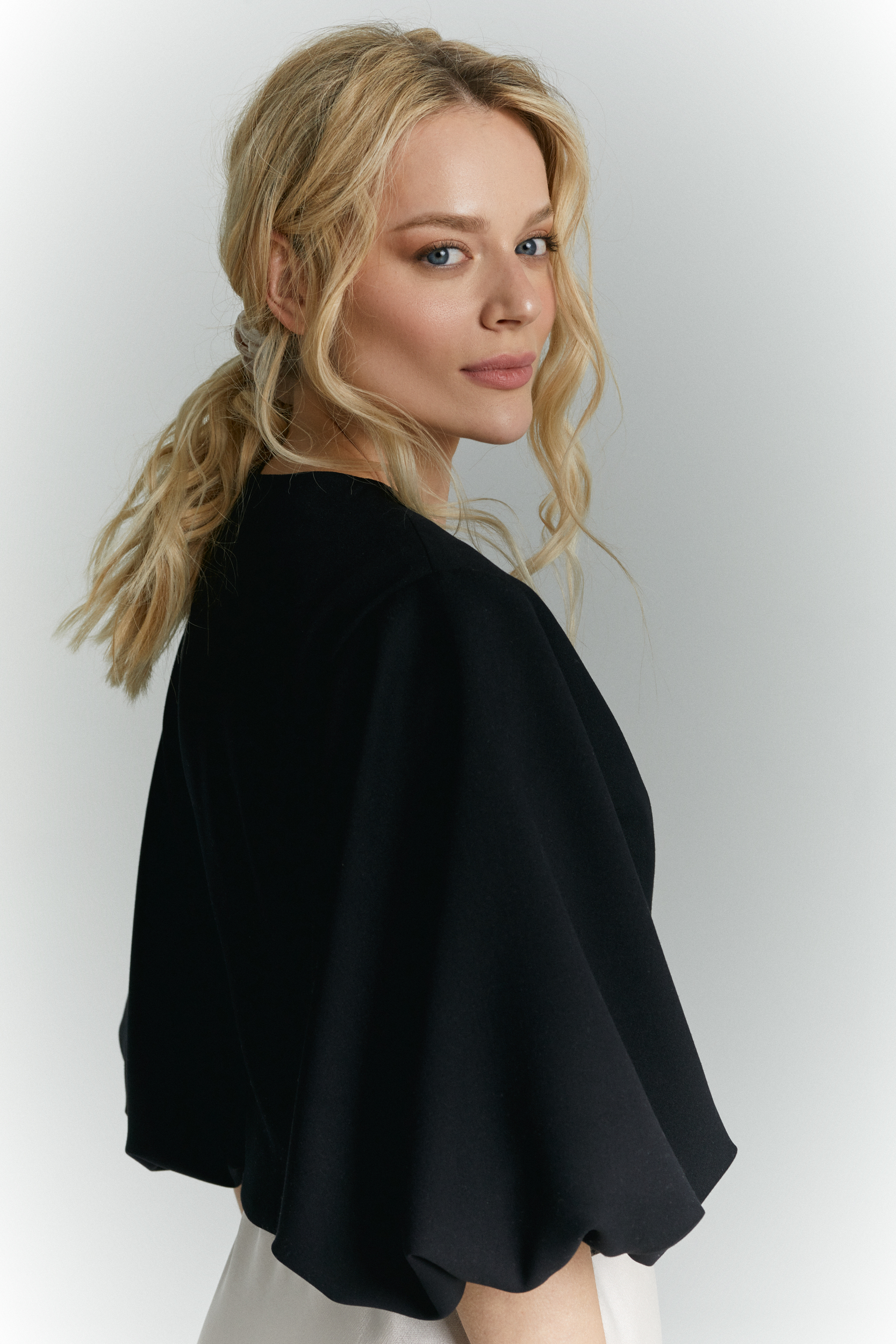 Fason: krótki, kopertowy, bufiaste rękawy o długości 3/4