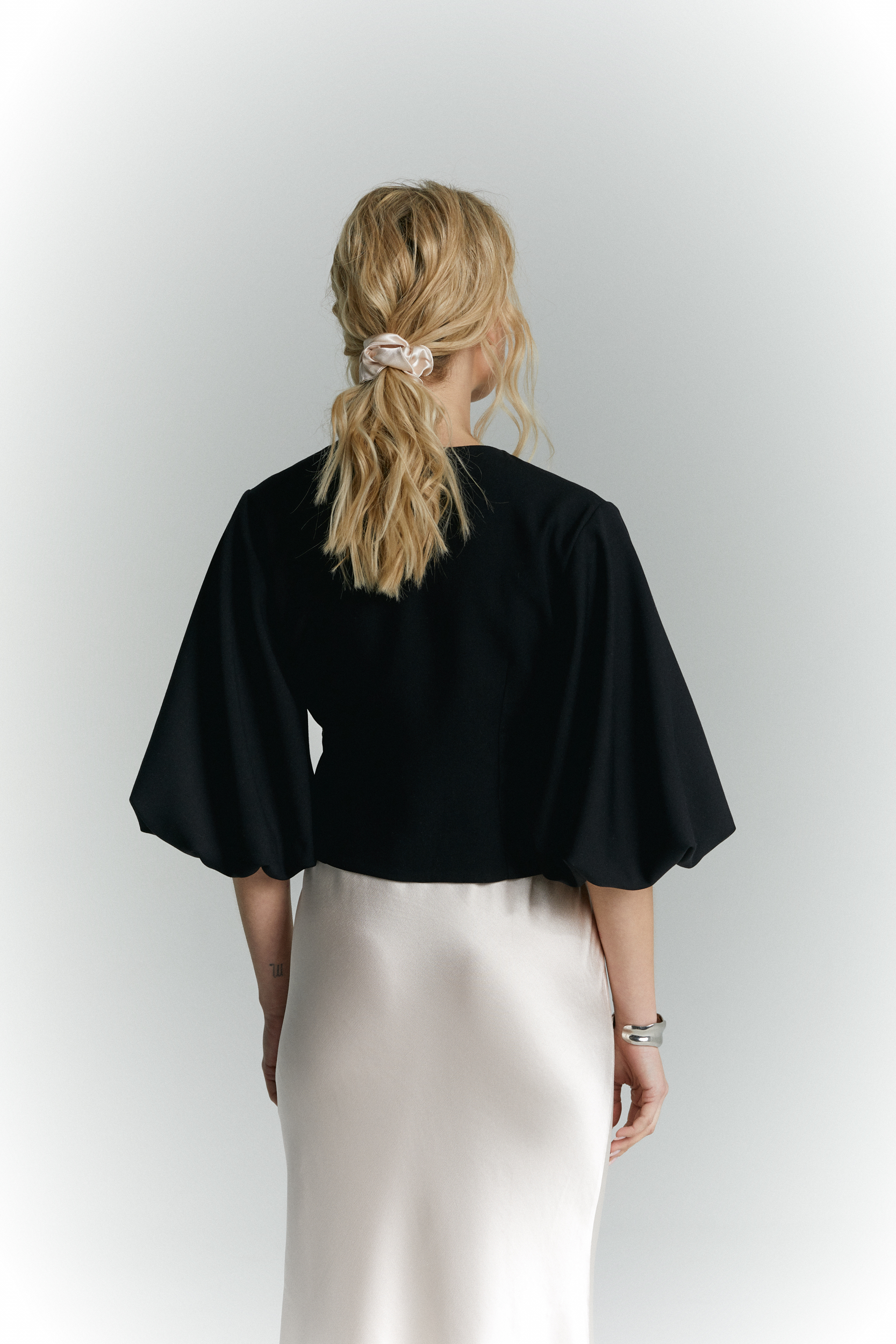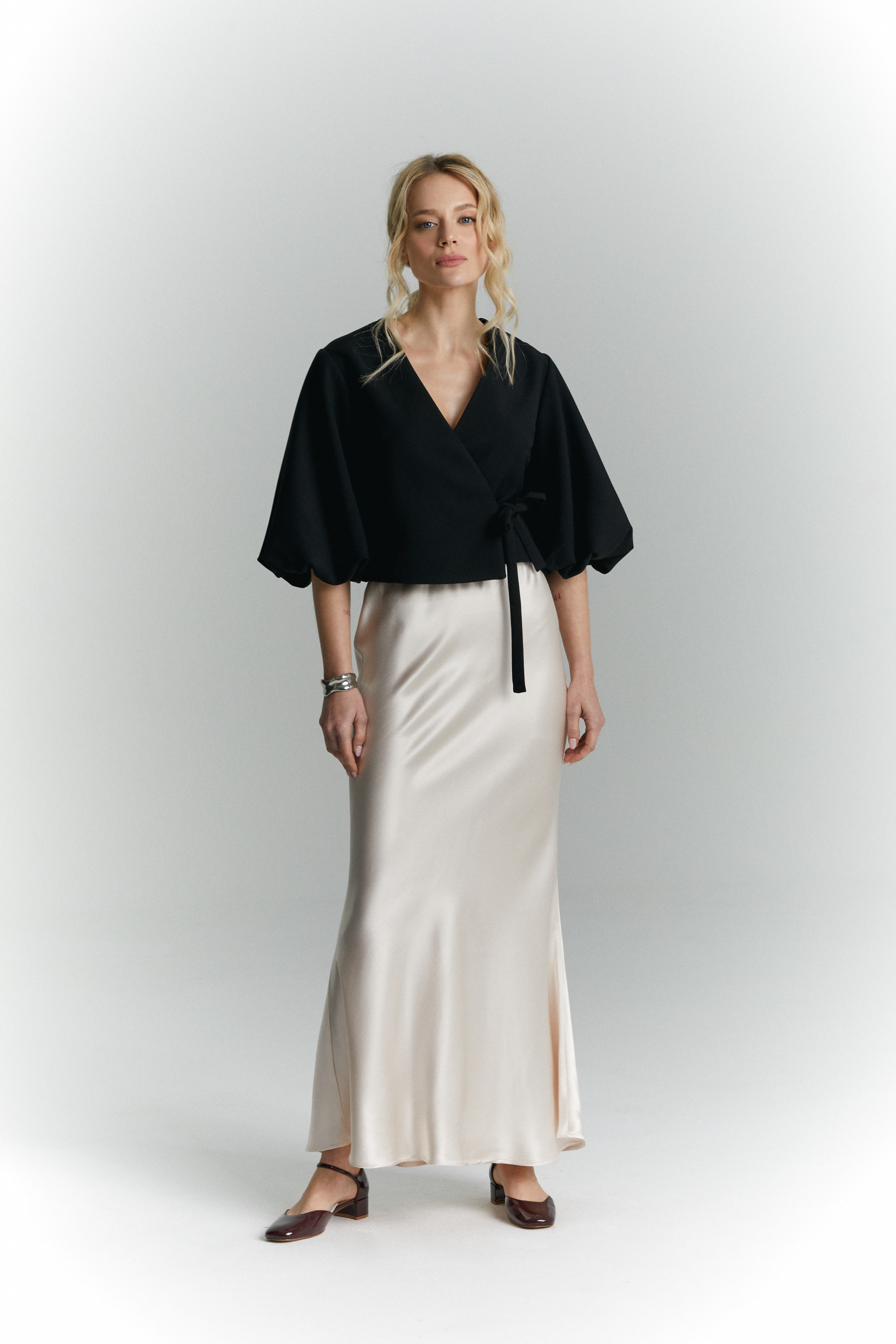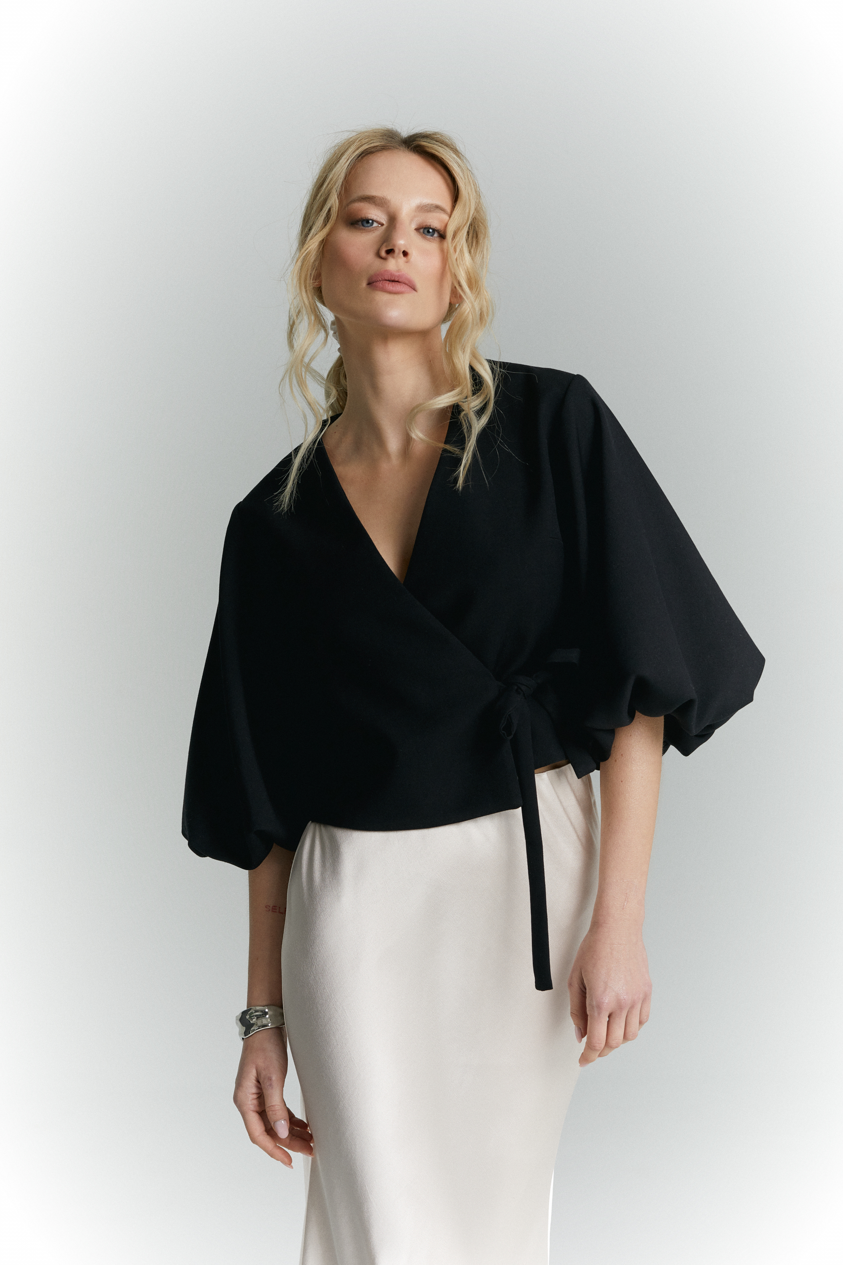 Krótka, kopertowa bluzka z bufiastymi rękawami to nowoczesna interpretacja klasycznej elegancji. Wiązanie w talii pozwala na idealne dopasowanie bluzki do sylwetki. Bufiaste rękawy o długości 3/4 nadają jej charakteru, tworząc subtelny, ale efektowny akcent. Model został wykończony wiskozową podszewką z lamowaniem, co gwarantuje komfort noszenia. Świetnie komponuje się ze spódnicą ołówkową do kompletu, ale można go także zestawić z eleganckimi spodniami lub nosić w bardziej swobodnym wydaniu.