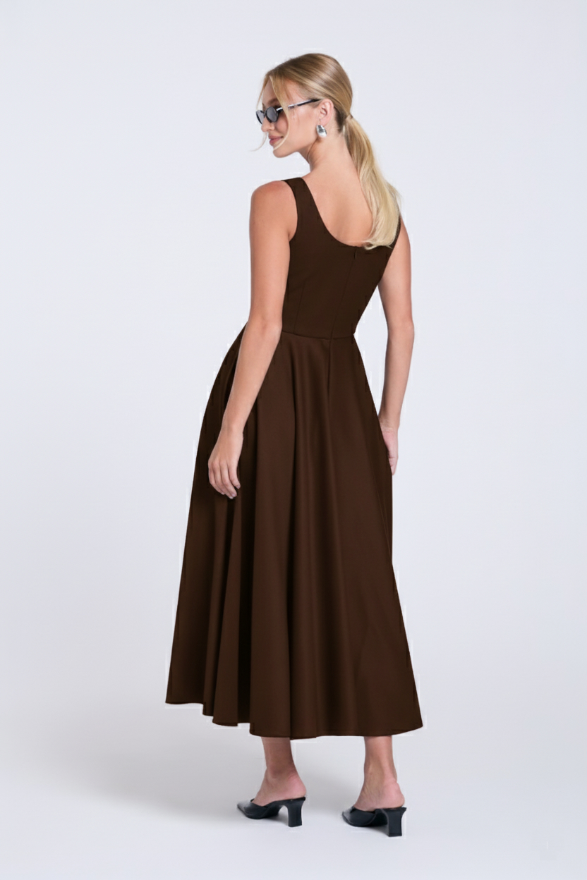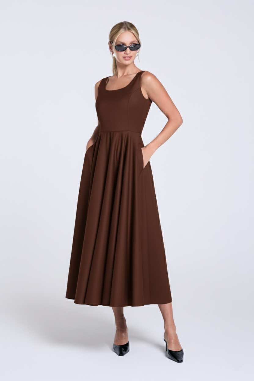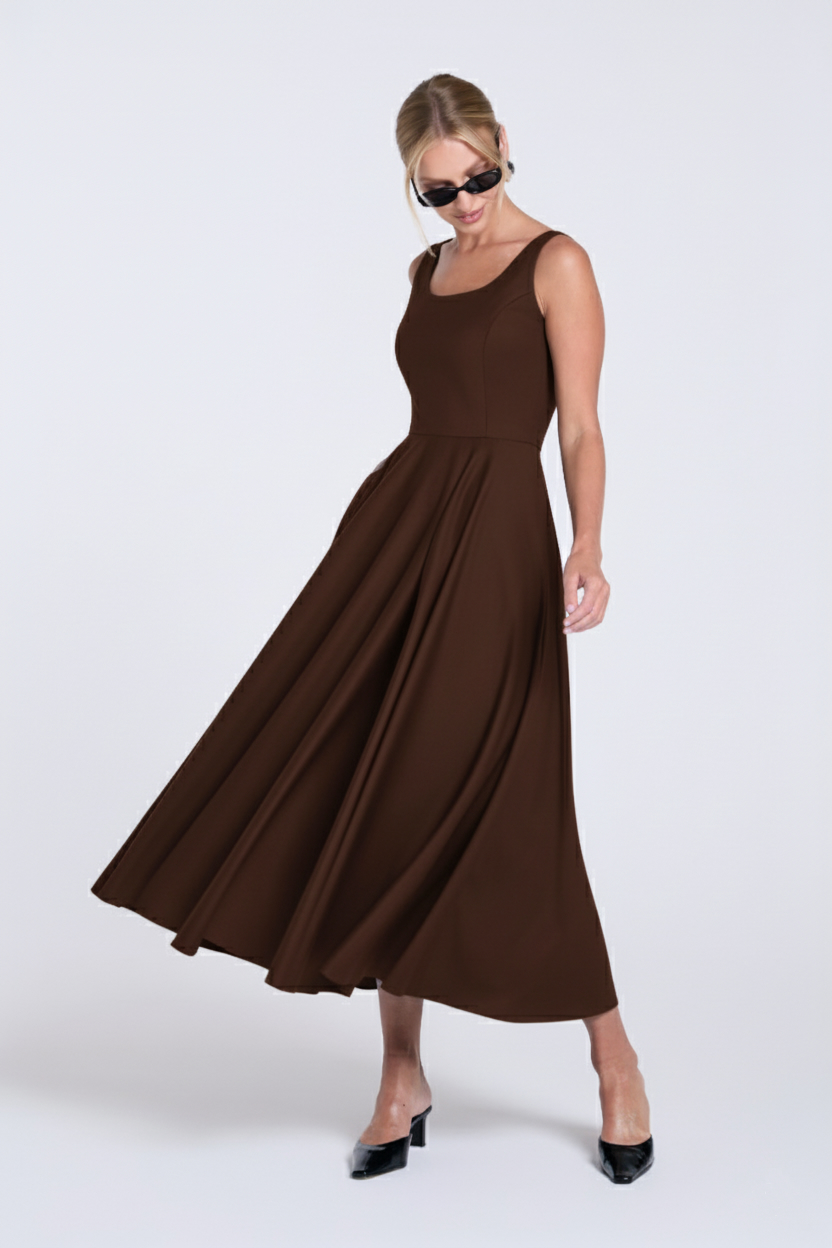 Brązowa sukienka midi Kate, uszyta z mięsistej wiskozy. Fason tej sukienki pięknie podkreśla talię, łącząc dopasowaną górę ze spektakularnym, szerokim dołem skrojonym z koła, który miękko układa się w ruchu. Klasyczny okrągły dekolt, szerokie ramiączka i boczne kieszenie nadają jej ponadczasowego charakteru. To sukienka stworzona na wielkie wyjścia, ale równie dobrze odnajdzie się w minimalistycznej stylizacji na co dzień.