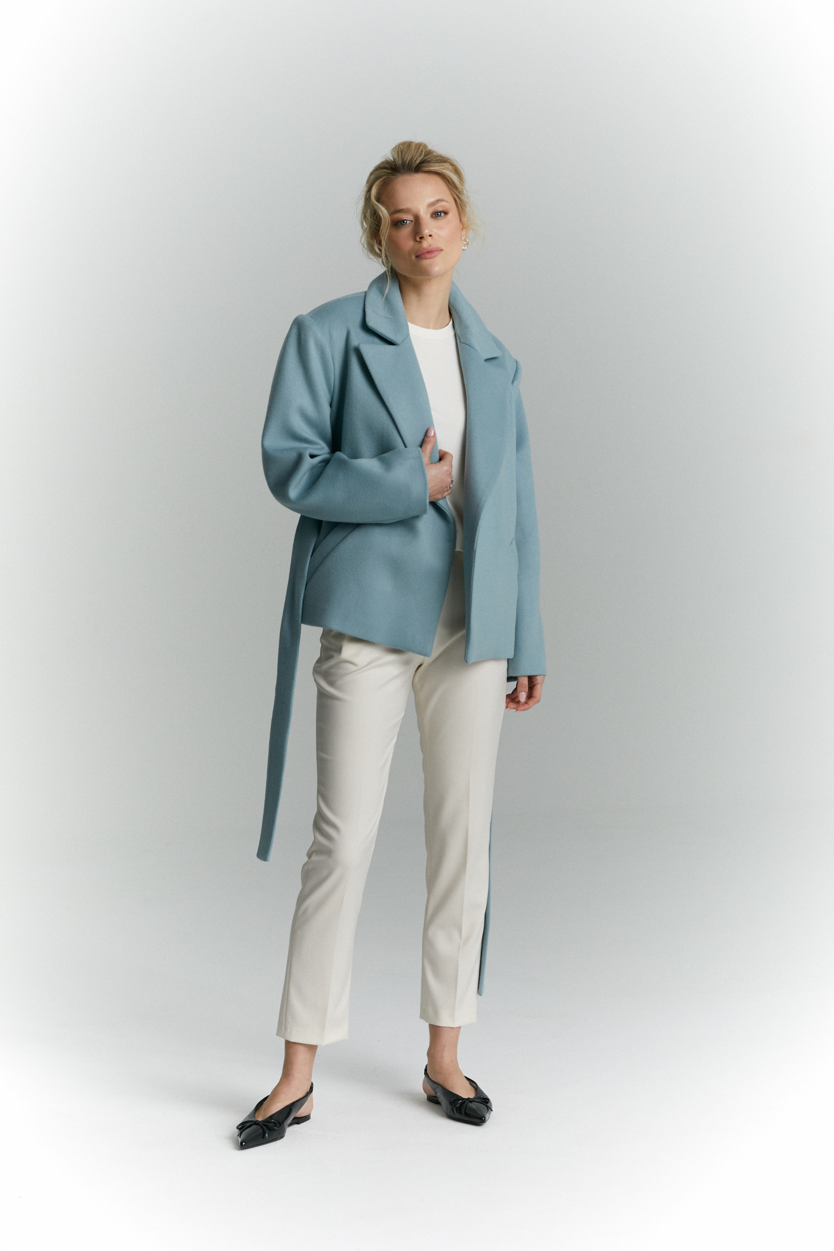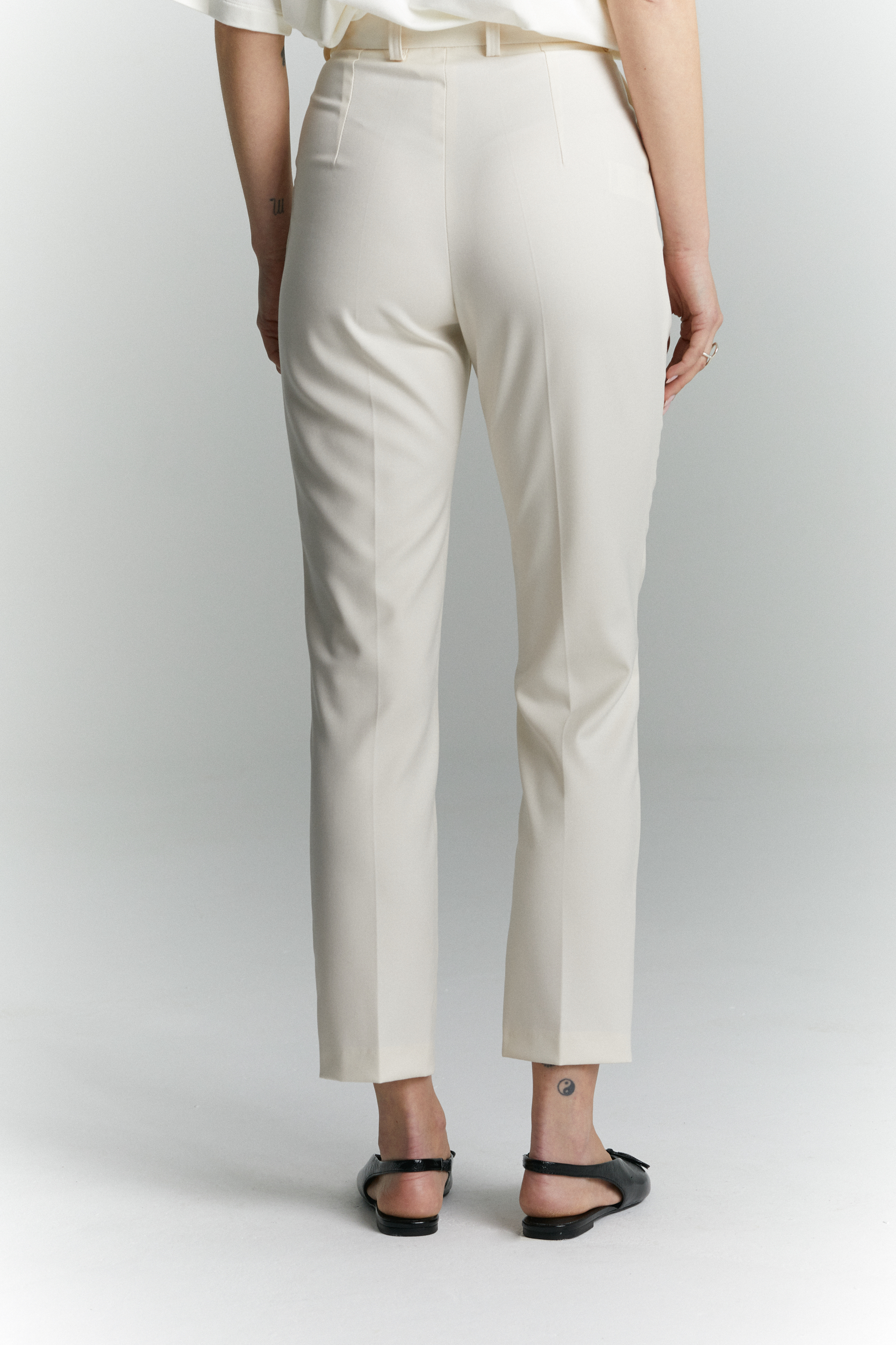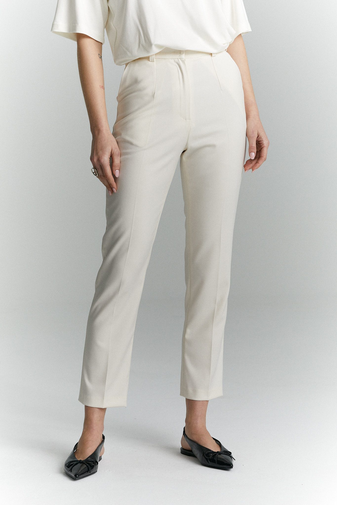 Waniliowe cygaretki z wysokim stanem i zwężaną nogawką, uszyte z mieszanki wiskozy. To nowoczesna odsłona klasyki, dopasowany krój subtelnie podkreśla sylwetkę, a nogawka o długości przed kostkę doskonale prezentuje się zarówno z płaskimi butami, jak i szpilkami. Model posiada boczne kieszenie, szlufki na pasek oraz zapięcie na zamek i dyskretną haftkę. To idealny wybór do pracy, na co dzień lub na eleganckie wyjścia – zwłaszcza w komplecie z marynarką w tym samym odcieniu.