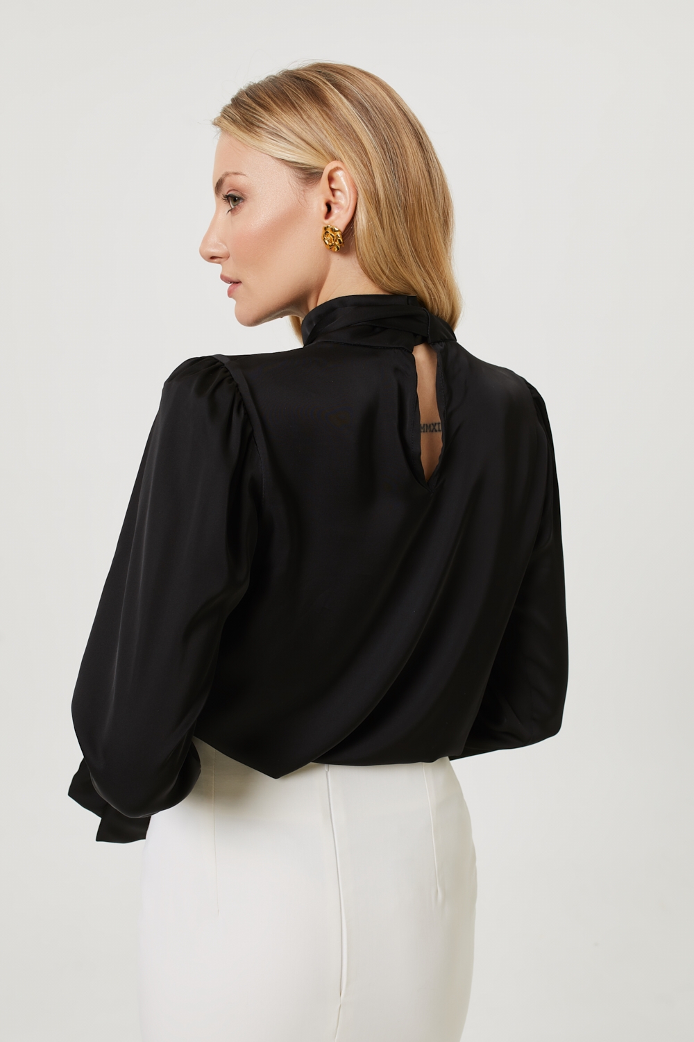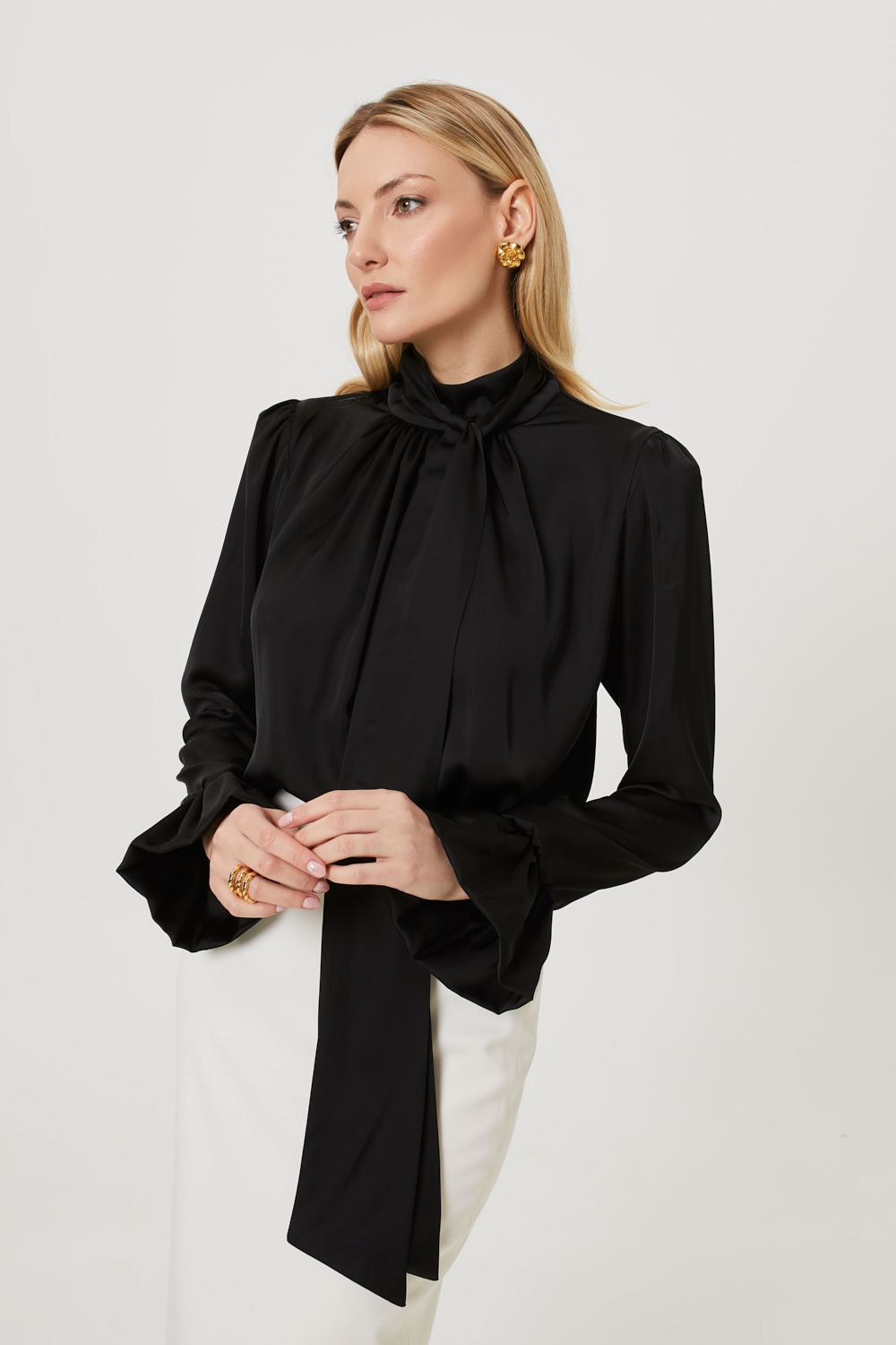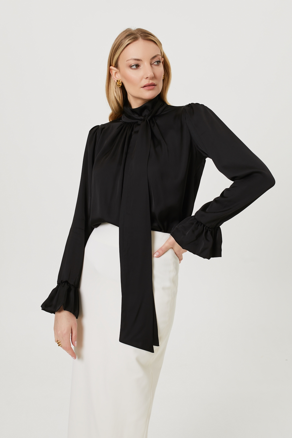 Czarna bluzka Aby o luźnym fasonie, uszyta jest z eleganckiej wiskozy satynowej. Ten projekt nawiązuje do klasyki, jednocześnie wprowadzając elementy współczesnego stylu: posiada zabudowany dekolt ze stójką, który zdobią ozdobne szarfy (do wiązania lub luźnego puszczenia). Długi rękaw z delikatną bufką jest zakończony gumką i ozdobną falbaną, a całość dopełniają oblekane guziki. To wszechstronna bluzka, idealna na biznesowe spotkania, do pracy lub na wieczór, która doskonale wygląda zestawiona zarówno ze spodniami, jak i spódnicą.