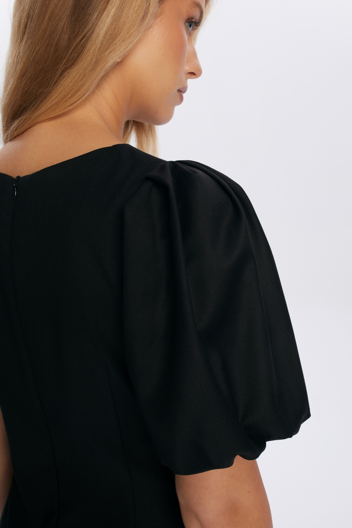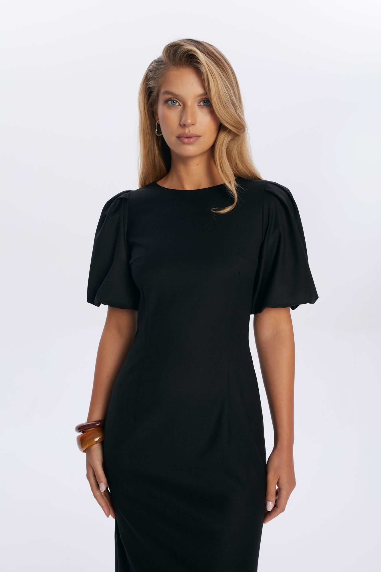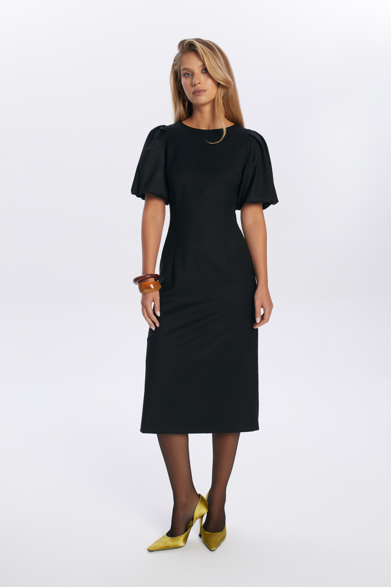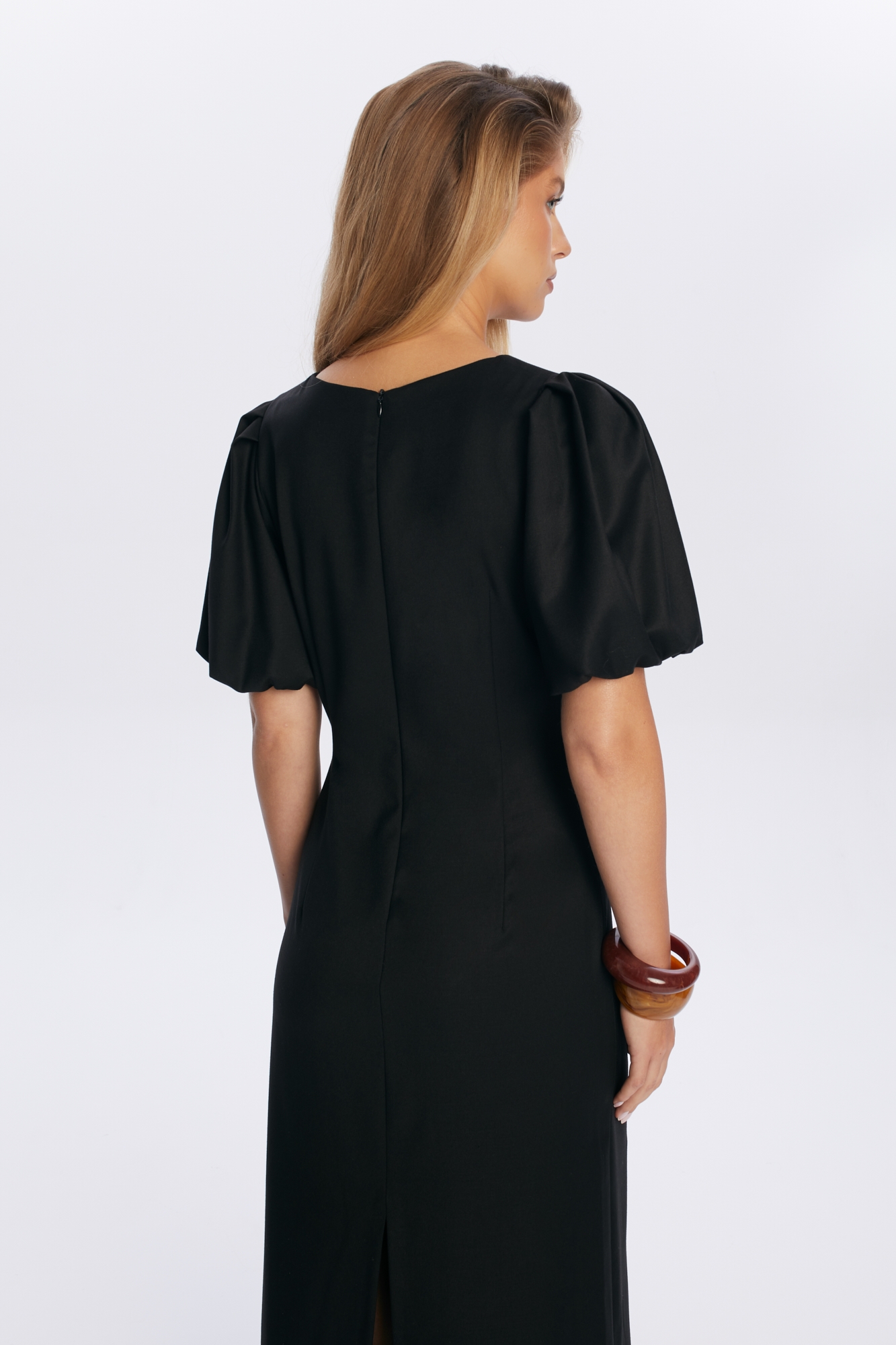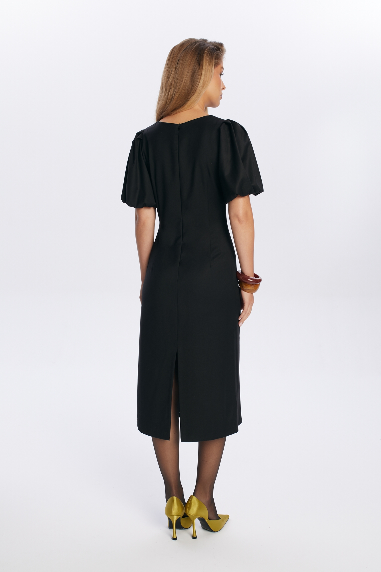 Czarna sukienka midi Loren, uszyta z mieszanki wiskozy. To propozycja dla kobiet ceniących klasyczny, kobiecy styl: jej dopasowana góra z zaszewkami podkreśla sylwetkę, a lekko rozkloszowany dół z rozcięciem z tyłu pięknie układa się w ruchu. Całość dopełniają efektowne bufiaste rękawy i klasyczny okrągły dekolt. To doskonały wybór na formalne spotkanie, wesele lub rodzinne wydarzenie.