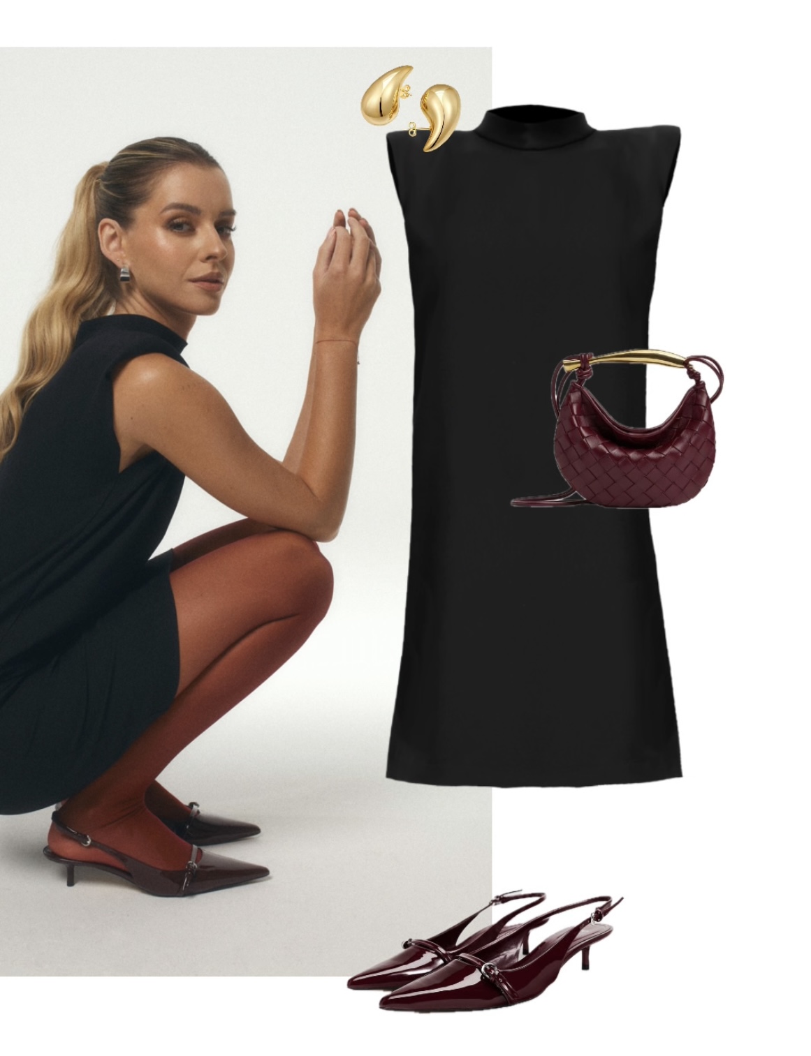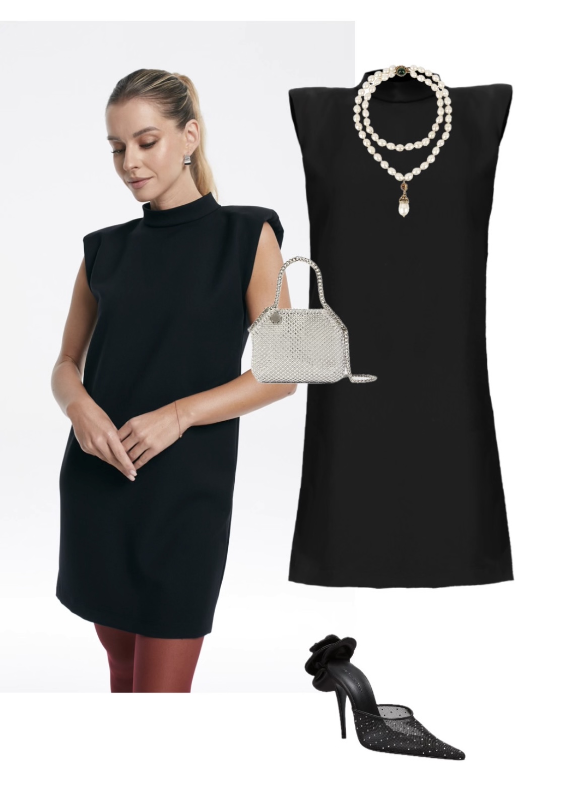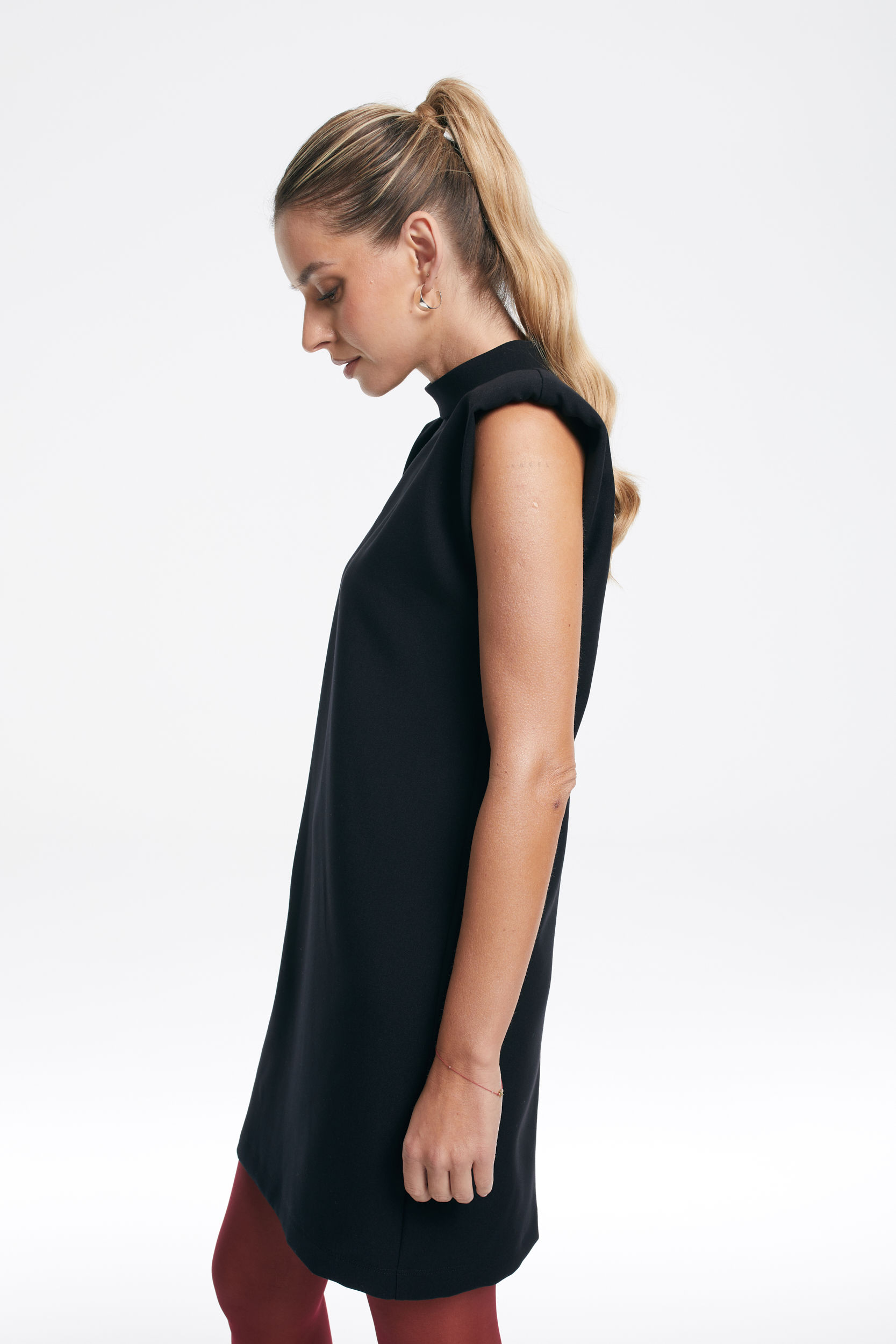W kolekcjach marki znajdziecie nie jedną klasyczną małą czarną. Tym razem nasza propozycja to nowoczesna w swojej formie czarna sukienka z golfem. Charakterystyczną cechą tego modelu jest fason bez rękawów, z wszytymi na ramionach poduszkami. Wykonana z grubszej mięsistej tkaniny z dodatkiem elastanu nie będzie się gniotła. Długość mini pięknie wyeksponuje nogi. Sukienka idealnie prezentuje się ze szpilkami tworząc elegancki look. Jednak równie ciekawie będzie wyglądać z płaskimi butami w codziennych stylizacjach. Zimą można nosić ją z długimi kozakami.