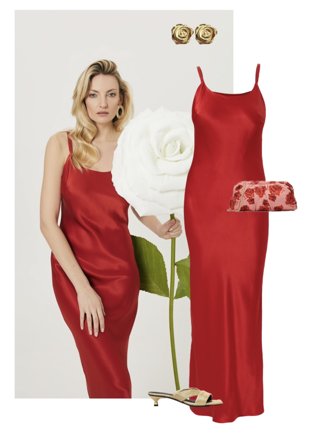 Czerwona długa sukienka maxi Skarlet, skrojona ze skosu, uszyta w 100% z miękkiej, lejącej wiskozy satynowej. Jej prosty, lecz wyrafinowany fason posiada okrągły dekolt i cienkie, regulowane ramiączka, które umożliwiają indywidualne dopasowanie. Cięcie ze skosu sprawia, że sukienka o subtelnym połysku idealnie układa się na sylwetce, podkreślając jej atuty. To doskonały wybór na wieczorne wyjścia, letnie przyjęcia czy wakacje – świetnie wygląda noszona solo lub z oversizową marynarką.