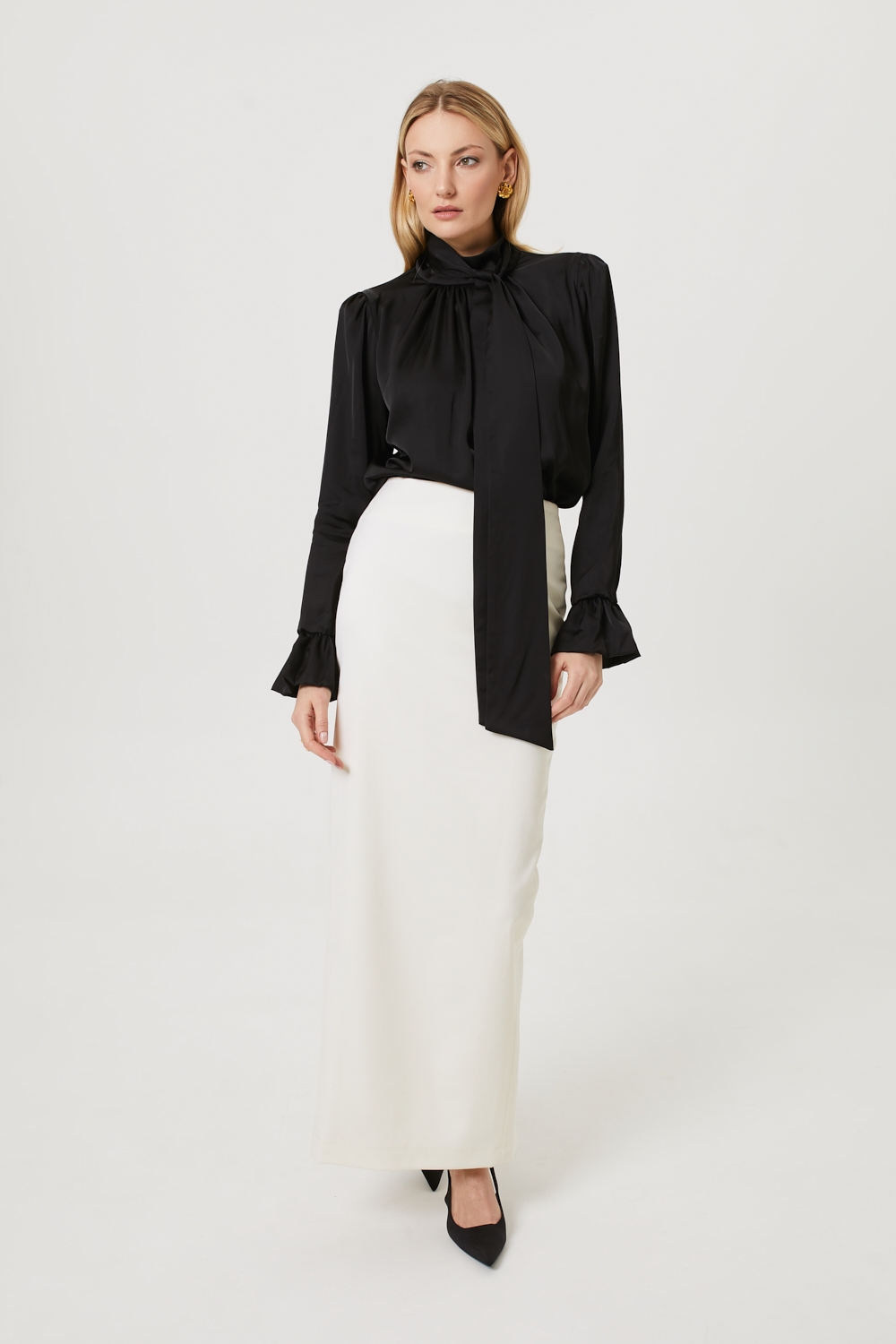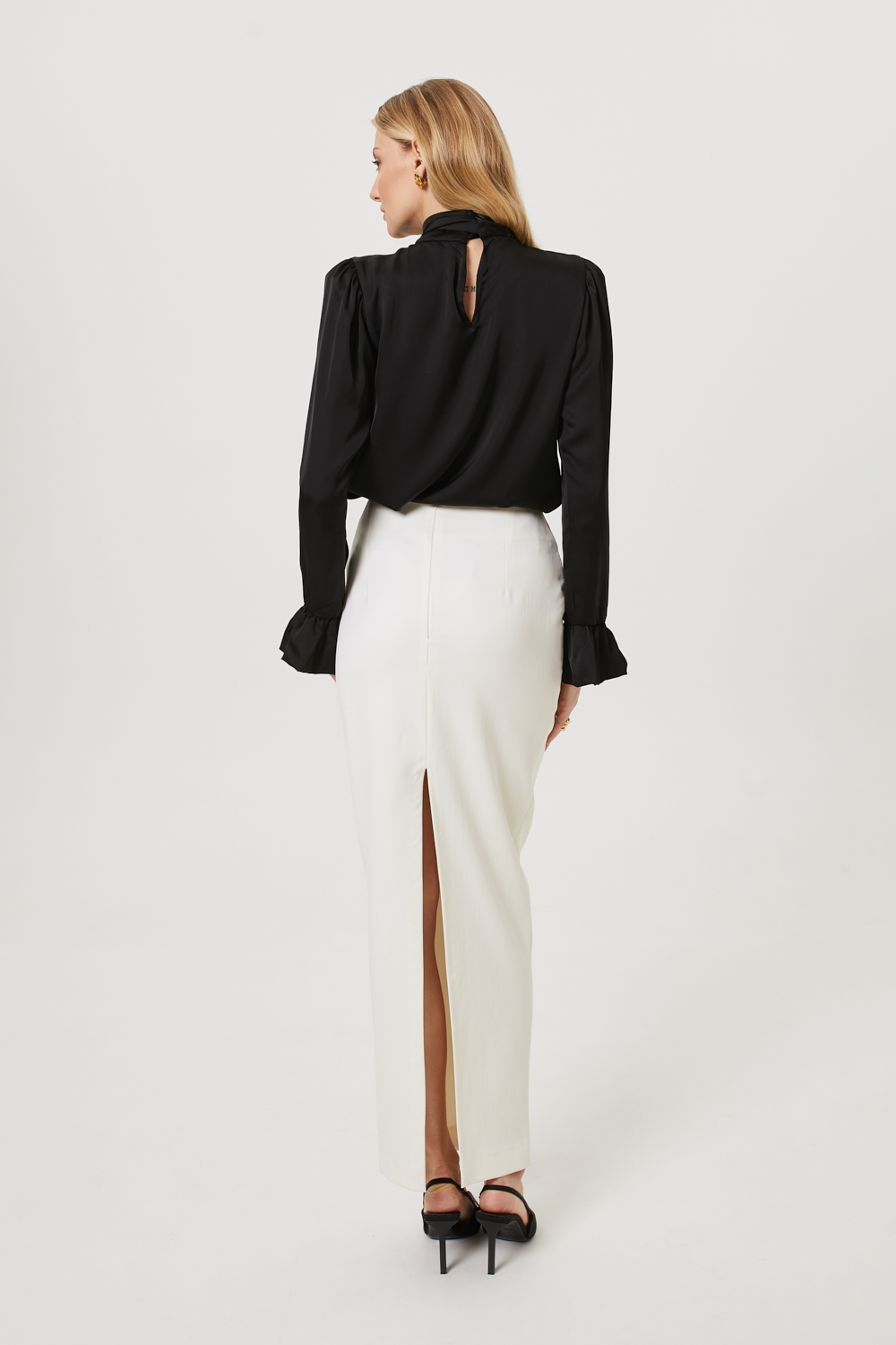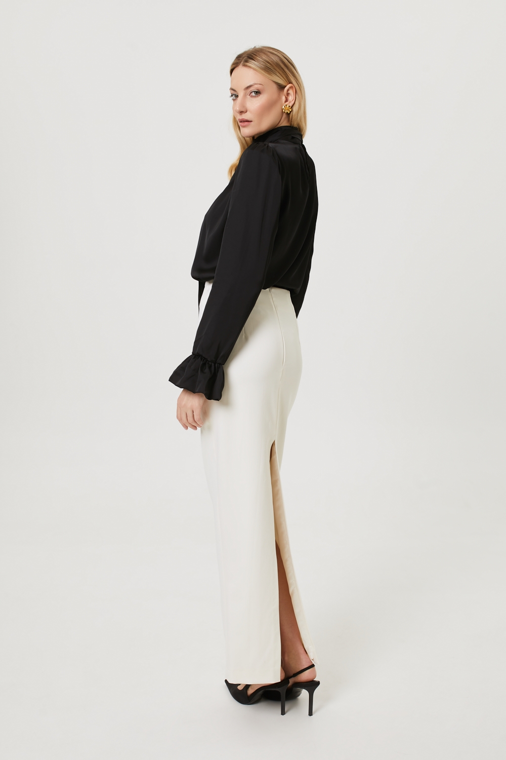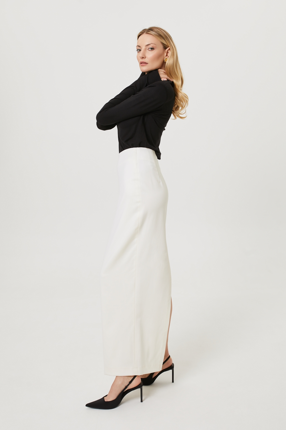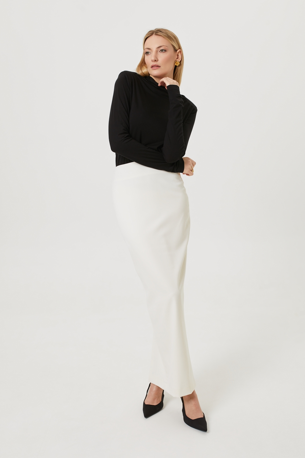 Śmietankowa długa spódnica maxi o dopasowanym fasonie z wysokim stanem, uszyta z mieszanki wiskozy. To model, który wyróżnia się eleganckim, minimalistycznym stylem: jej prosty krój delikatnie zwęża się ku dołowi, pięknie modelując sylwetkę. Spódnica posiada komfortową wiskozową podszewkę, rozcięcie z tyłu oraz kryty zamek. To klasyczny fason, idealny na eleganckie okazje i do biura, który świetnie współgra zarówno z eleganckimi, jak i bardziej casualowymi elementami garderoby.