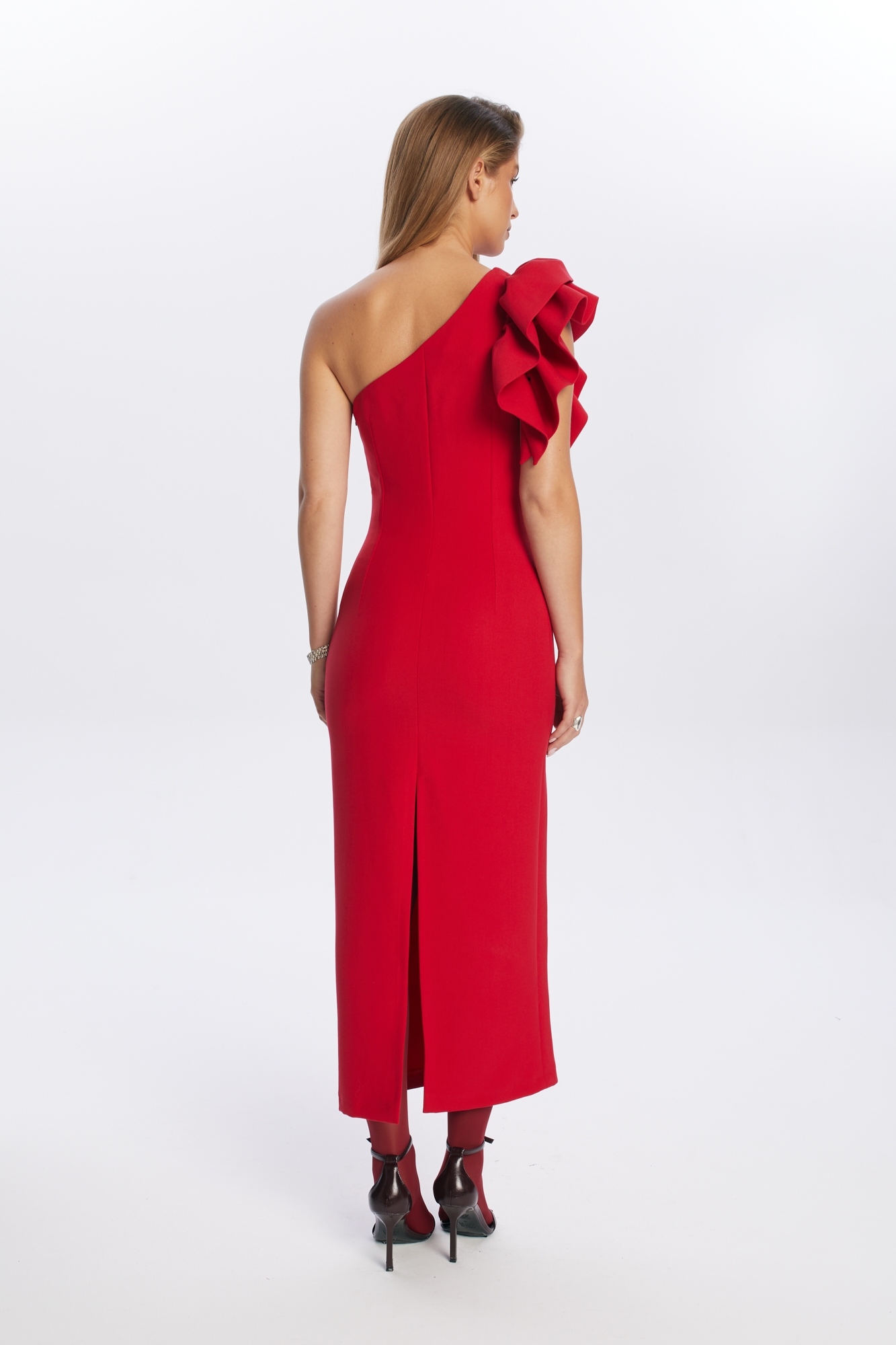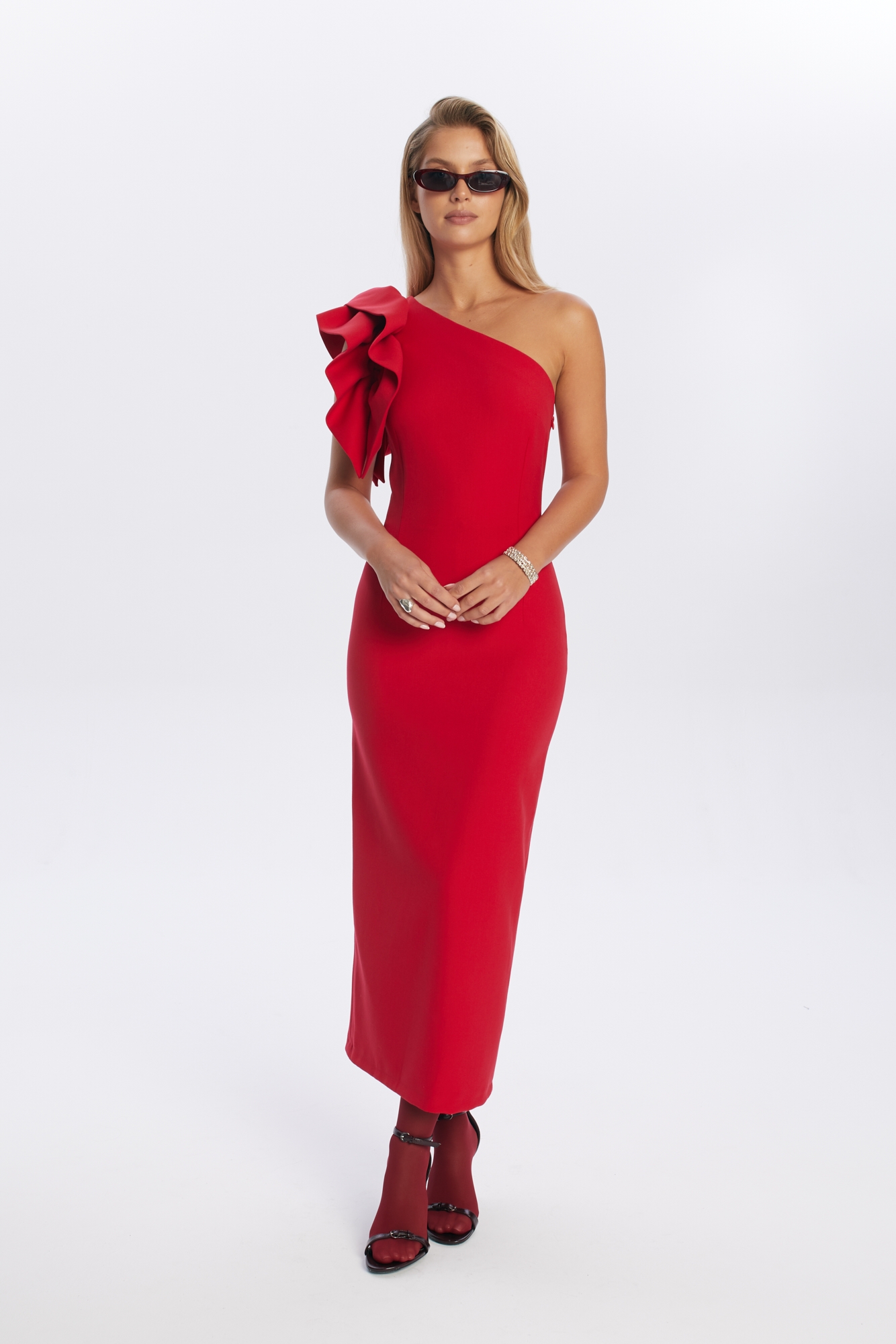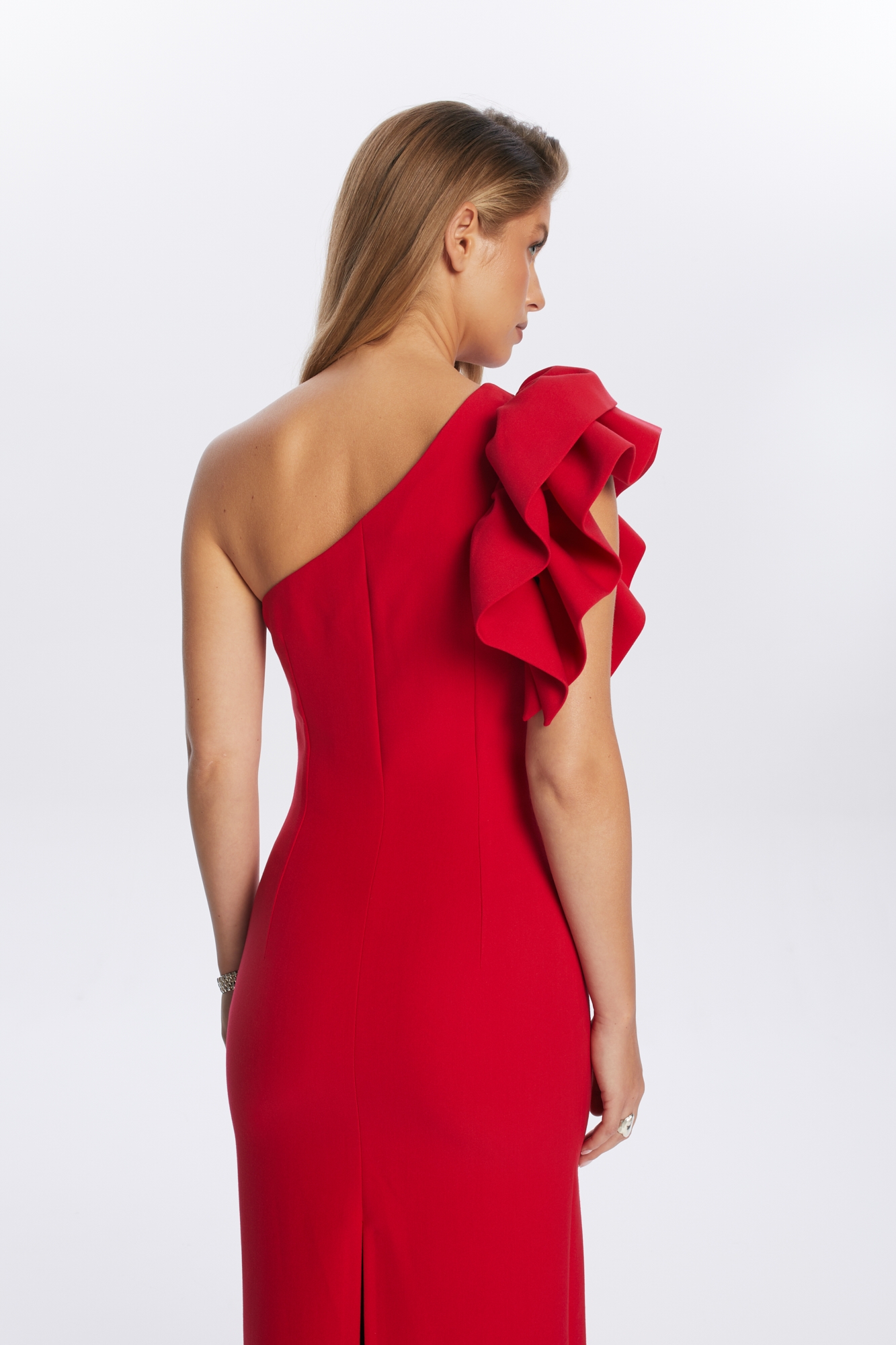 Czerwona długa sukienka Kora o dopasowanym kroju, uszyta z niegniotącej się mieszanki wiskozy. To połączenie elegancji i niebanalnego stylu – model przykuwa uwagę asymetrycznym dekoltem na jedno ramię, ozdobionym efektowną falbaną, która nadaje całości wyrazistego charakteru. Dopasowany krój pięknie podkreśla sylwetkę, a rozcięcie z tyłu zapewnia swobodę ruchów. To doskonała propozycja na wyjątkowe okazje, wesele, letnie imprezy czy rodzinne przyjęcia.