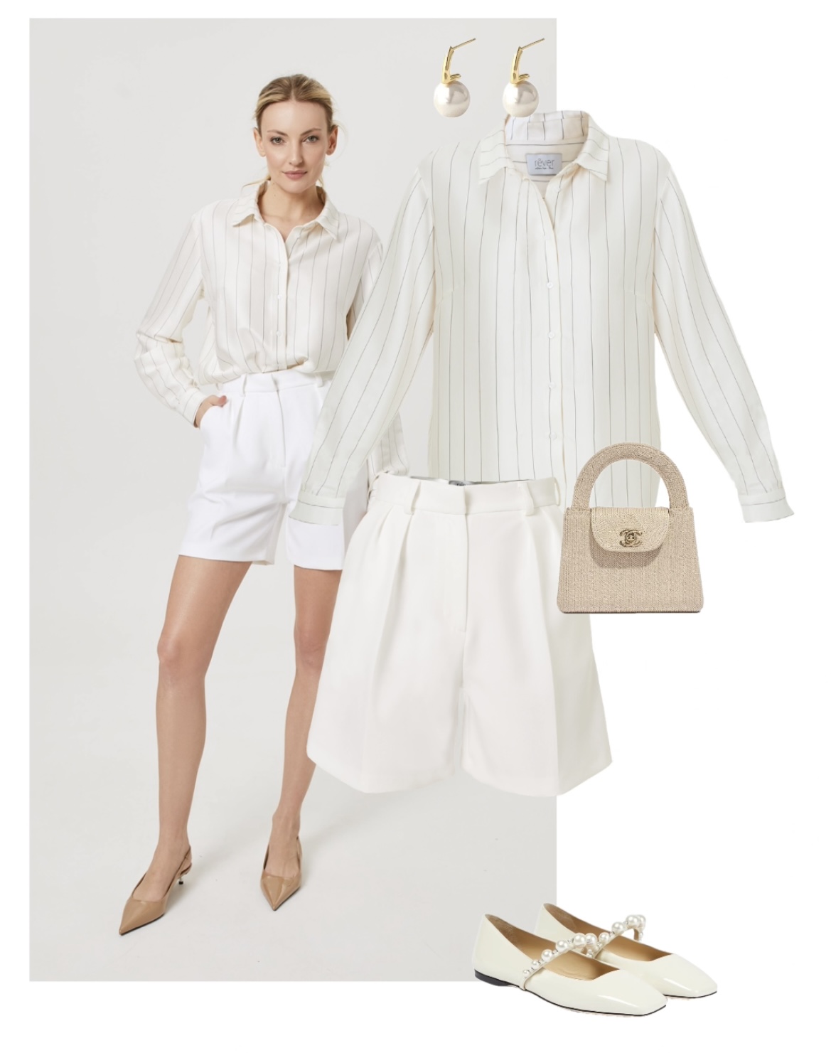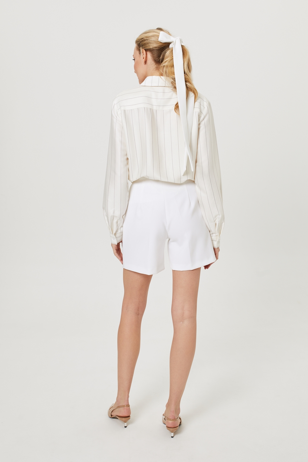 Szorty w kolorze śmietankowej bieli z wysokim stanem, o luźnym kroju do połowy uda, uszyte z mięsistej mieszanki wiskozy. Ich fason posiada luźne nogawki w kant z zakładkami, które sprawiają, że szorty zachowują elegancki, formalny styl. Model wyposażono w klasyczne detale: boczne kieszenie, szlufki na pasek oraz zapięcie na kryty zamek i haftkę. To idealny wybór na co dzień, do pracy lub na wakacje. Doskonale prezentują się w połączeniu z koszulą, tworząc elegancki letni look, lub w wersji bardziej casualowej z luźnym T-shirtem.