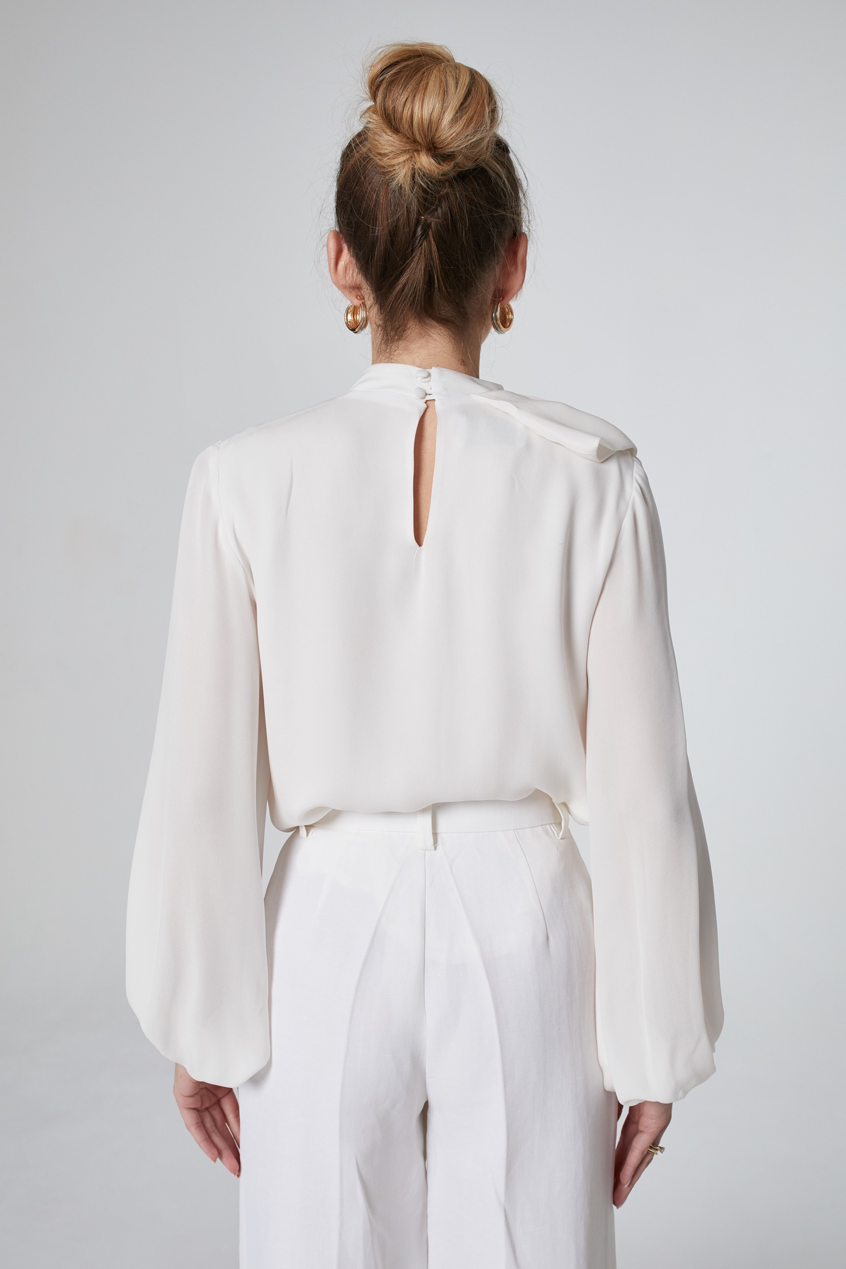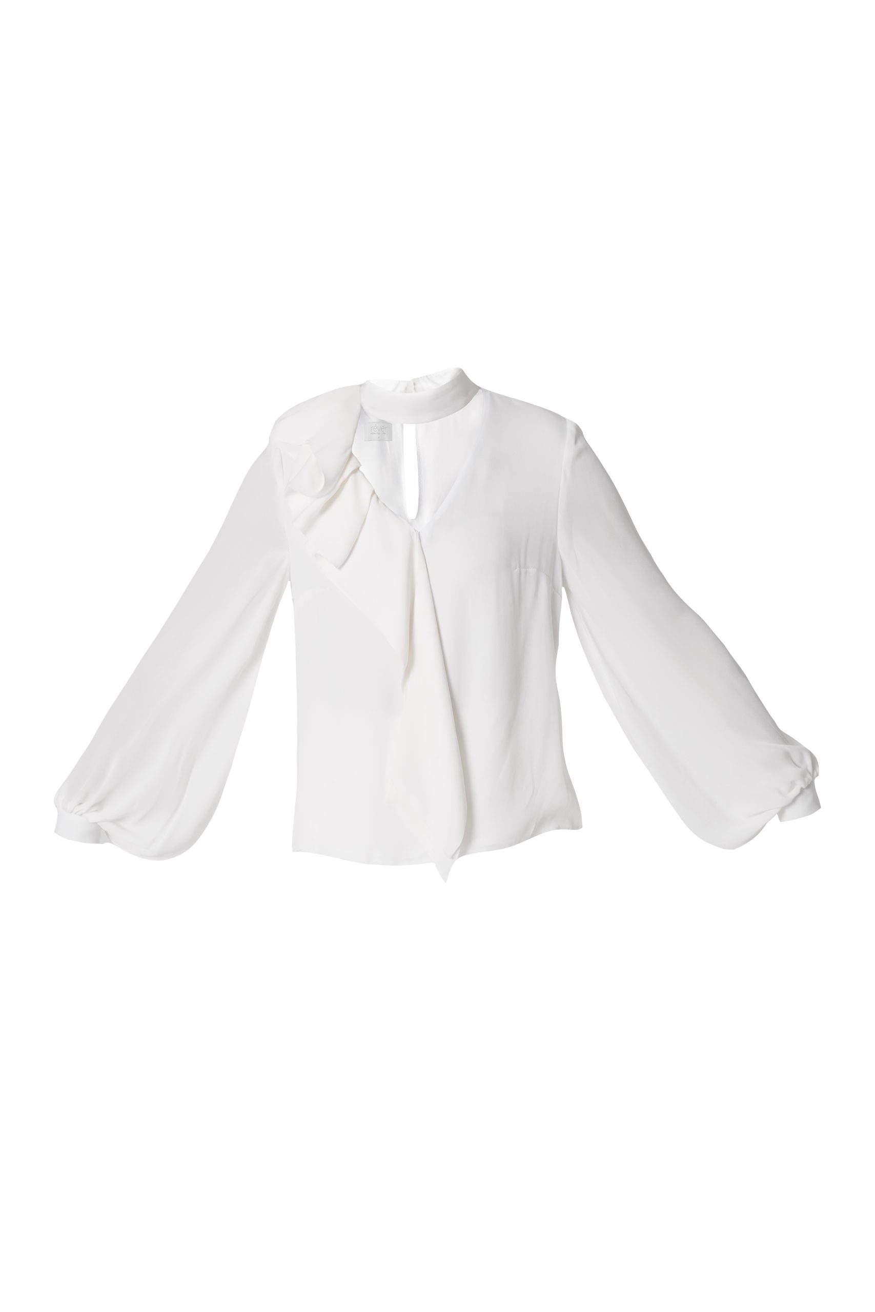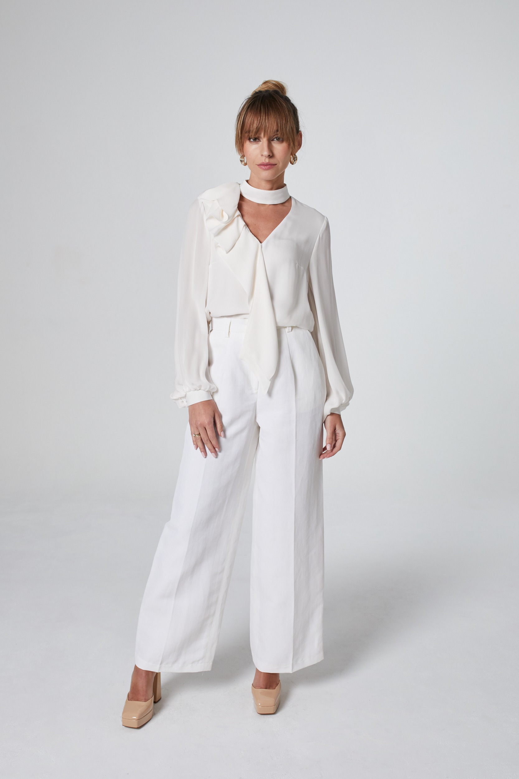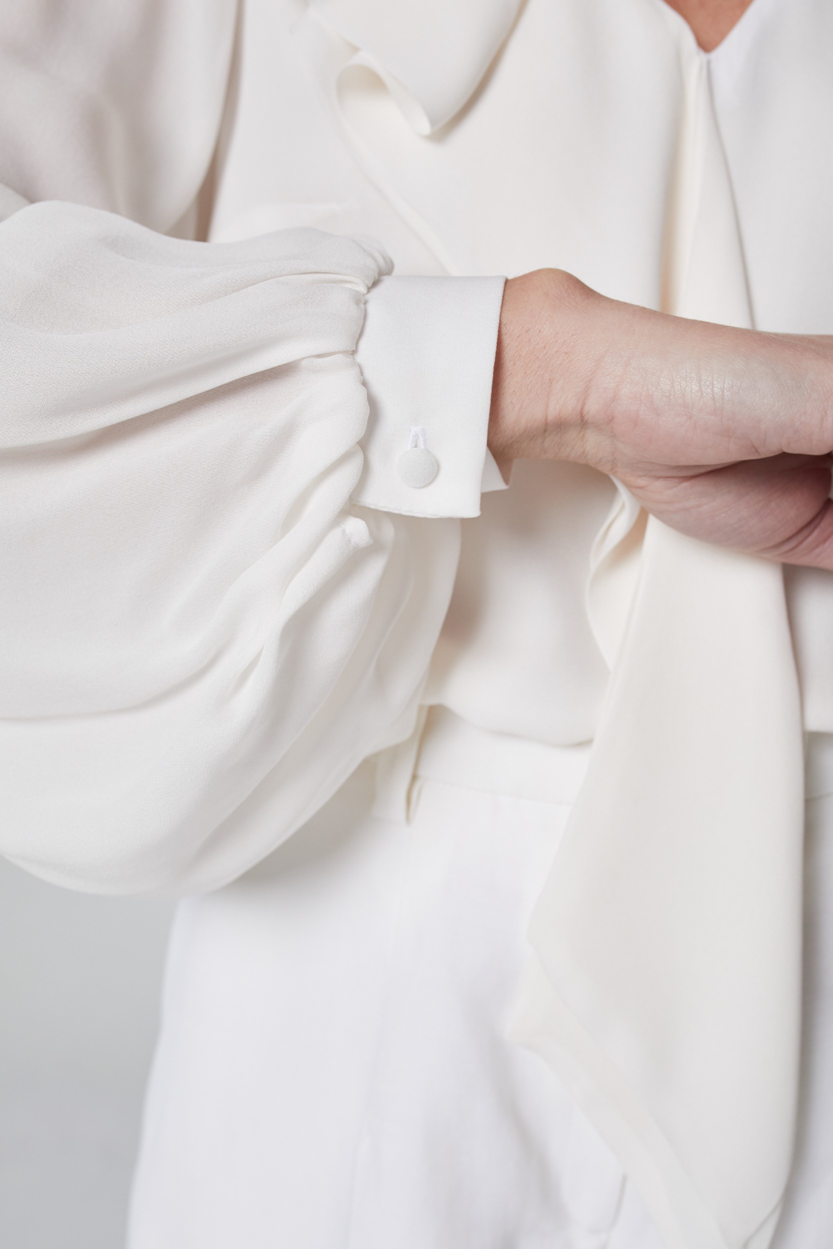 Bluzka o wyjątkowym kroju, uszyta z najwyższej jakości włoskiego jedwabiu. Uroku nadaje jej efektowna falbana oraz dekolt w literę V zakończony stójką wokół szyi. Wykonana z największą starannością i dbałością o każdy detal. Poszerzane rękawy zakończone mankietem i zapięciem na oblekane guziki. Model pozwoli stworzyć piękne, kobiece stylizacje. Doskonale wygląda zestawiona ze spodniami lub spódnicą.