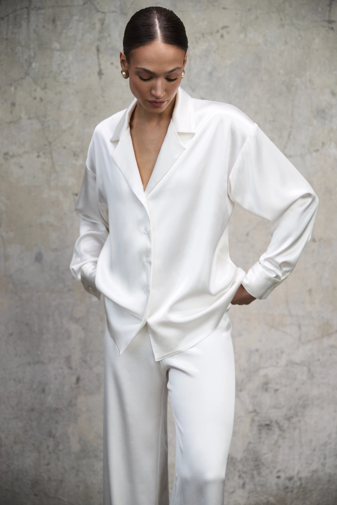 Satynowa koszula Aura w odcieniu perłowej bieli to minimalistyczny model o luźnym, prostym kroju. Obniżona linia ramion nadaje sylwetce miękkości, a wykładany kołnierz delikatnie eksponuje dekolt i podkreśla swobodny charakter formy.