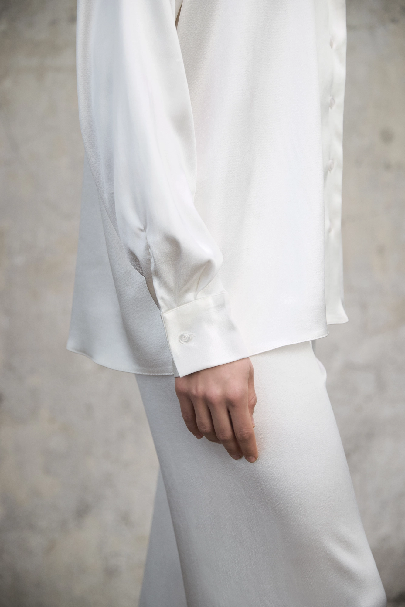 Wiskozowa tkanina z subtelnym połyskiem pięknie pracuje w ruchu i wydobywa szlachetność perłowej bieli. Długie rękawy zakończone mankietami równoważą swobodny krój, a logowane guziki stanowią dopracowany, dyskretny detal.
