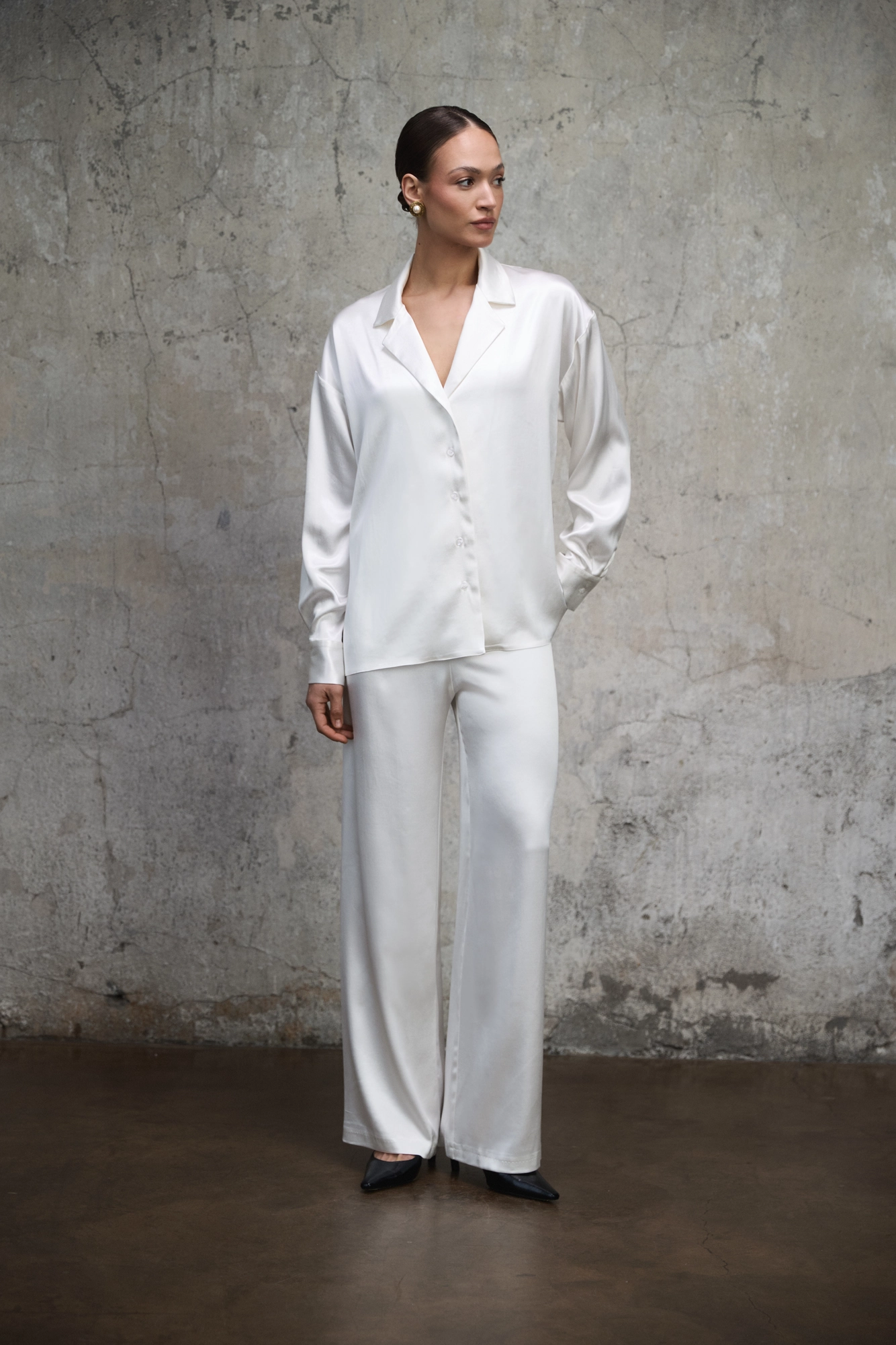 To koszula, która sprawdzi się zarówno w eleganckich stylizacjach, jak i w bardziej codziennym wydaniu – noszona luźno lub w komplecie ze spodniami Aura, tworząc spójny, monochromatyczny zestaw.