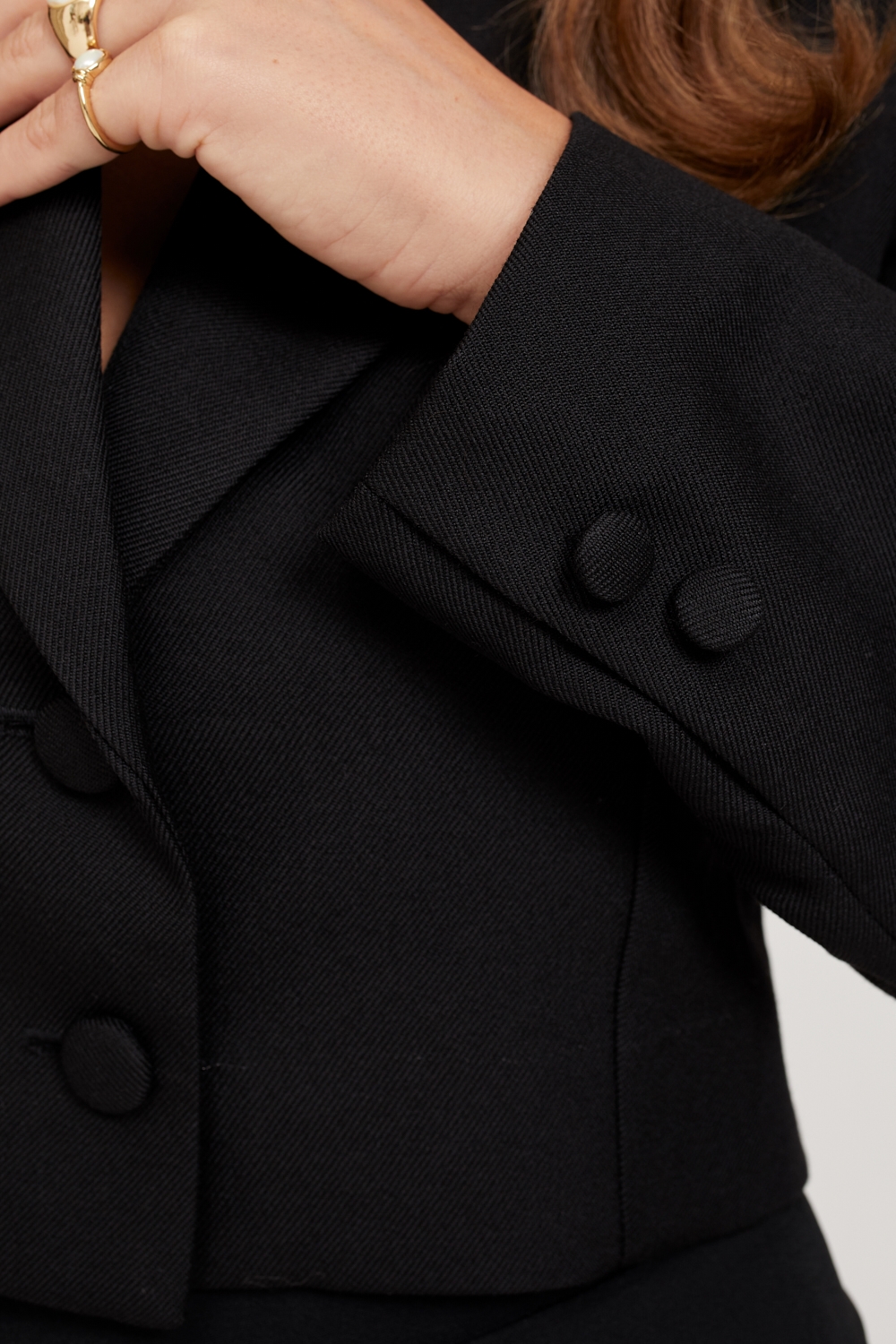 Czarna krótka marynarka Havana o taliowanym fasonie z jednorzędowym zapięciem, uszyta z mieszanki wiskozy. Jej krój idealnie podkreśla sylwetkę. Fason jest zapinany na dwa oblekane guziki, które zdobią również rękawy, posiada praktyczne kieszenie z przodu i jest wykończony komfortową podszewką ze 100% wiskozy. To model, który sprawdzi się w wielu sytuacjach – idealny do pracy, na eleganckie okazje lub na co dzień.