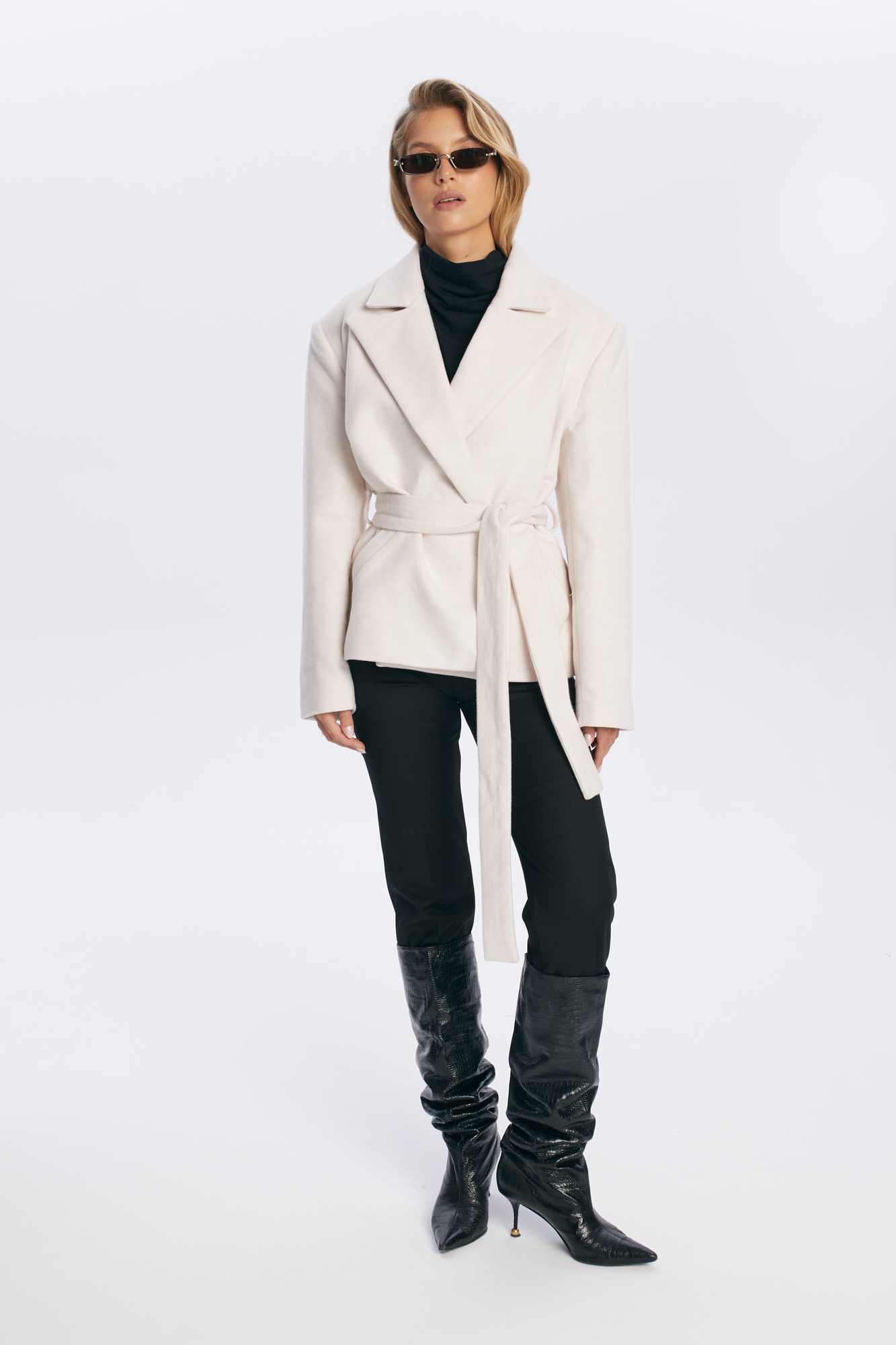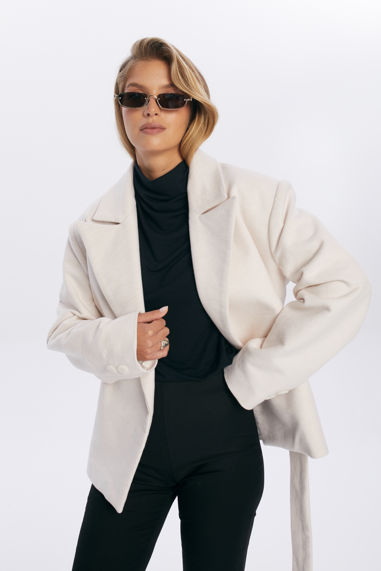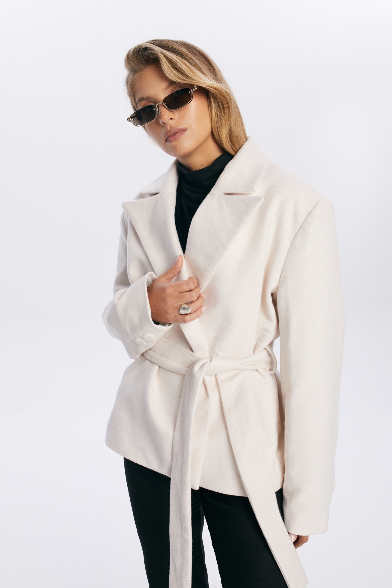 Jasnobeżowa kurtka Aspen o luźnym fasonie z zaznaczoną linią ramion, uszyta w 100% z bawełny. Jej fason nadaje proporcji sylwetce i nawiązuje do aktualnych trendów. Brak klasycznego zapięcia pozwala na swobodne dopasowanie, a wiązanie w pasie podkreśla talię. Kurtka posiada praktyczne kieszenie z przodu, ozdobne guziki na rękawach i jest wykończona wiskozową podszewką z lamowaniem. To model, który idealnie sprawdzi się na co dzień, zarówno w casualowych, jak i bardziej eleganckich stylizacjach.