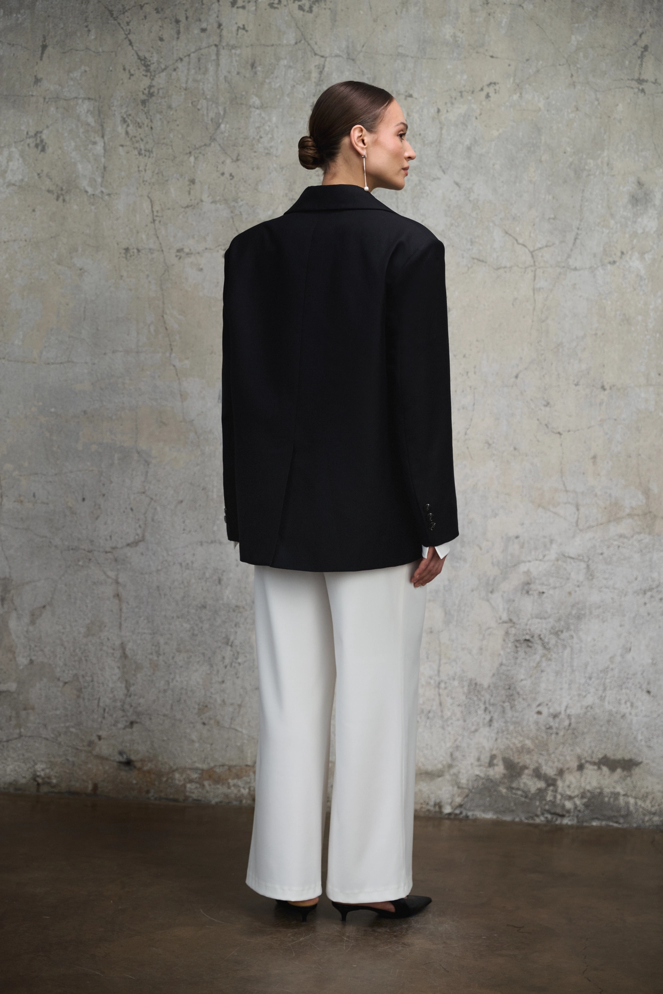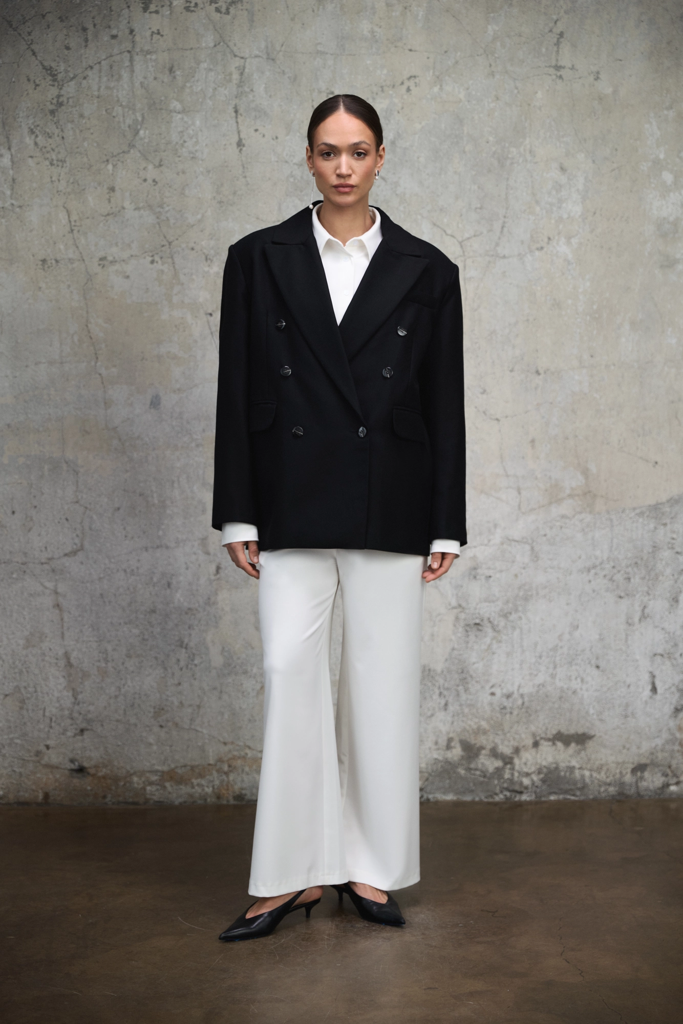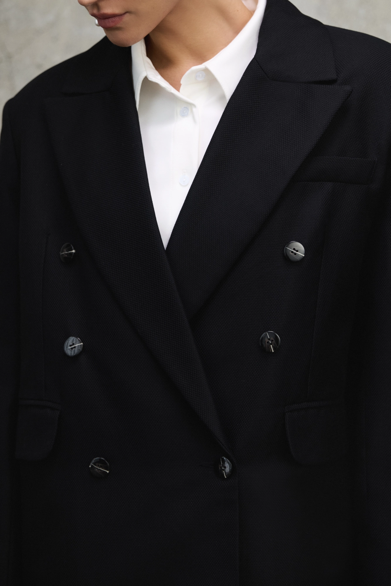 Czarna marynarka o pudełkowym, oversizowym fasonie z wyraźnie zaznaczoną linią ramion. Dwurzędowy krój nadaje jej zdecydowane proporcje, a czysta forma podkreśla charakter klasycznego krawiectwa.