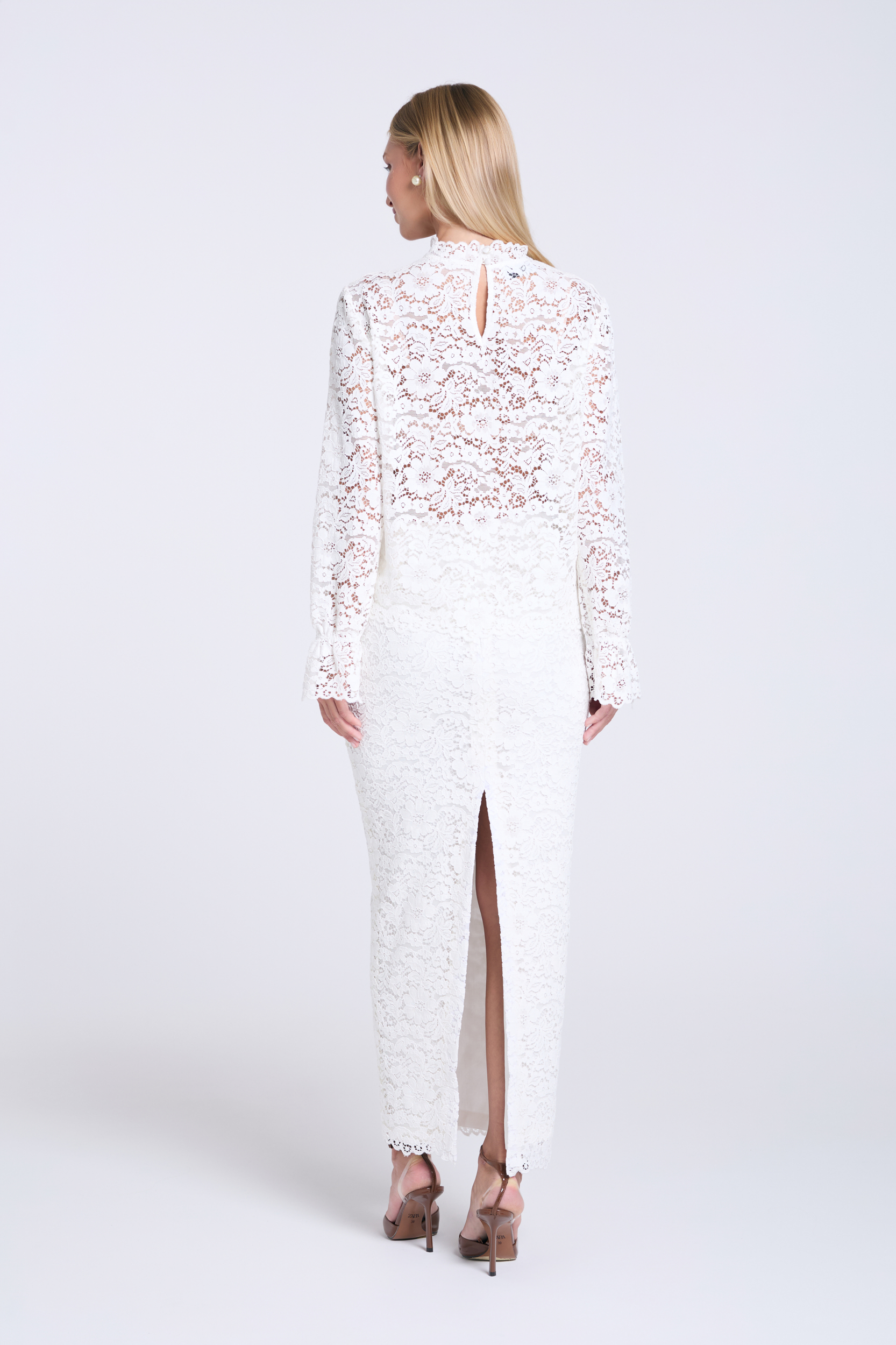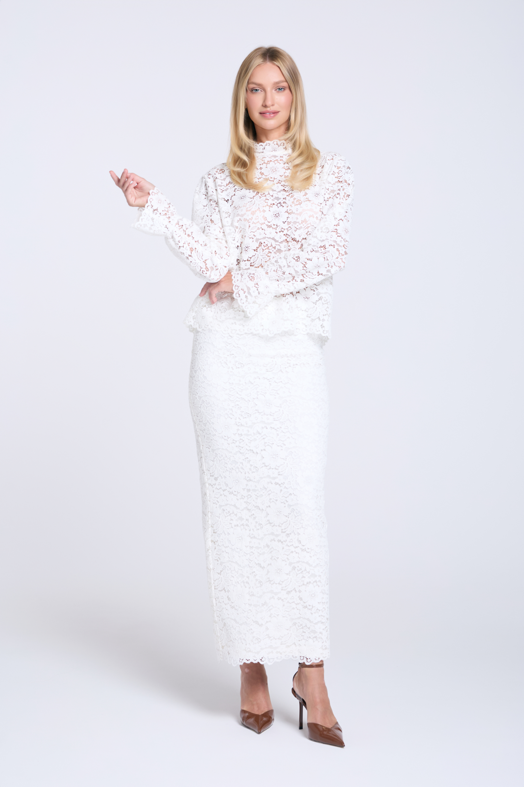 Długa koronkowa spódnica w odcieniu off-white, o dopasowanym kroju z wysokim stanem, uszyta z mieszanki bawełny i poliestru. Jej fason z subtelnie zwężającą się ku dołowi linią podkreśla sylwetkę, a komfort noszenia zapewnia wiskozowa podszewka. Wykończenie w pasie elegancką lamówką oraz rozcięcie z tyłu nadają całości wyrafinowanego charakteru i swobody ruchów. To model, który świetnie sprawdzi się w wielu stylizacjach – od codziennych looków z t-shirtem, po eleganckie zestawy na specjalne okazje.