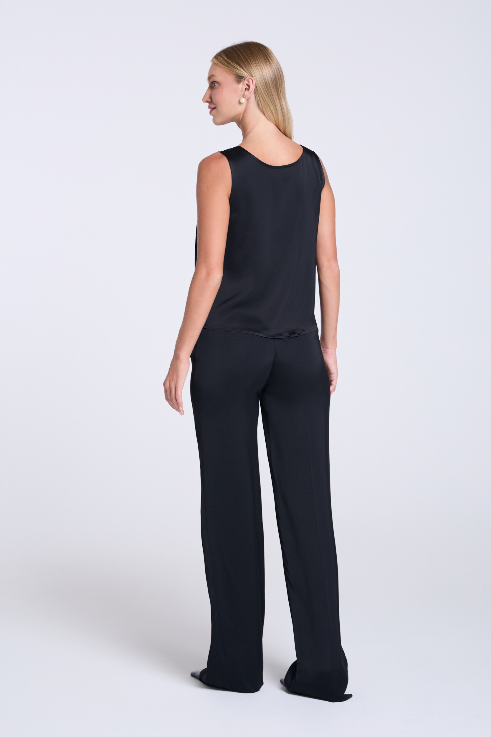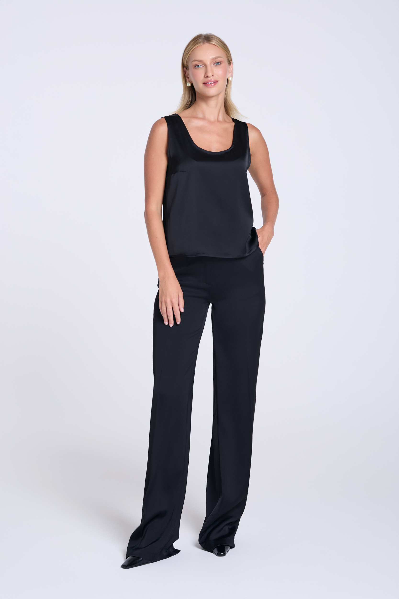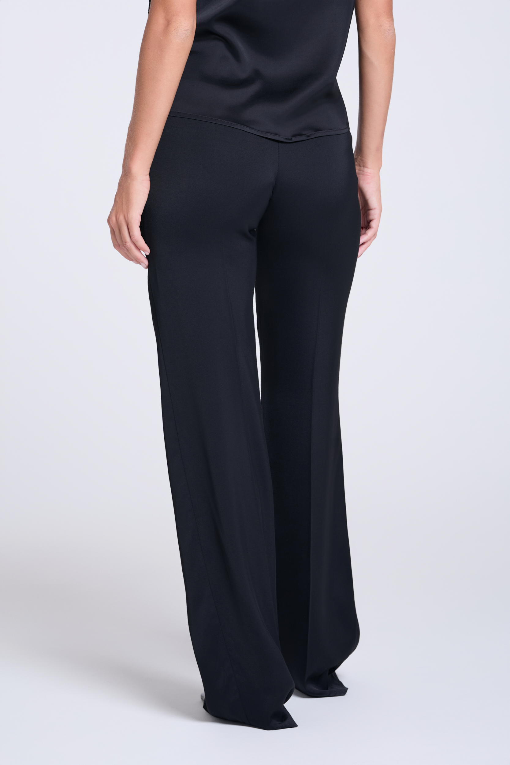 spodnie garniturowe z wysokim stanem, uszyte z mięsistej, lejącej mieszanki wiskozy. Ich prosta, lekko