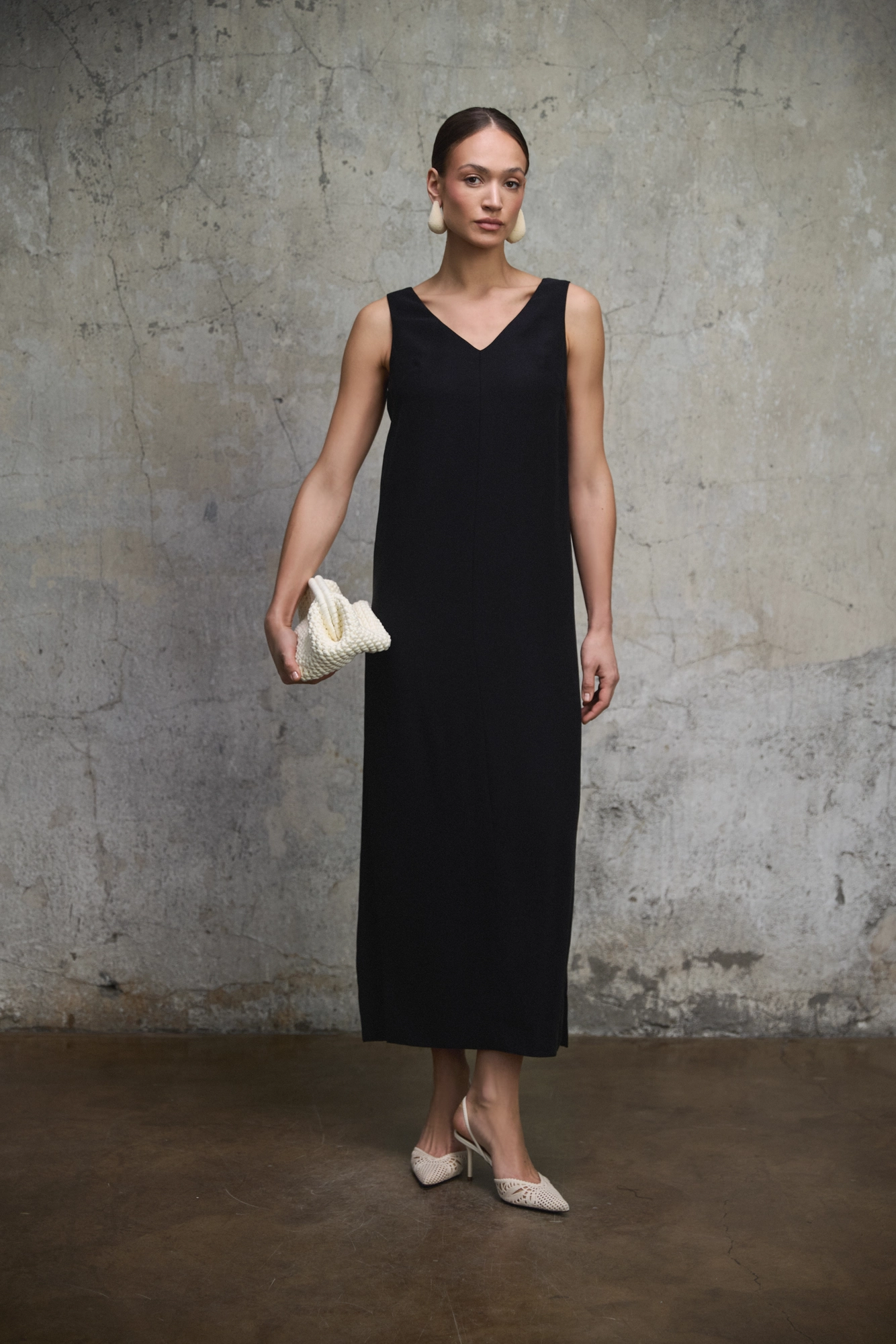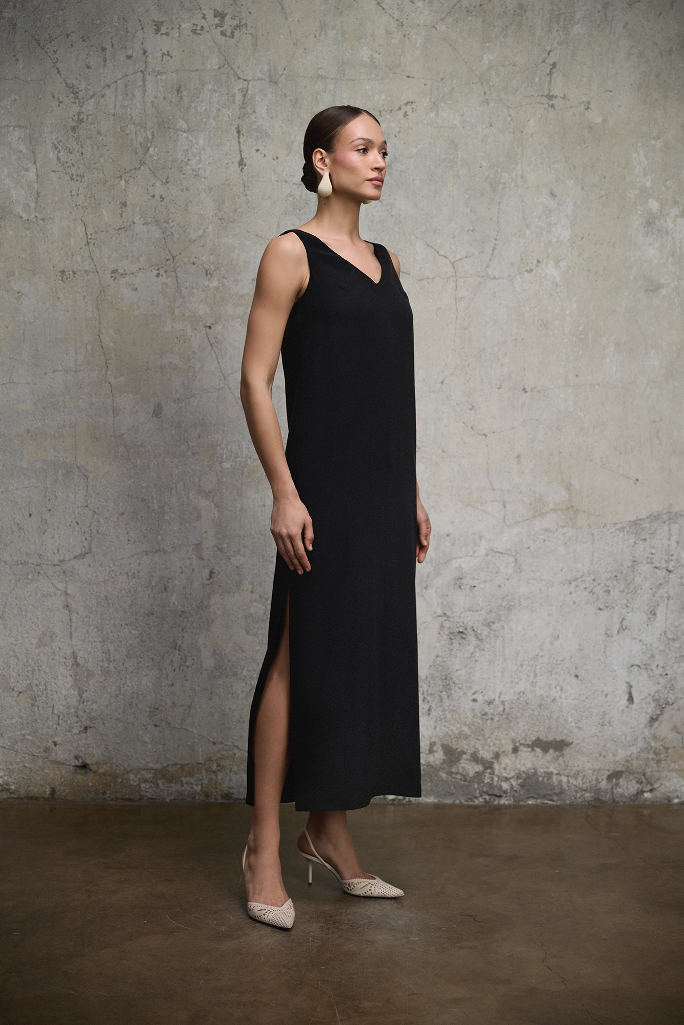 Długa, czarna sukienka o prostej, swobodnej linii i minimalistycznym charakterze. Oszczędna forma opiera się na czystości kroju i sile koloru. Szerokie ramiączka oraz dekolt w kształcie litery V tworzą spokojną, wyrazistą sylwetkę. Luźny fason miękko opada wzdłuż ciała, a boczne rozcięcia wprowadzają lekkość i naturalną swobodę ruchu.