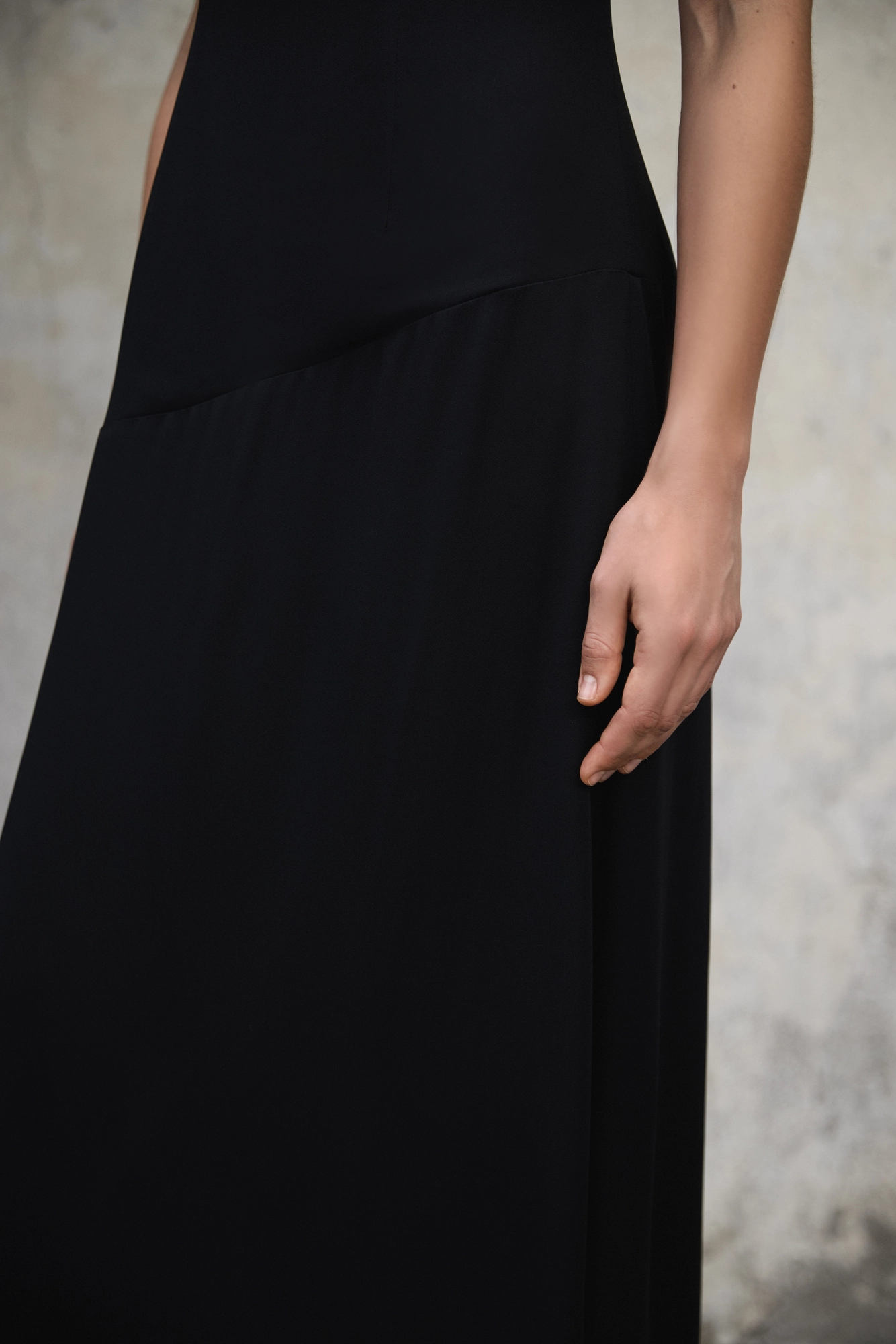 Model uszyty jest z lejącej żorżety wiskozowej, która miękko opływa sylwetkę. Wnętrze wykończone wiskozową podszewką zapewnia komfort noszenia. To propozycja na uroczystości i wieczorne wyjścia — elegancka, ale niewymuszona.