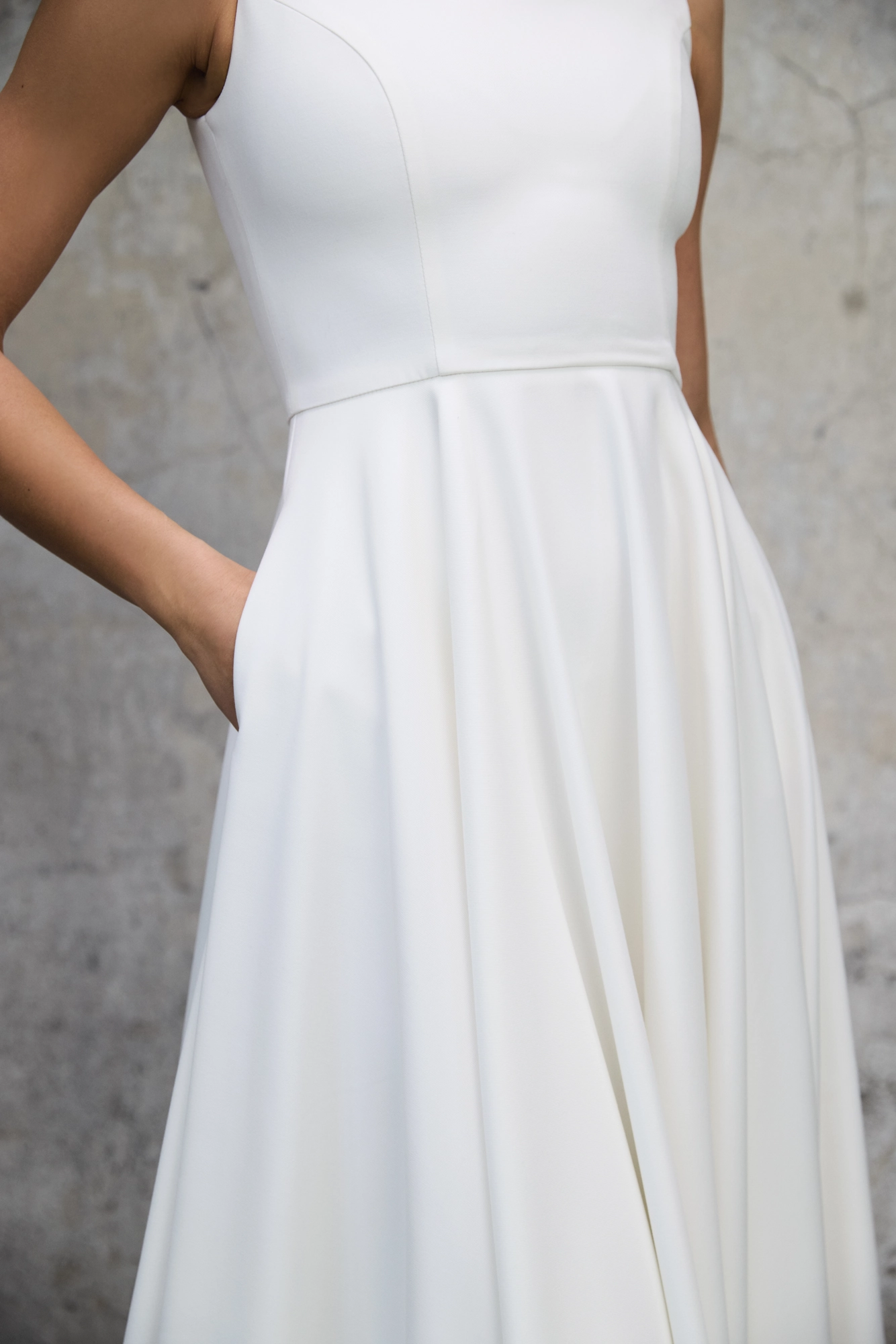 Uszyta z wysokiej jakości wiskozy, przyjemnej w dotyku i komfortowej w noszeniu. Tkanina zachowuje formę, a jednocześnie naturalnie układa się na ciele. Z tyłu zapinana na kryty zamek. W bocznych szwach dyskretnie ukryto kieszenie, które dodają funkcjonalności, nie zaburzając czystości kroju.