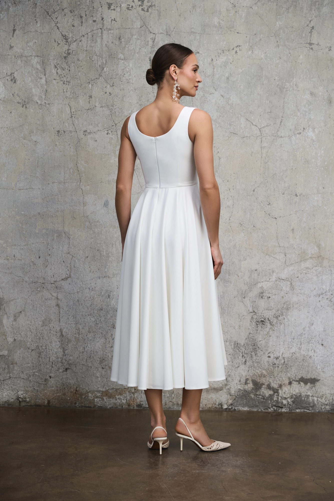 Sukienka Kate w odcieniu śmietankowej bieli łączy dopracowaną konstrukcję z miękkością formy, tworząc wyważoną i niezwykle kobiecą sylwetkę.
