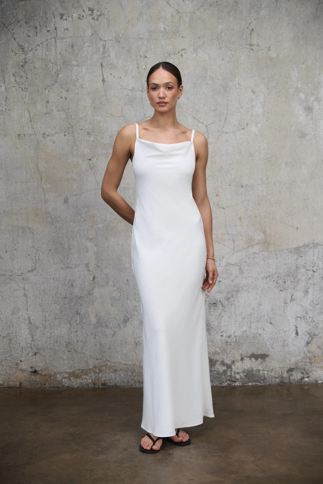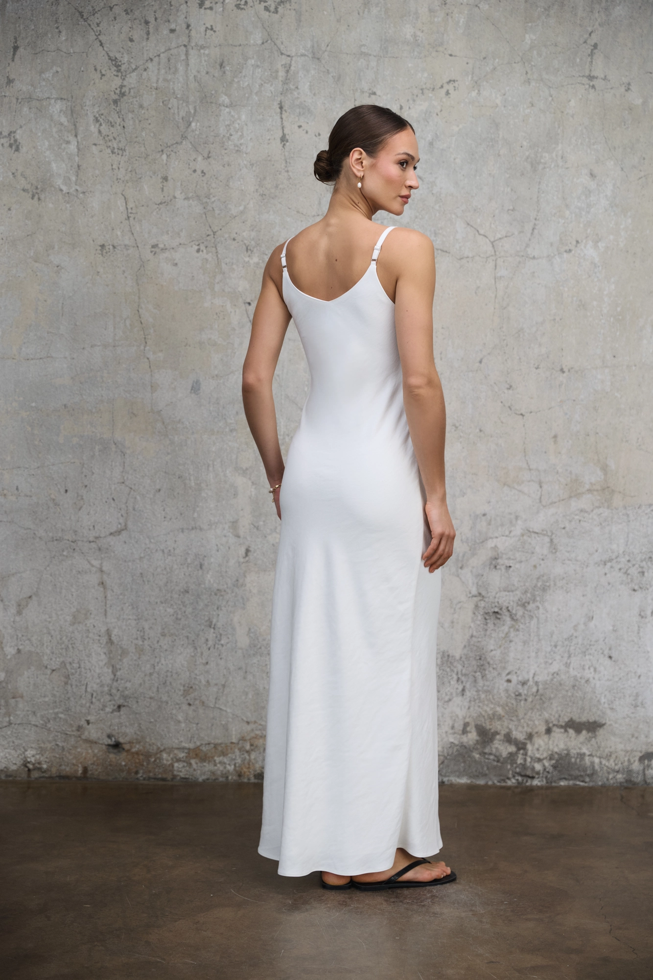 Sukienka Lia w kolorze bieli przywołuje minimalistyczną estetykę slip dress inspirowaną latami 90. Smukła, wydłużona linia i oszczędność detalu nadają jej spokojny, nowoczesny charakter.