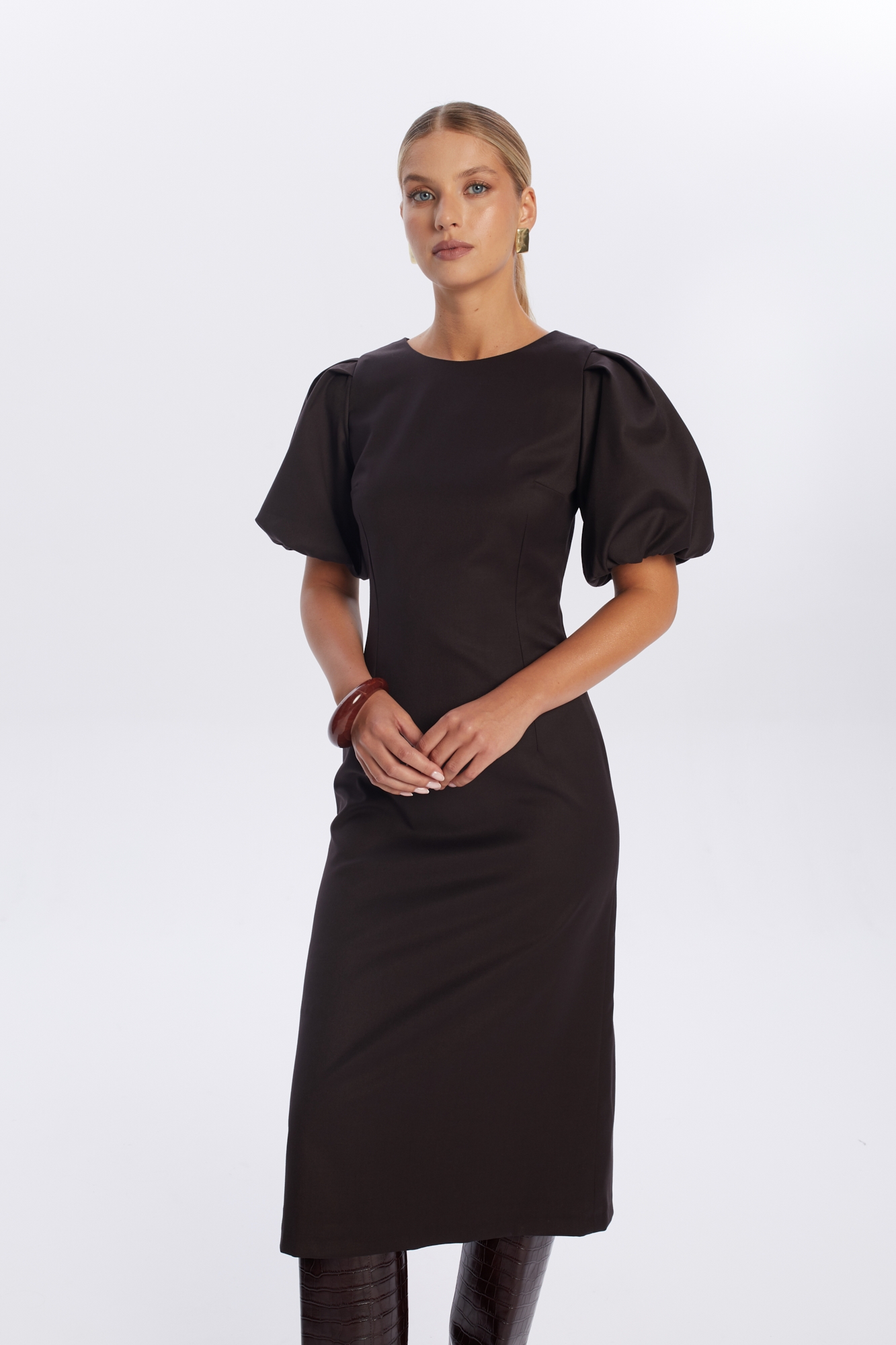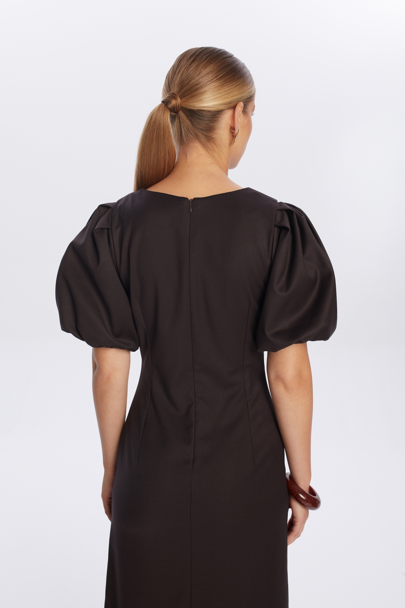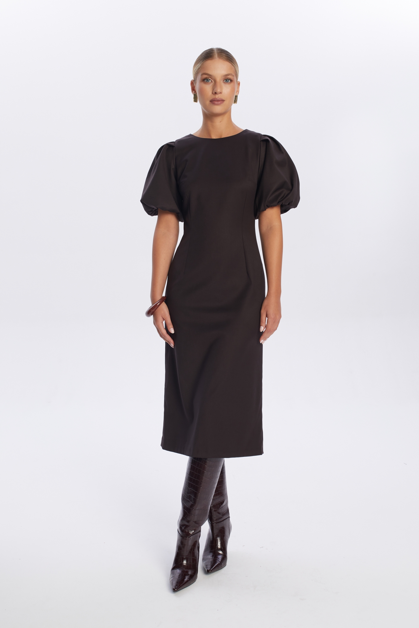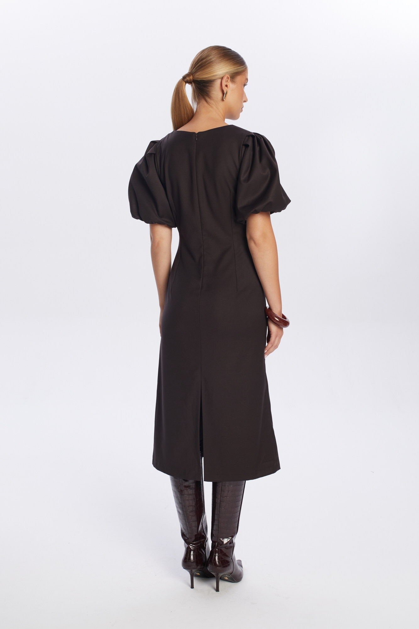 Ciemnoczekoladowa sukienka midi Loren, uszyta z mieszanki wiskozy. To propozycja dla kobiet ceniących klasyczny, kobiecy styl: jej dopasowana góra z zaszewkami podkreśla sylwetkę, a lekko rozkloszowany dół z rozcięciem z tyłu pięknie układa się w ruchu. Całość dopełniają efektowne bufiaste rękawy i klasyczny okrągły dekolt. To doskonały wybór na formalne spotkanie, wesele lub rodzinne wydarzenie.