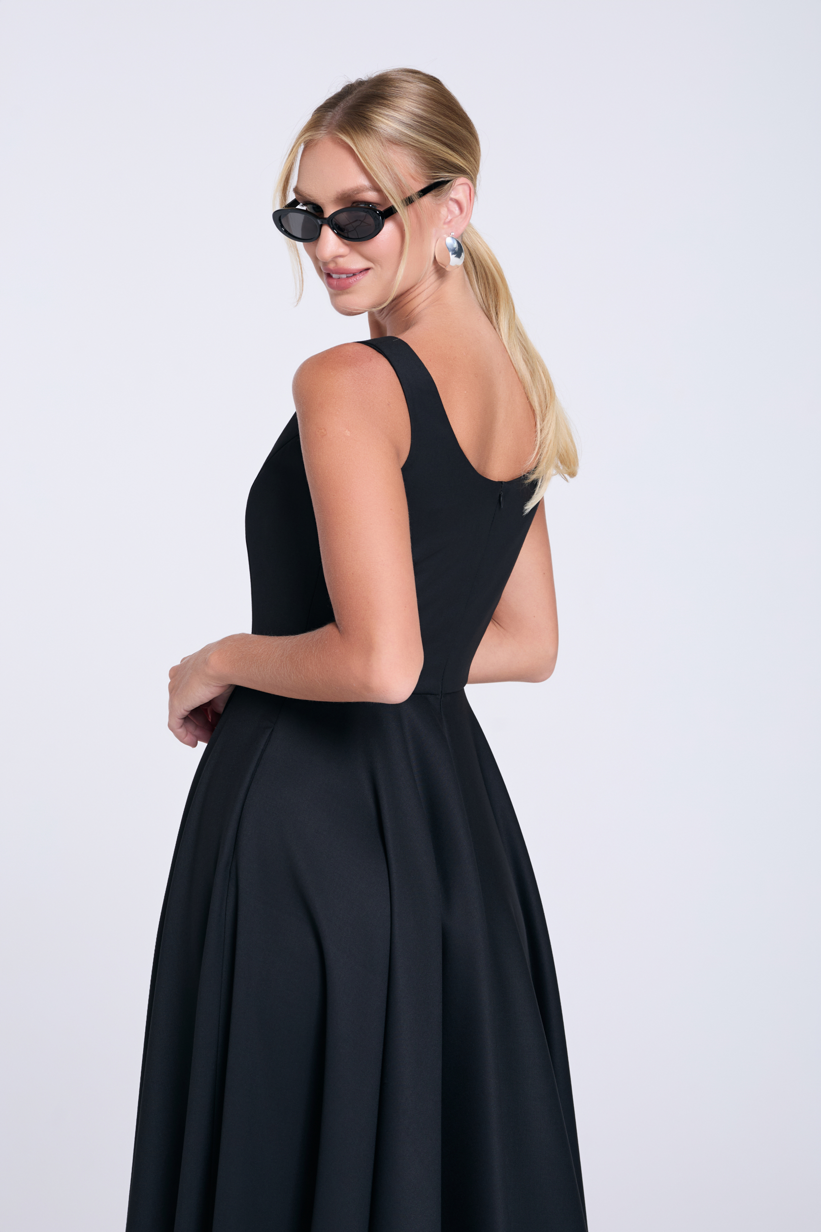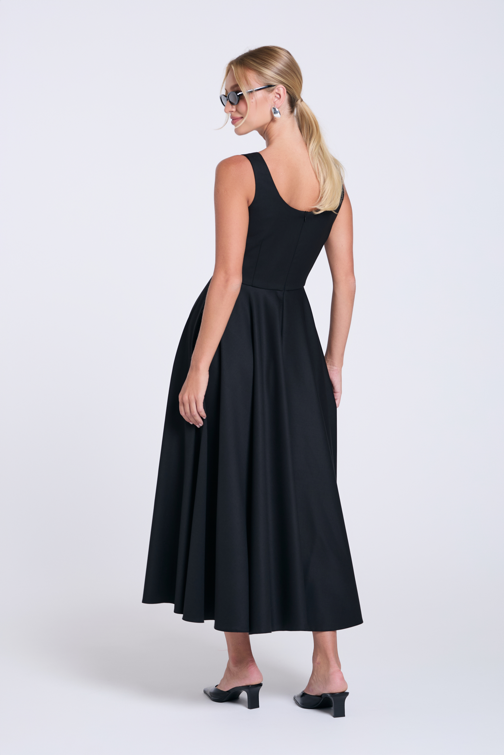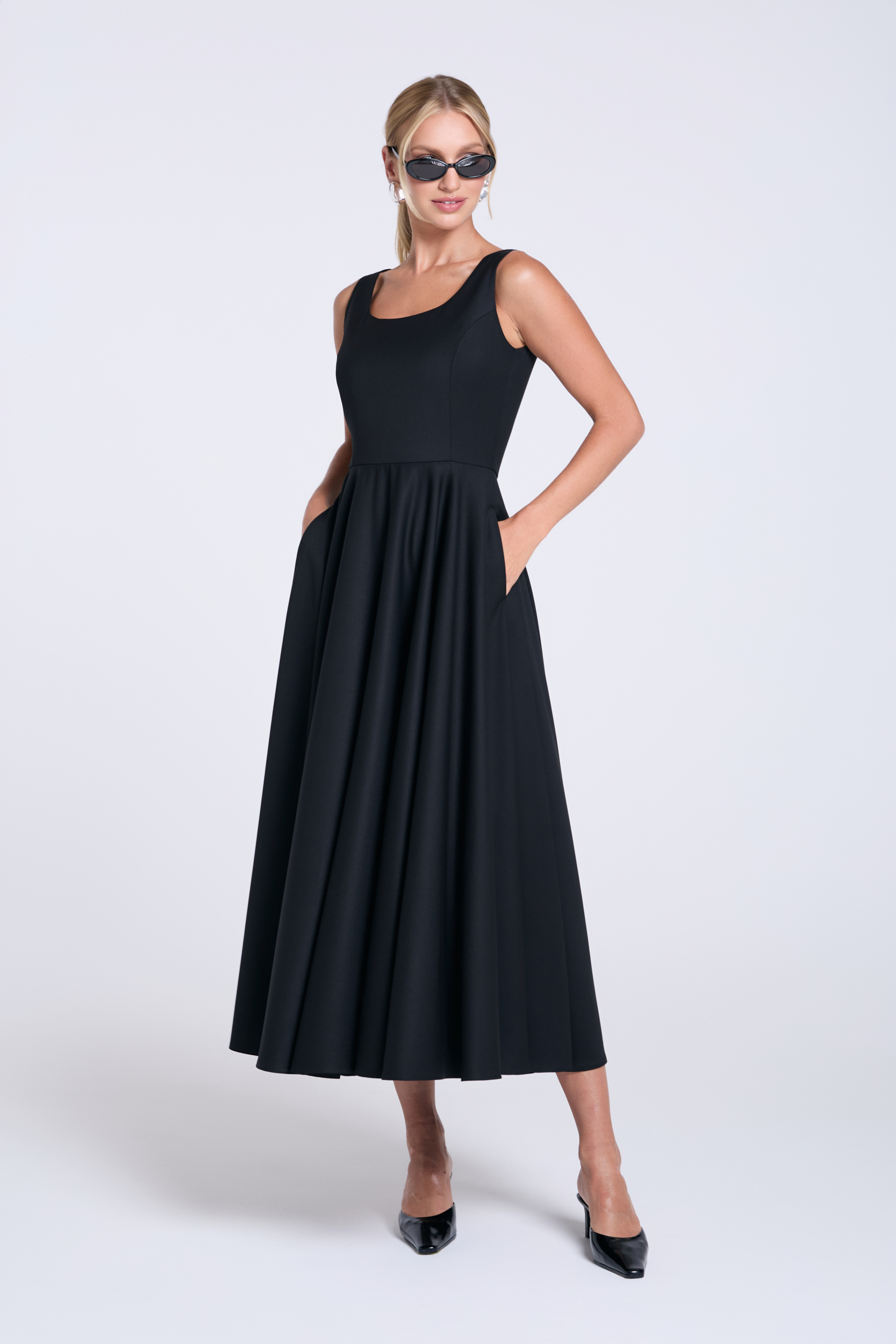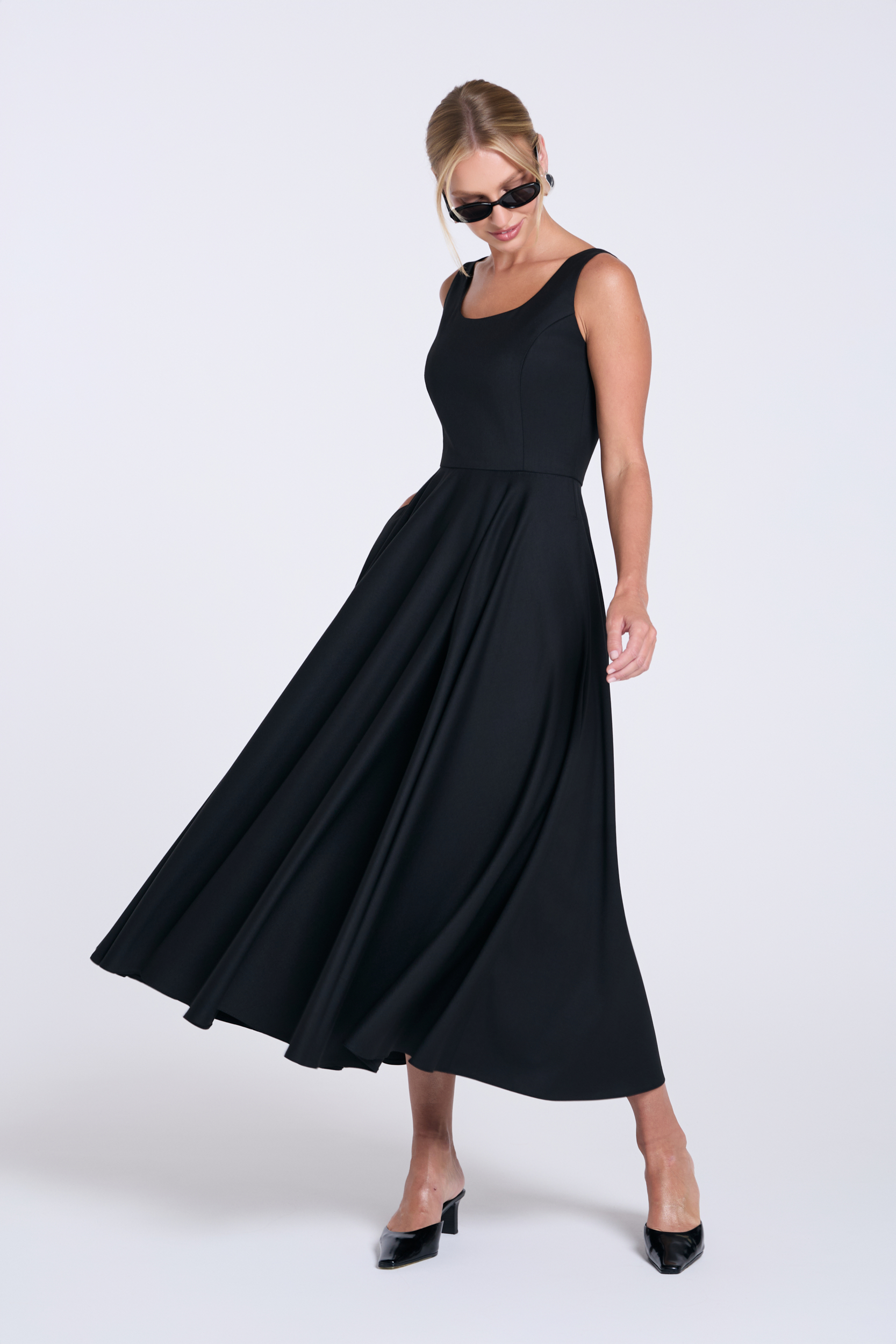 Fason: długość midi, dopasowana góra, odcinana w talii, szeroki dół skrojony z koła