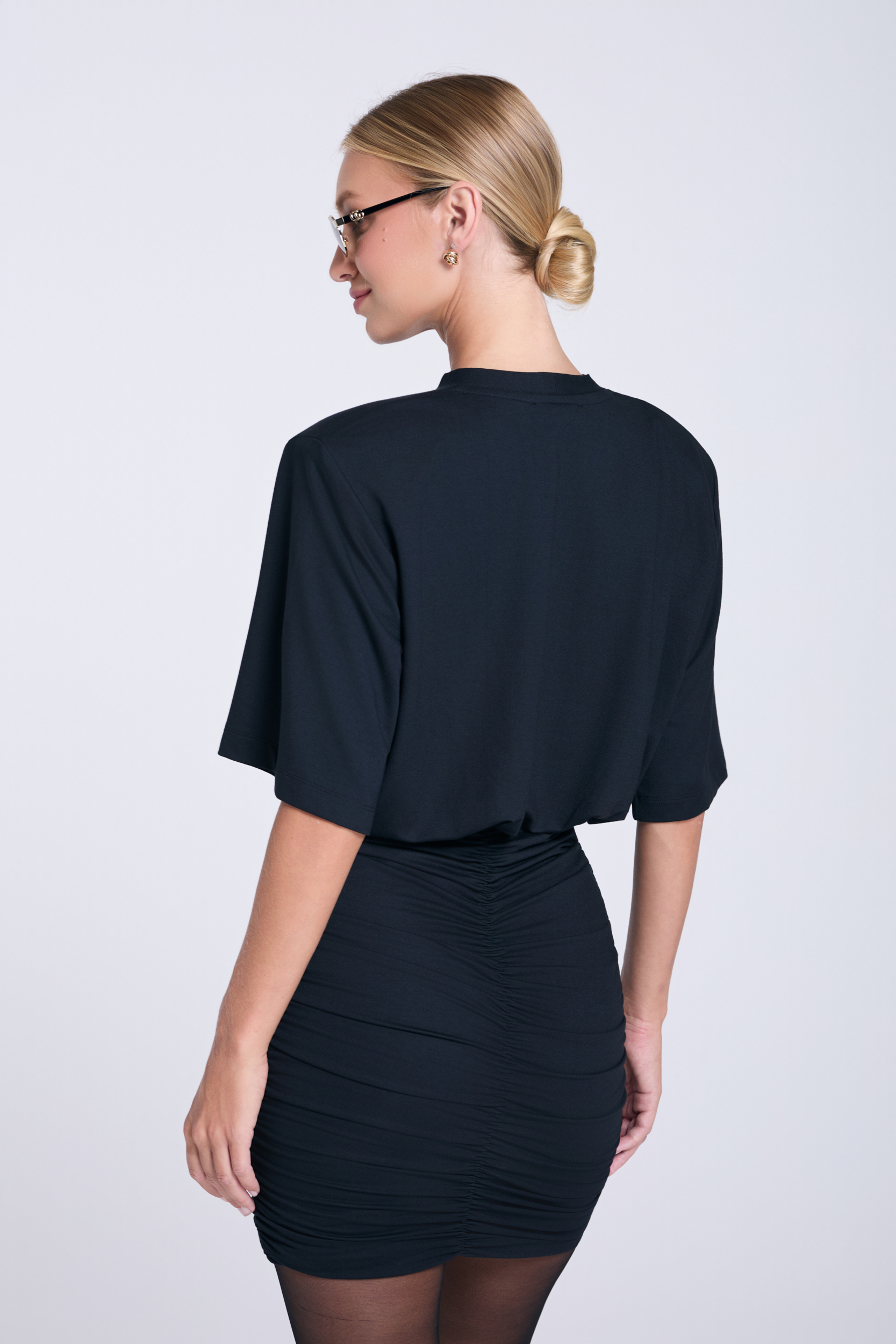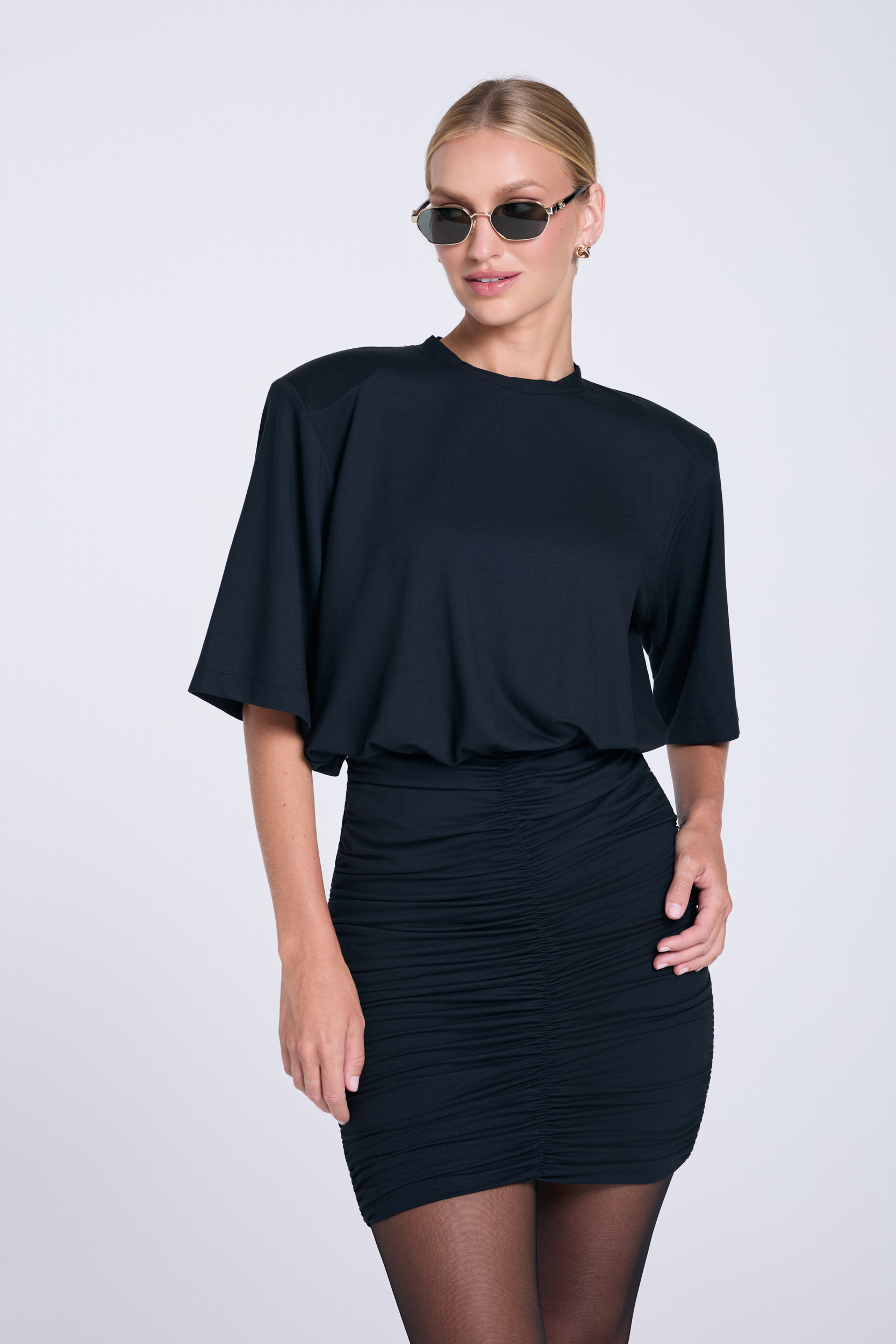Czarna sukienka mini Agnes, uszyta z miękkiego, komfortowego mikromodalu. Jej dopracowany krój łączy luźną górę z poduszkami na ramionach i rękawem do łokcia oraz kontrastujący, dopasowany dół z marszczeniem, który podkreśla linię bioder. To idealny wybór na wieczorne wyjścia, imprezę lub mniej formalne spotkania, kiedy chcesz wyglądać efektownie, ale z nutą nonszalancji.