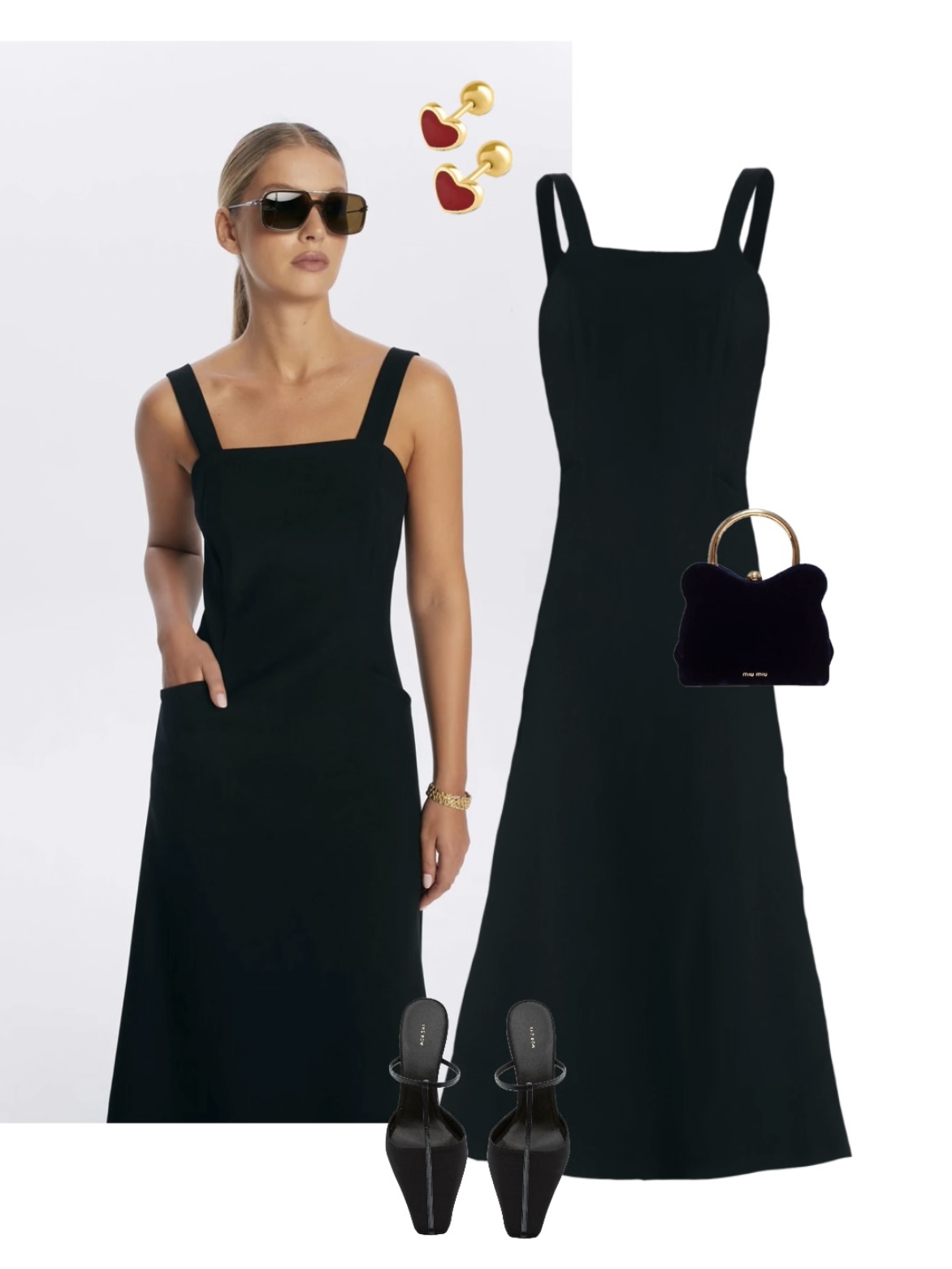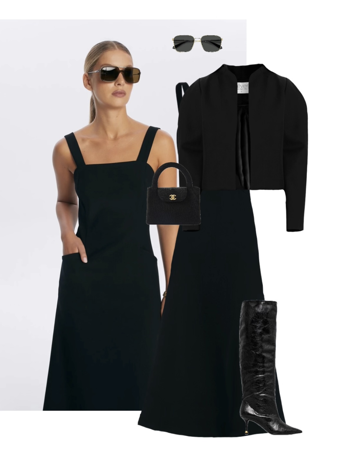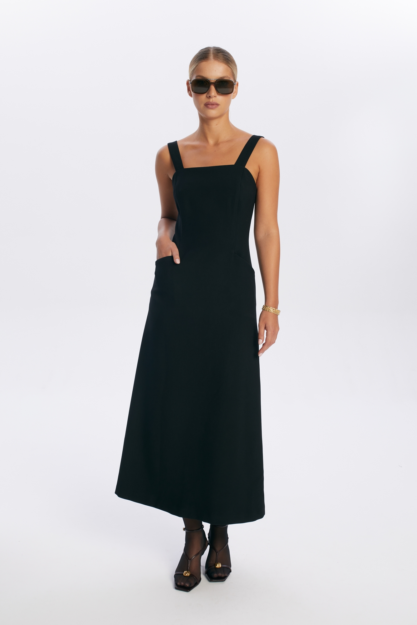 Czarna długa sukienka Ingrid o lekko rozkloszowanym kroju, uszyta z mięsistej mieszanki wiskozy. Jest to model na szerokich ramiączkach, który wyróżnia prosty dekolt karo oraz praktyczne kieszenie z przodu. Fason w kształcie trapezu dodaje jej kobiecego charakteru, a elastyczna tkanina zapewnia idealne dopasowanie. To uniwersalny model, który można wykorzystać na co dzień lub na eleganckie wyjścia.