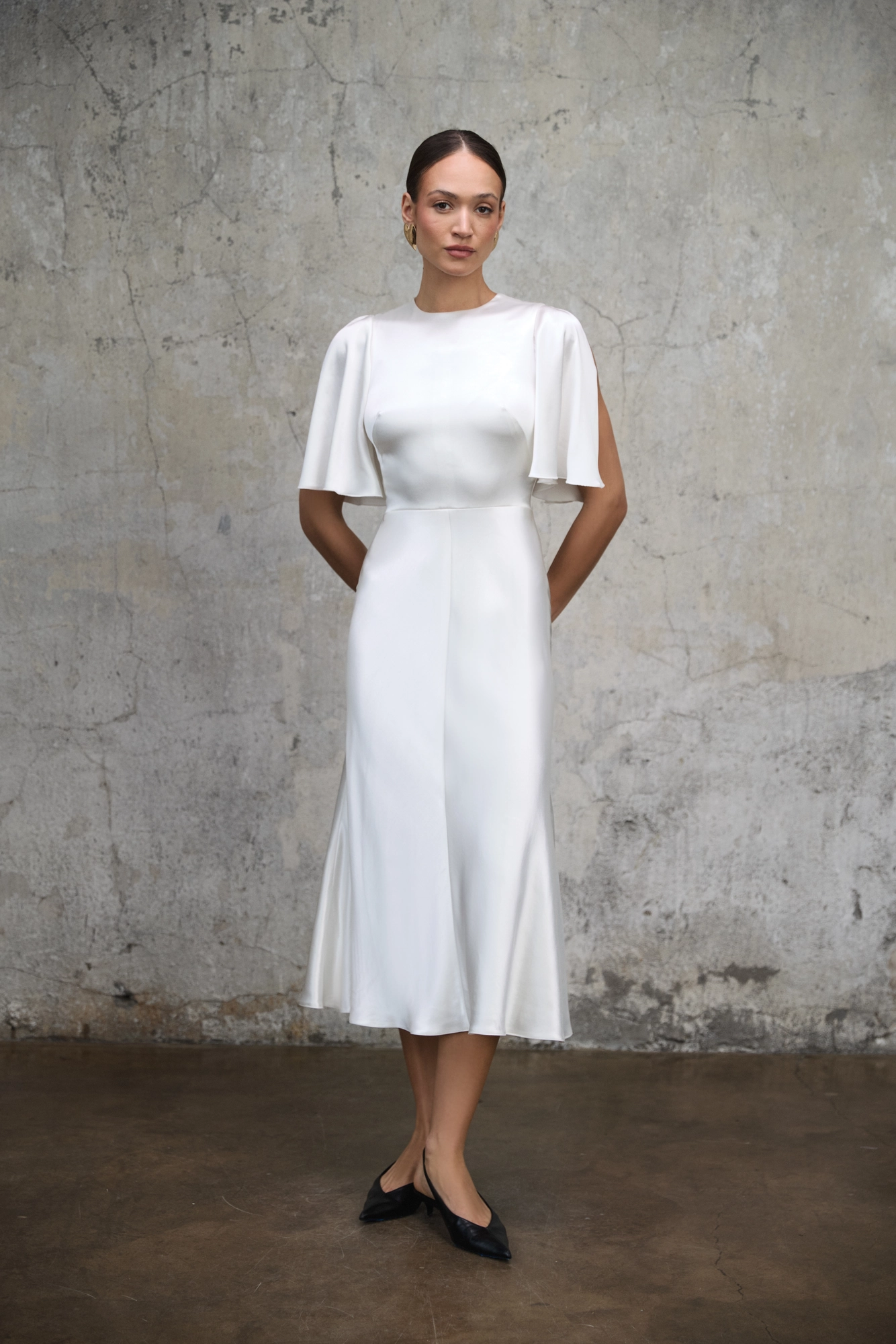 Uszyta z wysokiej jakości satynowej wiskozy o gładkiej, szlachetnej powierzchni, subtelnie odbija światło i miękko układa się na ciele. Odcięcie poniżej linii talii modeluje proporcje. Dół precyzyjnie skrojony ze skosu pozwala tkaninie naturalnie dopasować się do sylwetki, nadając jej płynność i lekkość w ruchu. Okrągły dekolt utrzymuje minimalistyczny ton, a zwiewne rękawy z rozcięciem wprowadzają architektoniczny detal. Z tyłu zapinana na kryty zamek.