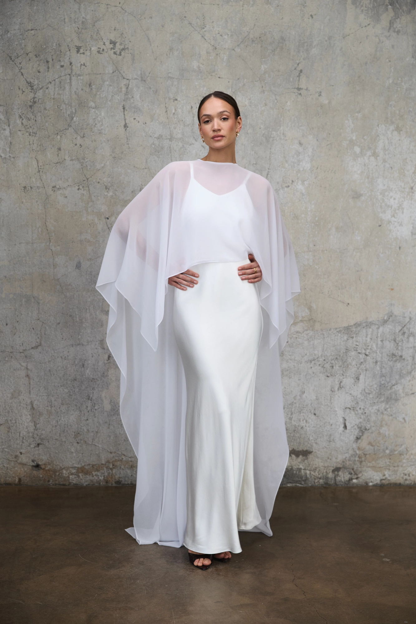 Perłowa biel podkreśla czystość kroju i sprawia, że model zyskuje wyjątkowo świeży, wyrafinowany charakter. Ivy może pełnić rolę nowoczesnej sukni ślubnej, eleganckiej bazy pod transparentną pelerynę, a w zestawieniu z prostymi klapkami nabiera swobodnego, letniego charakteru.