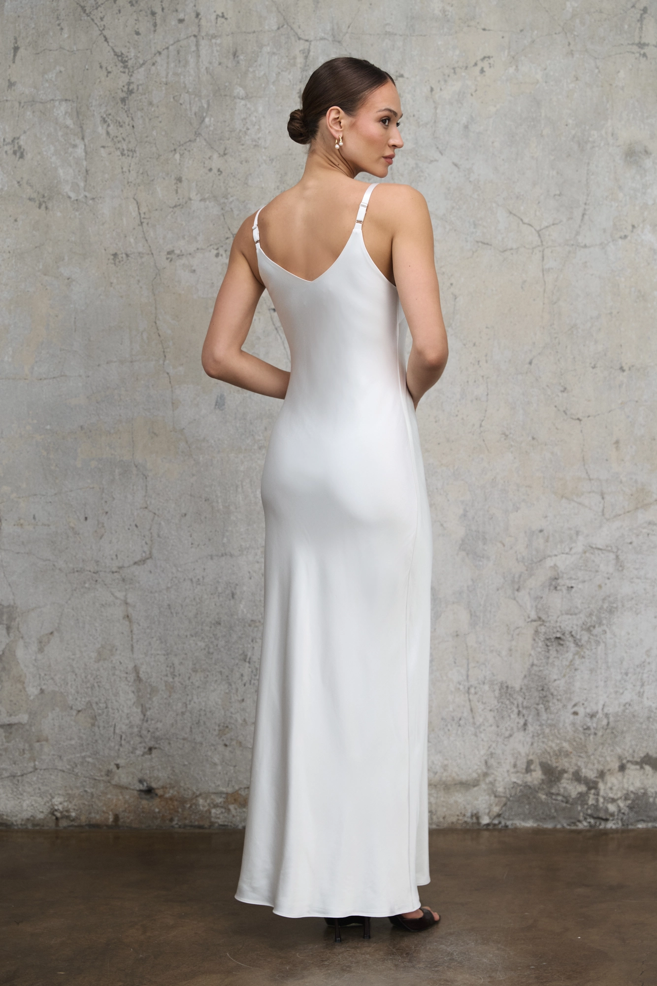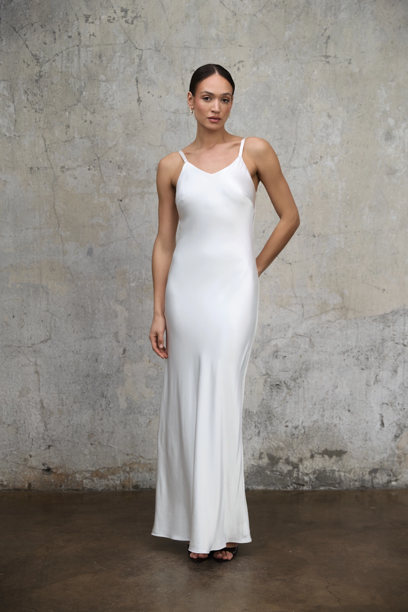 Długa satynowa sukienka Ivy w odcieniu perłowej bieli to nowoczesna interpretacja kultowej slip dress inspirowanej estetyką lat 90. Minimalistyczna, zmysłowa w swojej prostocie, opiera się na czystej linii i szlachetnej pracy tkaniny.