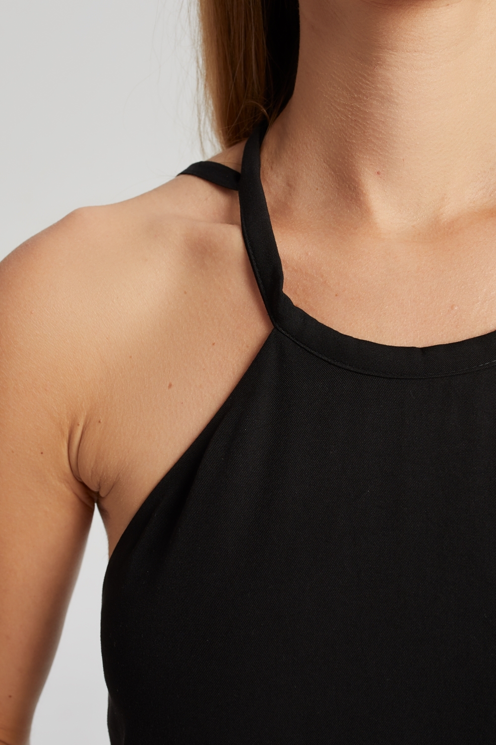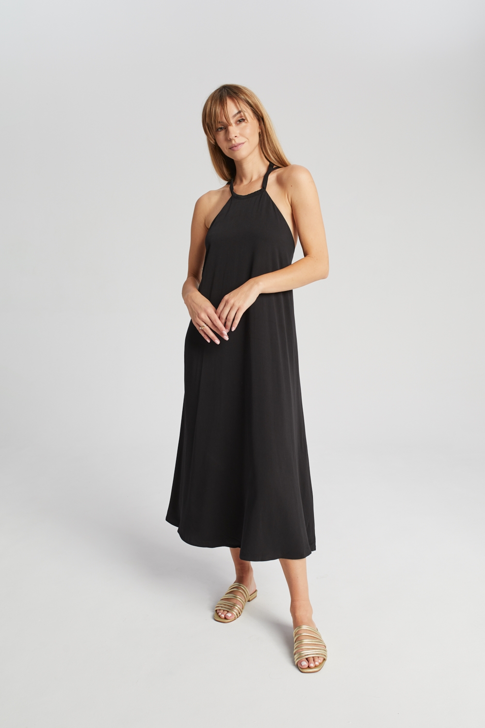 Czarna sukienka Selena przykuwa uwagę efektownie wyeksponowanymi plecami. Uszyta została z lekkiej, przewiewnej wiskozy, co zapewnia uczucie komfortu nawet w gorące dni. Fason o długości midi z rozkloszowanym dołem gwarantuje swobodę noszenia. Wiązanie na szyi umożliwia indywidualne dostosowanie długości sukienki. Model Selena doskonale sprawdzi się latem. Świetnie wygląda zarówno z płaskimi klapkami, jak również w wersji bardziej eleganckiej z sandałkami na szpilce. Ta niezwykle zwiewna i delikatna sukienka o romantycznym charakterze to niezbędny element wakacyjnej garderoby.