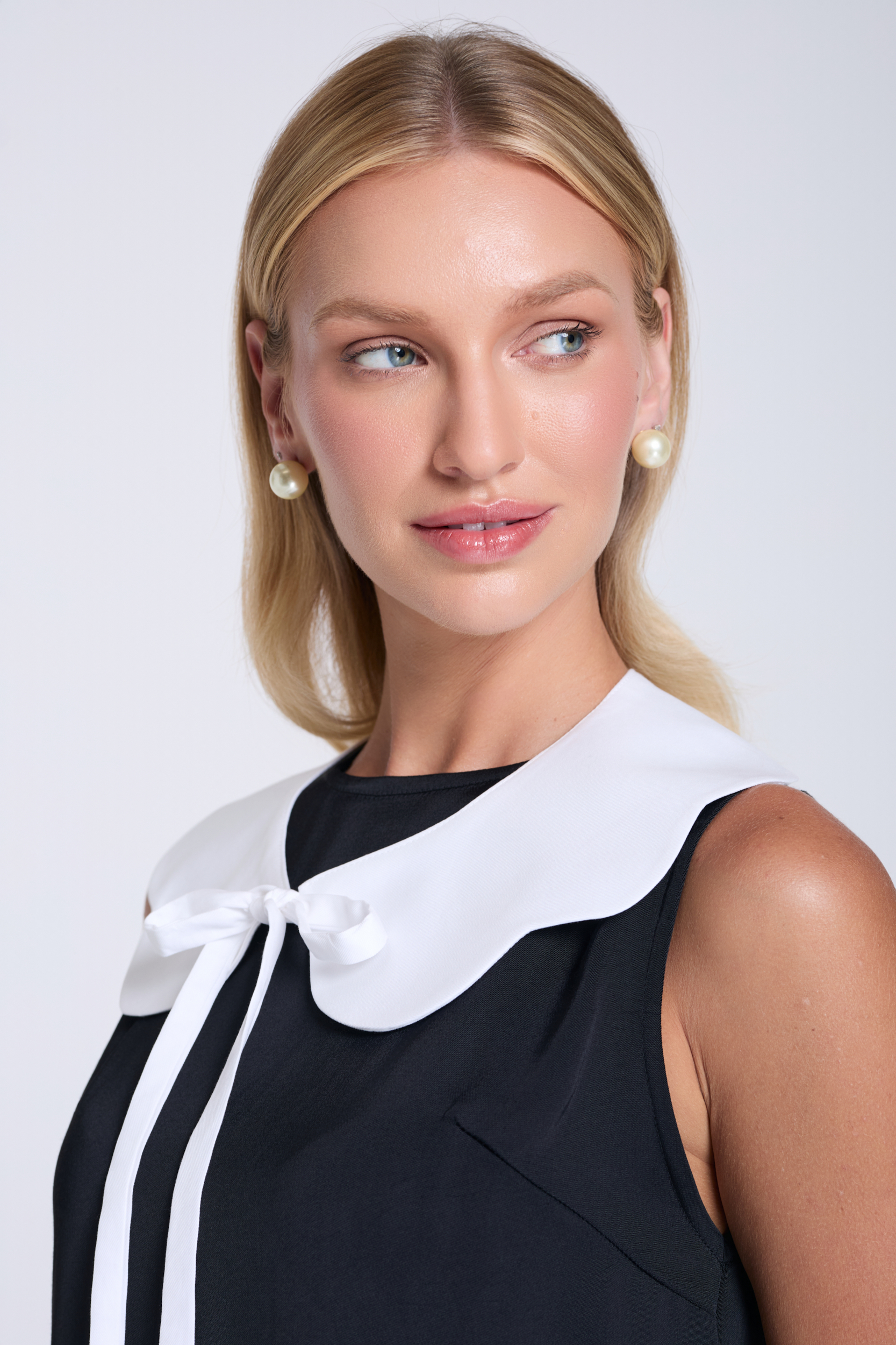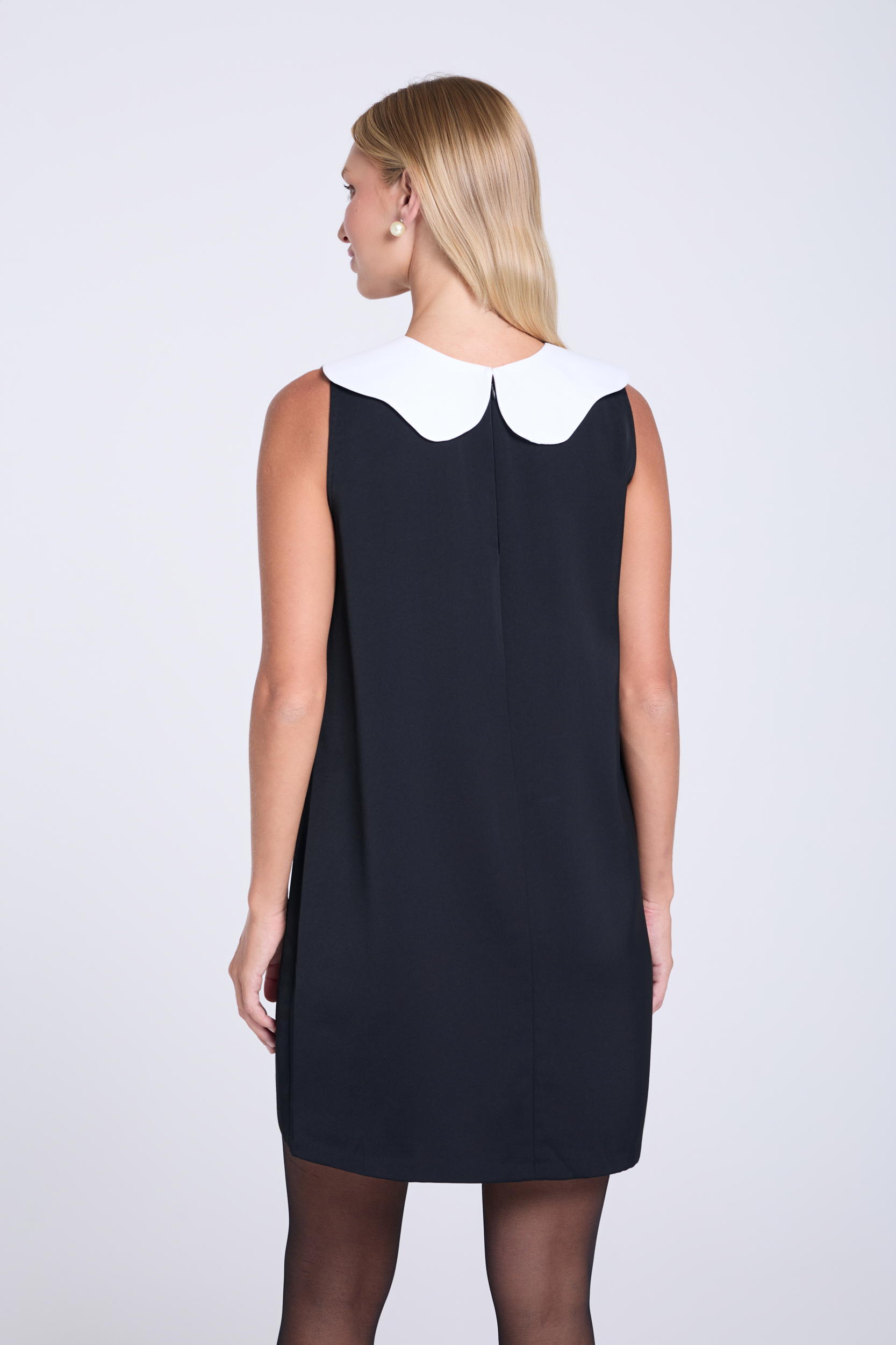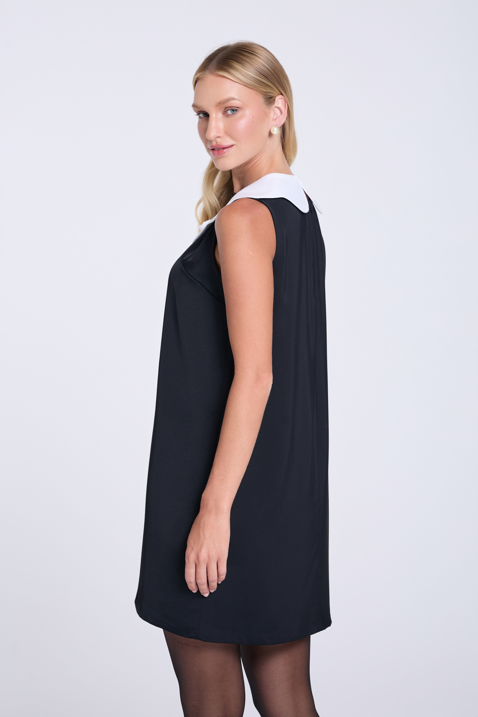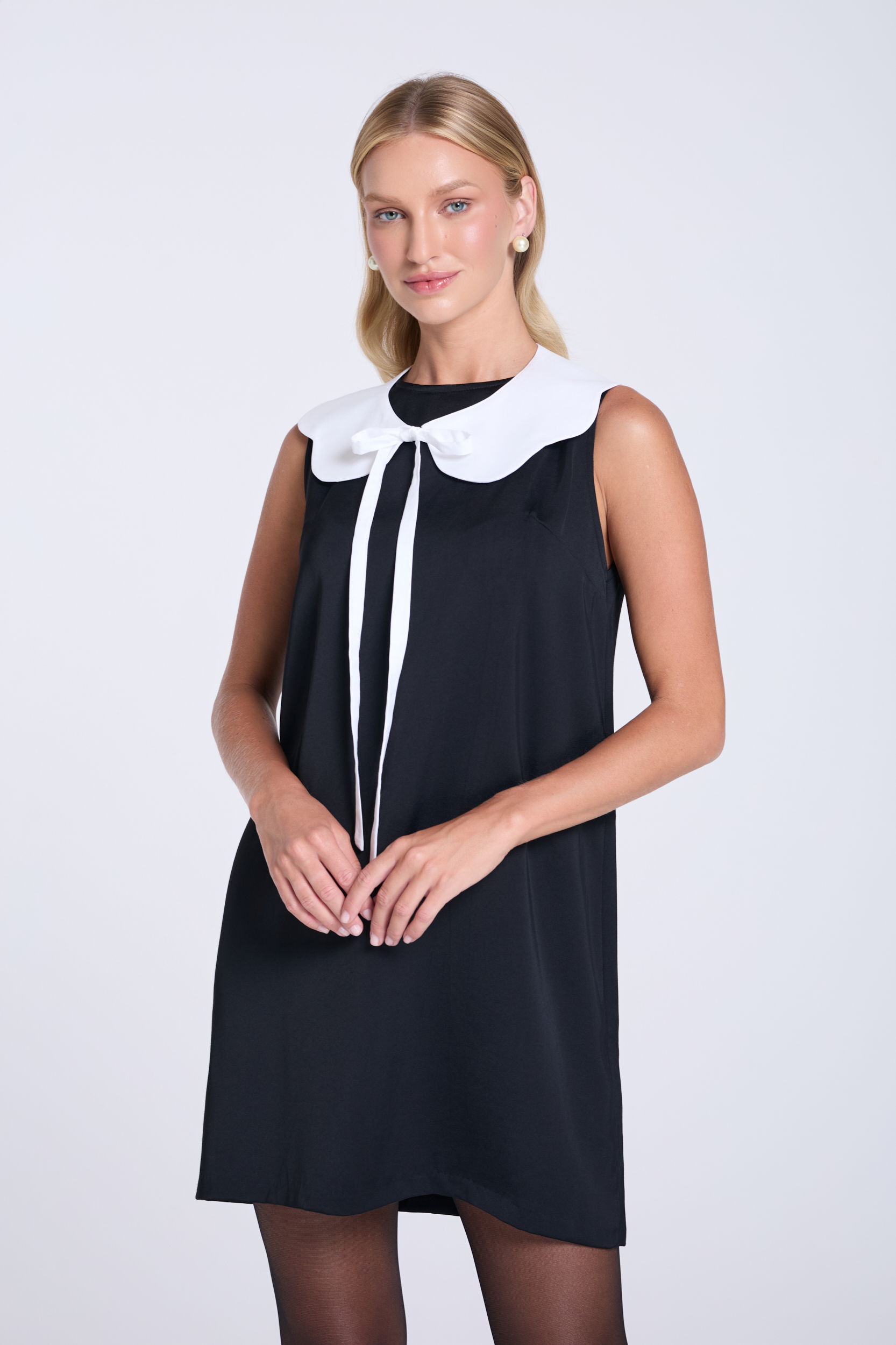 Czarna, krótka sukienka o luźnym, trapezowym fasonie, uszyta z komfortowej mieszanki z wiskozą. Jej minimalistyczny styl podkreśla okrągły dekolt i krój bez rękawów. Całość przełamuje efektowny, biały kołnierzyk z delikatnym wiązaniem (dostarczany w zestawie), który nadaje jej subtelny, ponadczasowy akcent w stylu retro. To projekt, który pozwala budować wszechstronne stylizacje: idealny na co dzień, do pracy, a także na bardziej eleganckie okazje.