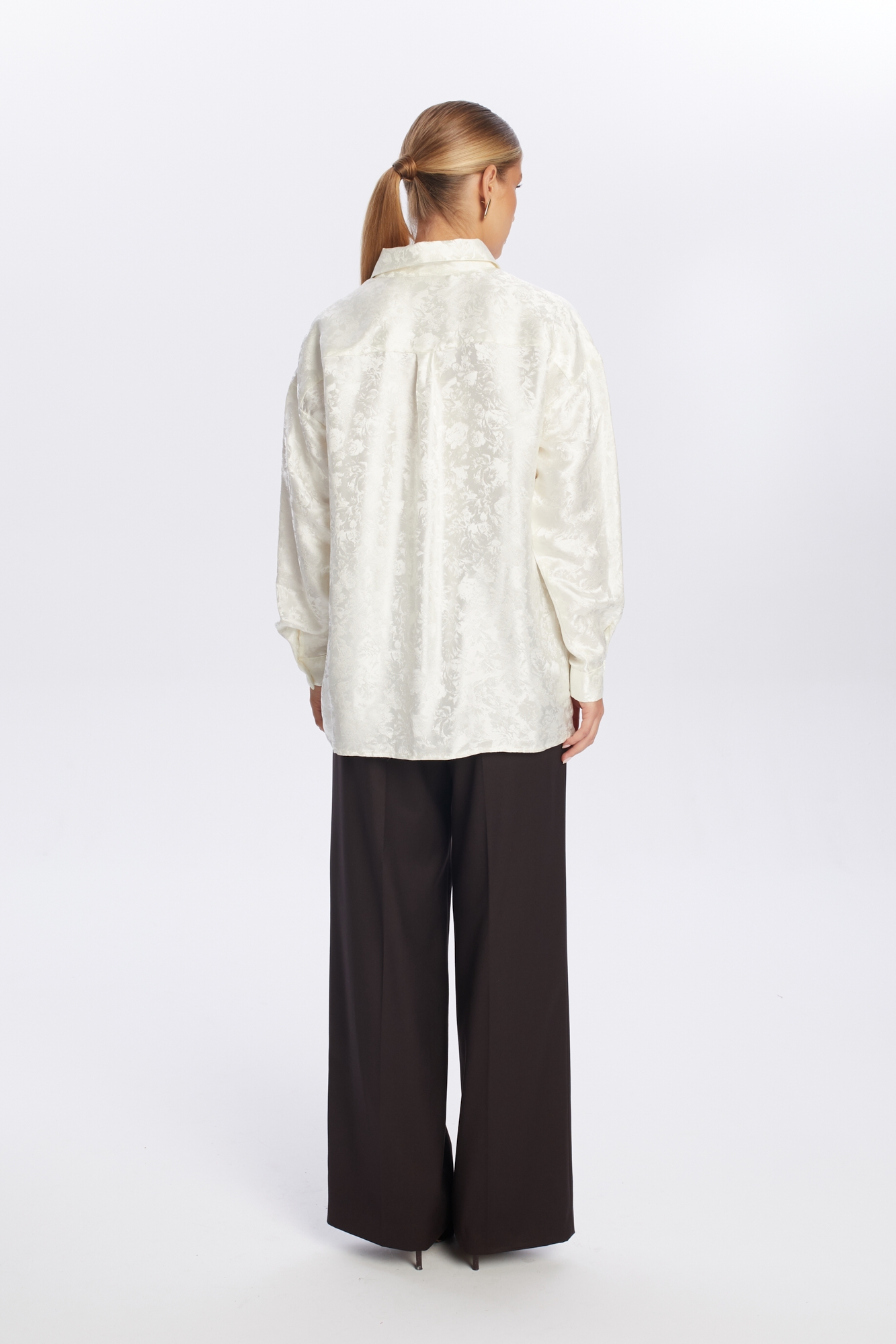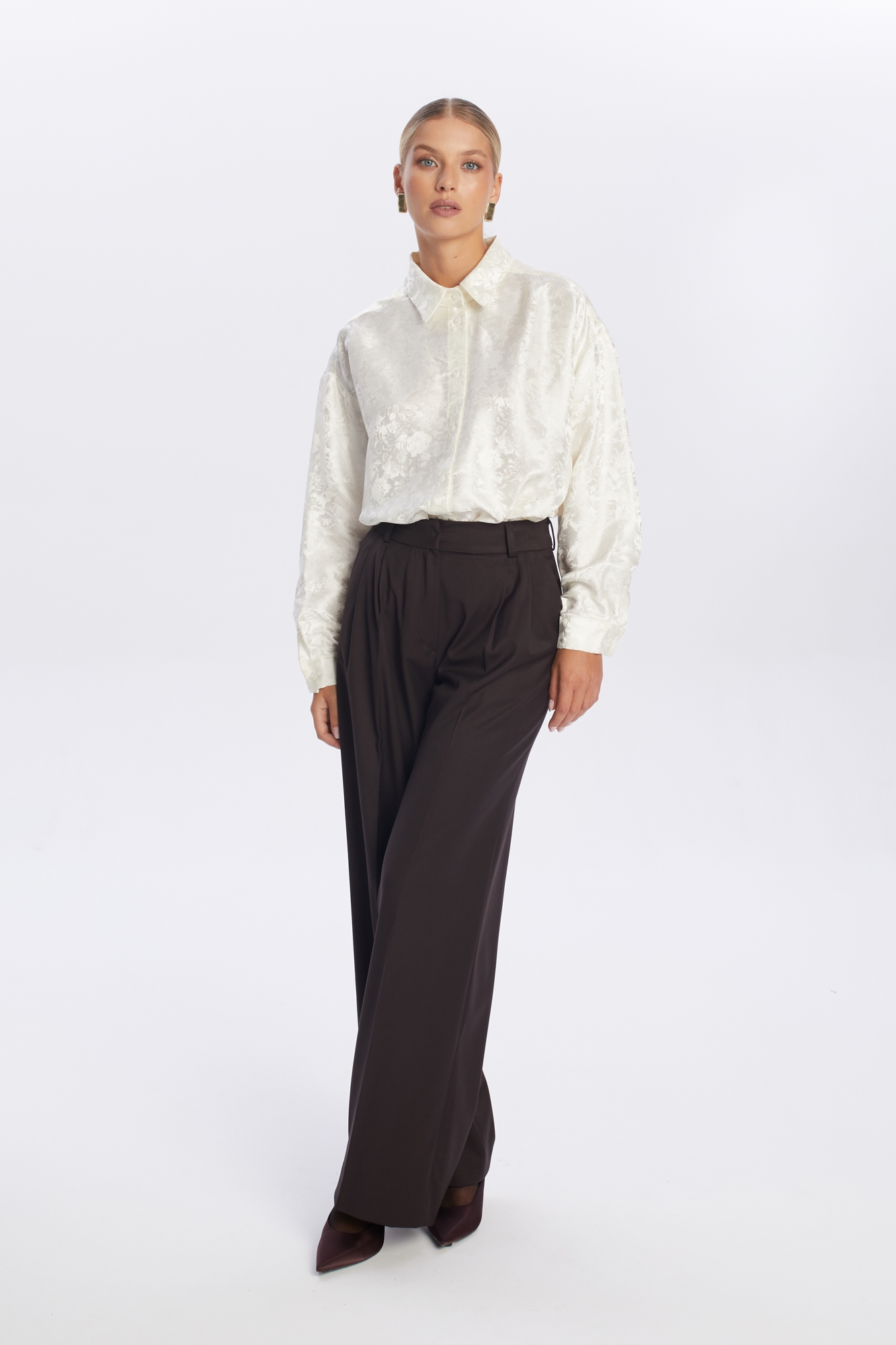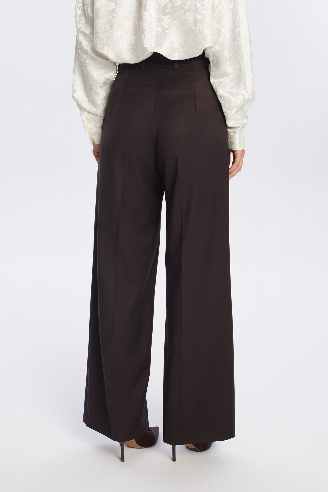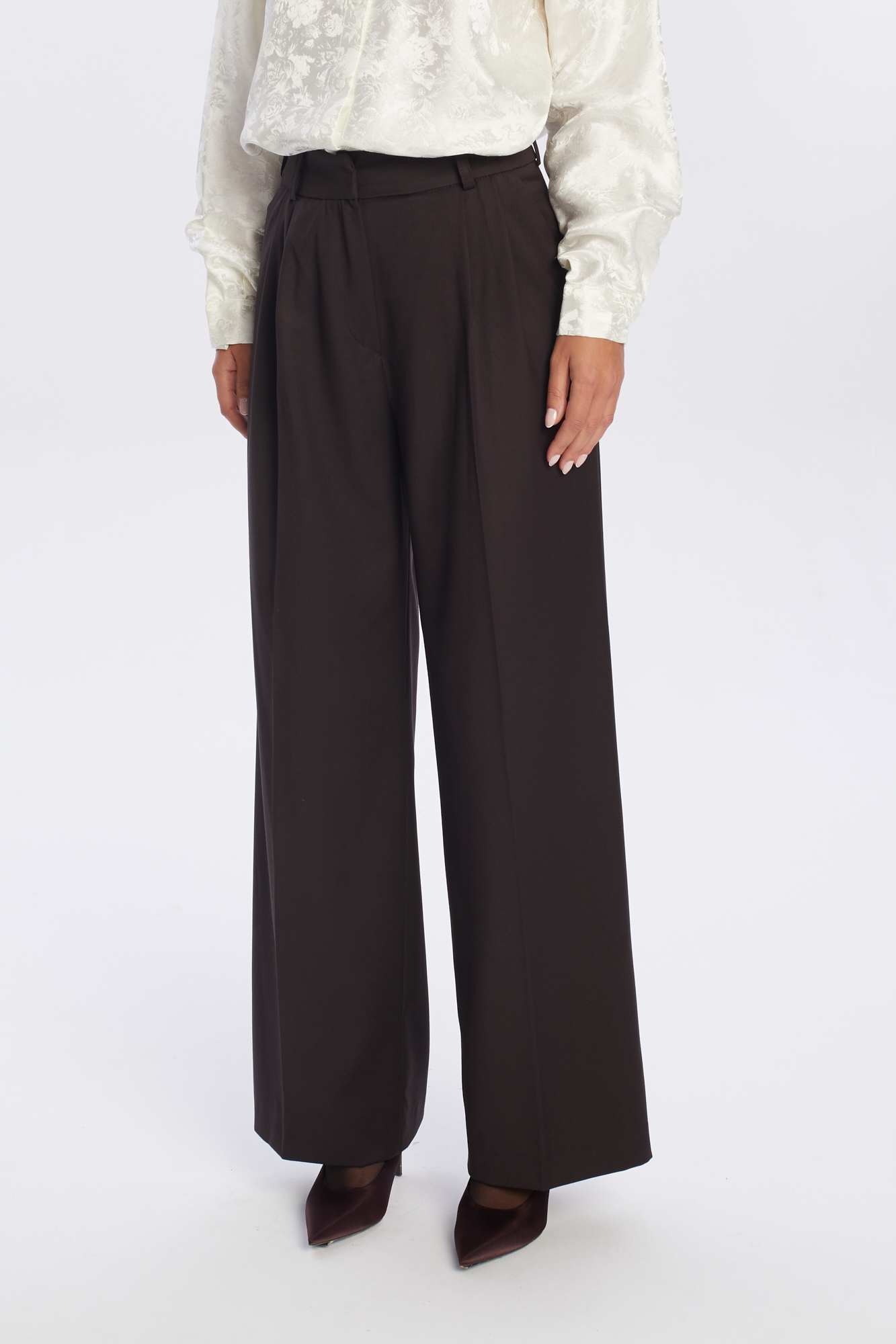 Ciemnobrązowe szerokie spodnie garniturowe z wysokim stanem, uszyte z mięsistej mieszanki wiskozy. Ich fason posiada charakterystyczne zakładki i szerokie nogawki w kant, które optycznie wydłużają nogi i nadają sylwetce smukłości. Wysoki stan podkreśla talię, a klasyczne detale, jak szlufki na pasek, boczne kieszenie oraz zapięcie na zamek i haftkę, dodają funkcjonalności. To uniwersalny element garderoby, idealny na co dzień i do pracy, który doskonale prezentuje się zarówno z elegancką bluzką, jak i ciepłym swetrem.
