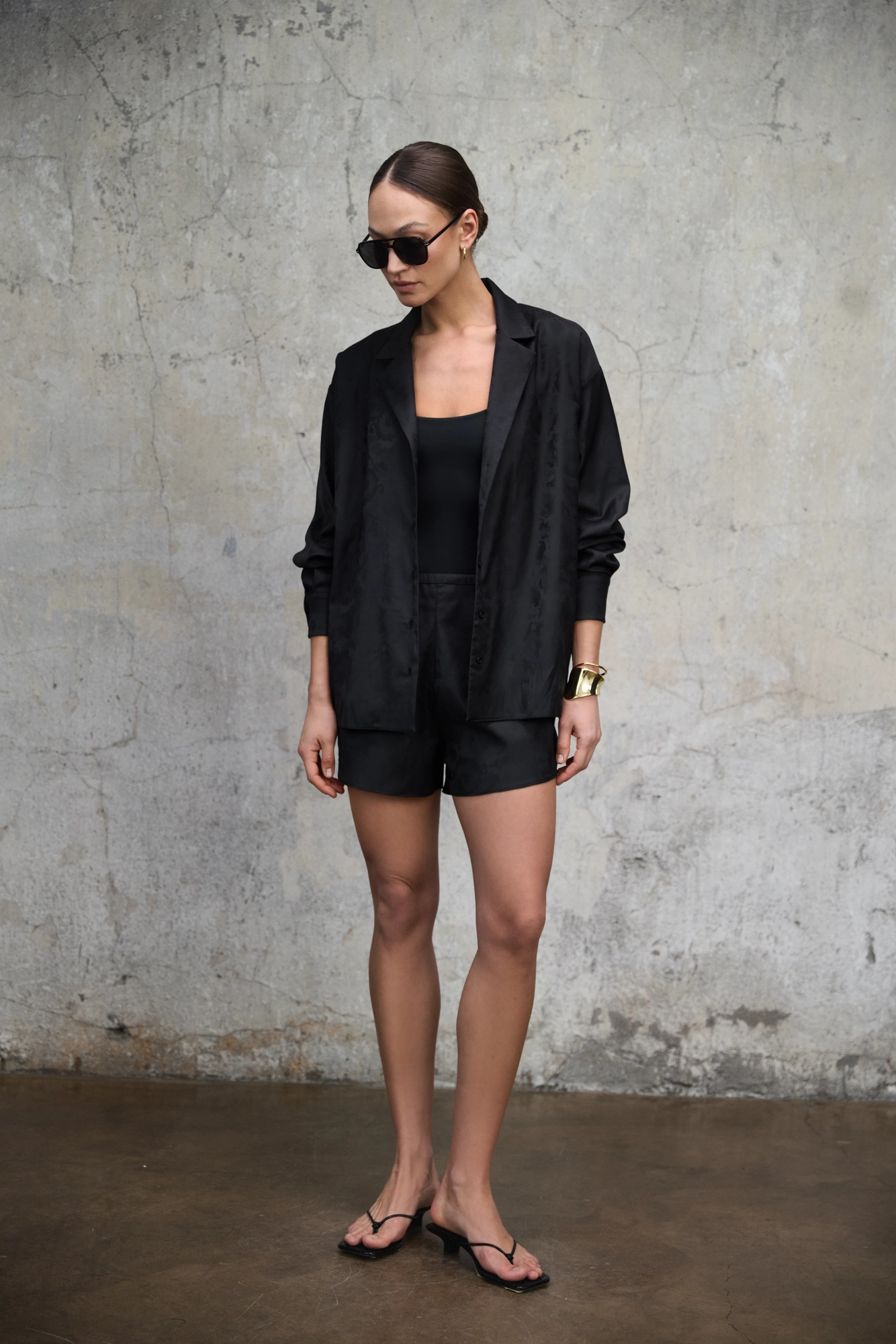 Szorty w delikatny, żakardowy print, wykonane z wysokiej jakości mieszanki wełny i wiskozy, o luźnym, swobodnym fasonie z elastyczną talią na gumce. Prosta forma i miękko układająca się tkanina podkreślają nowoczesny, niewymuszony charakter tego modelu.