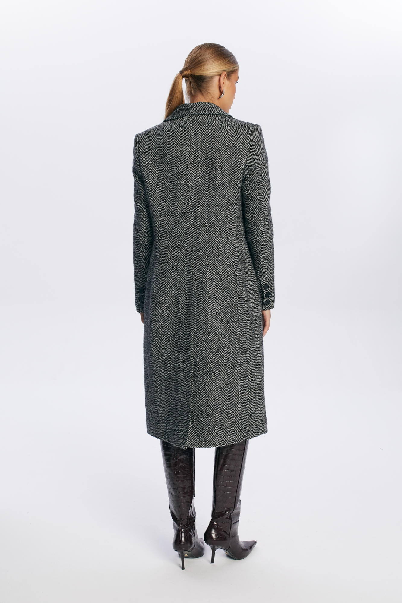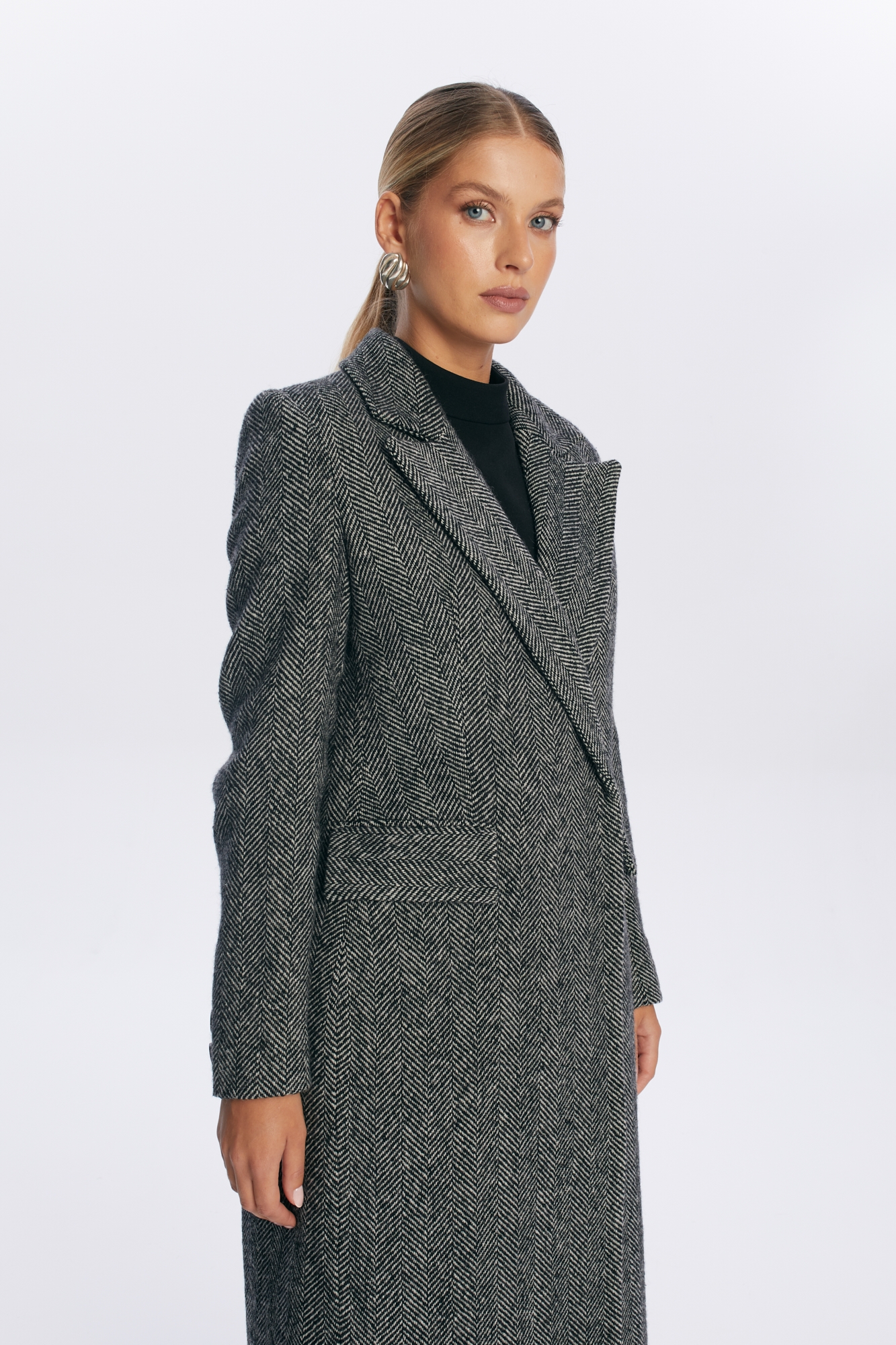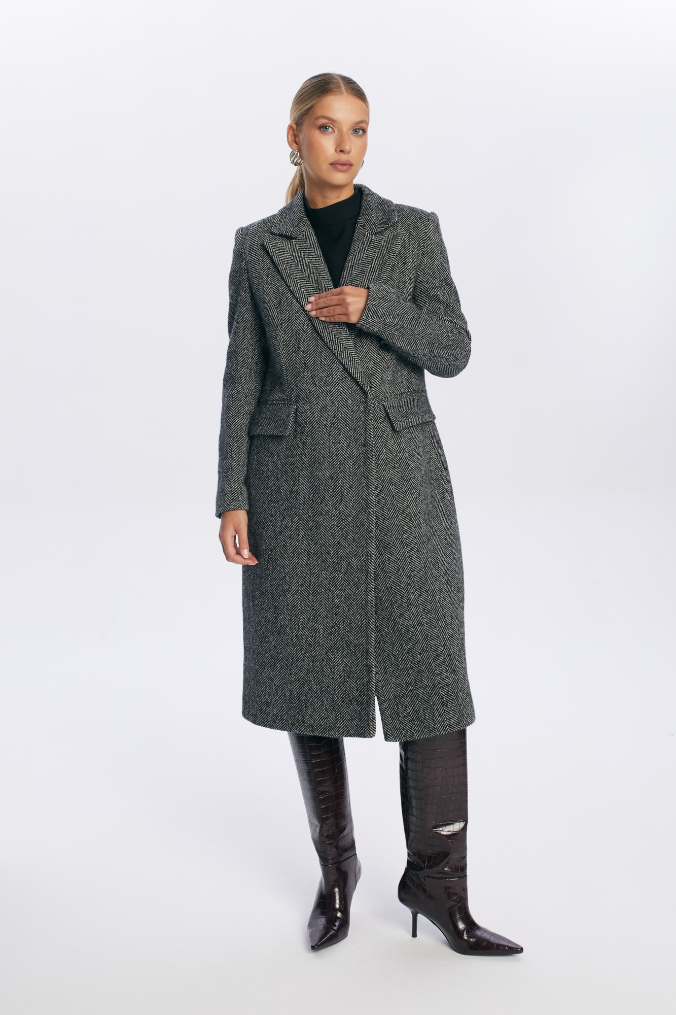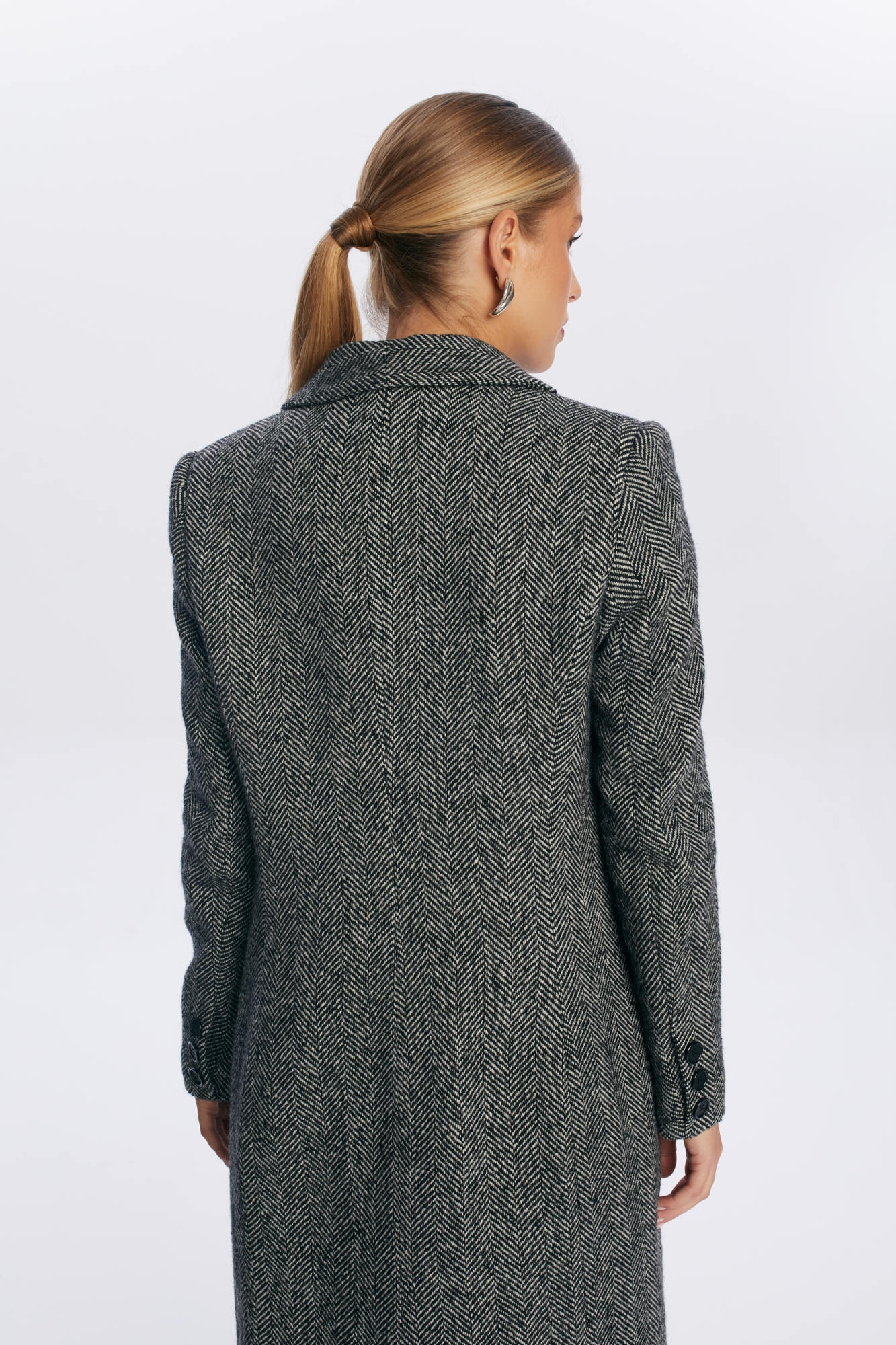 Czarny płaszcz o taliowanym fasonie midi we wzór jodełki, uszyty z mieszanki wełny, w tym wełny merino. Jego fason został zaprojektowany, aby doskonale podkreślać talię i nadawać sylwetce proporcji. Dla zachowania minimalistycznej formy, płaszcz zapinany jest na dyskretne zatrzaski od środka. Posiada dwie kieszenie z przodu oraz ozdobne guziki na rękawach. To absolutny klasyk, który będzie dopełnieniem zarówno eleganckich stylizacji, jak i nada niepowtarzalnego charakteru codziennym zestawom.