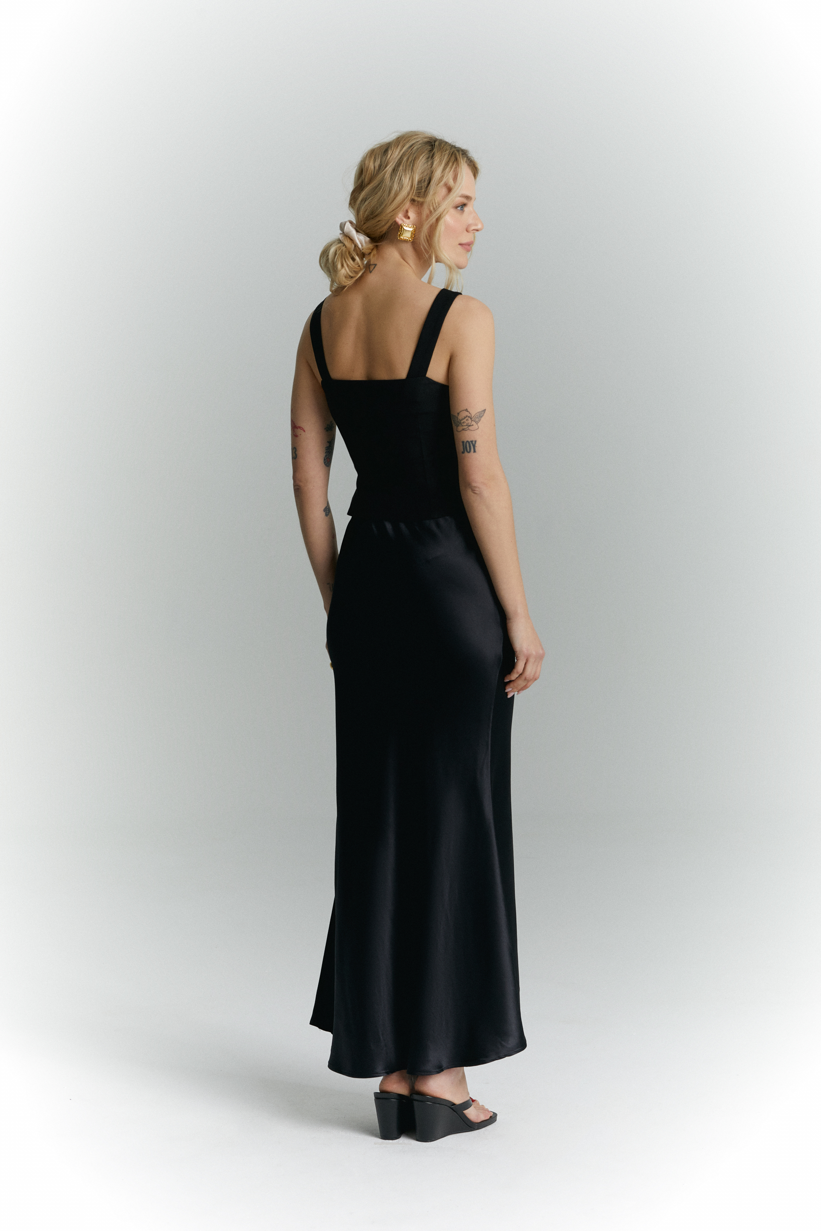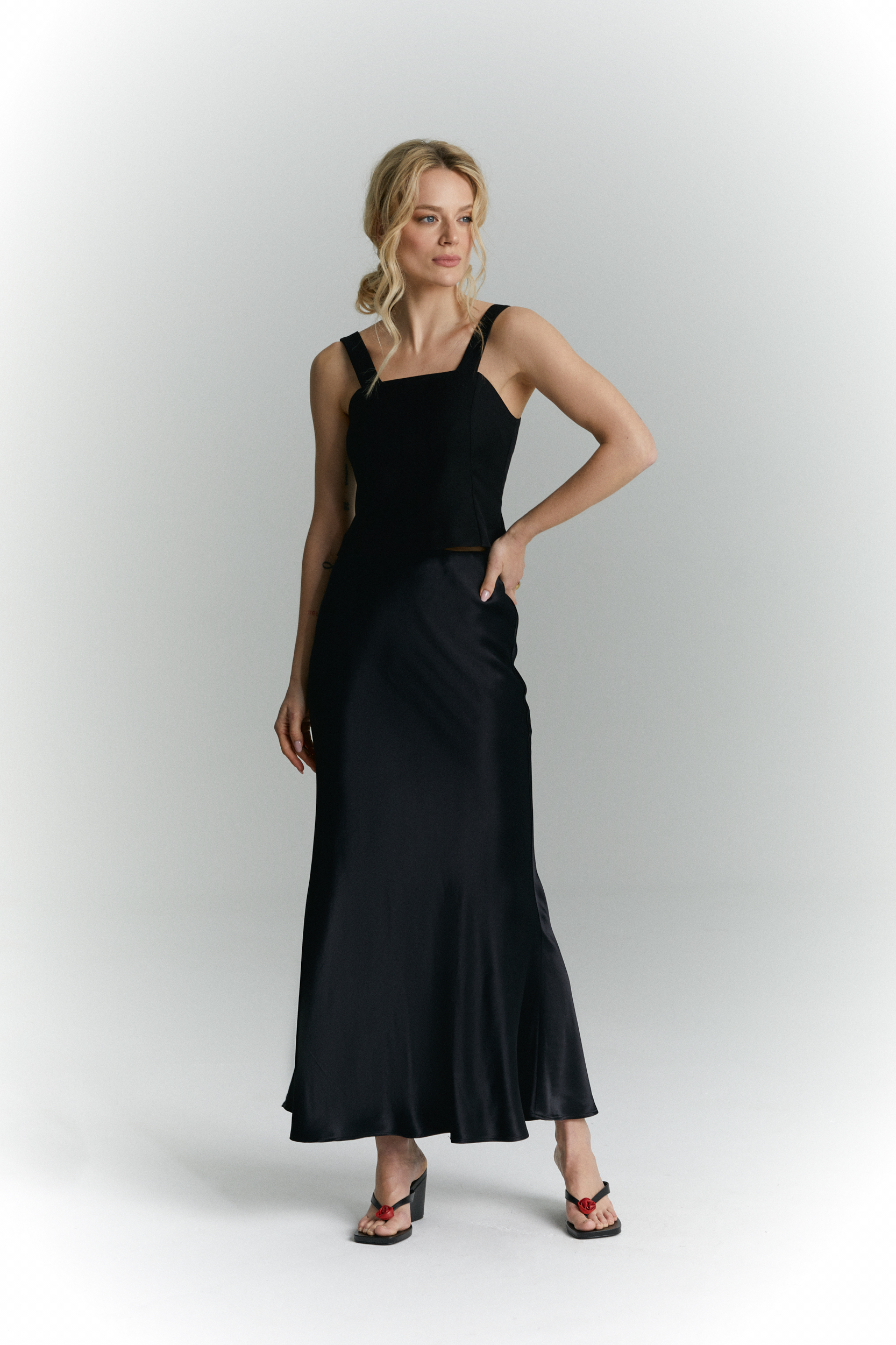 Czarny top Ingrid o dopasowanym kroju, uszyty z mieszanki wiskozy. To minimalistyczna propozycja o klasycznym, prostym fasonie na szerokich ramiączkach z dekoltem karo. Posiada dopasowany krój oraz boczny zamek, który ułatwia zakładanie. To wszechstronny element garderoby, idealny na co dzień i na eleganckie okazje – sprawdzi się zarówno w połączeniu z dopasowaną spódnicą, tworząc komplet, jak i w codziennych stylizacjach z jeansami.
