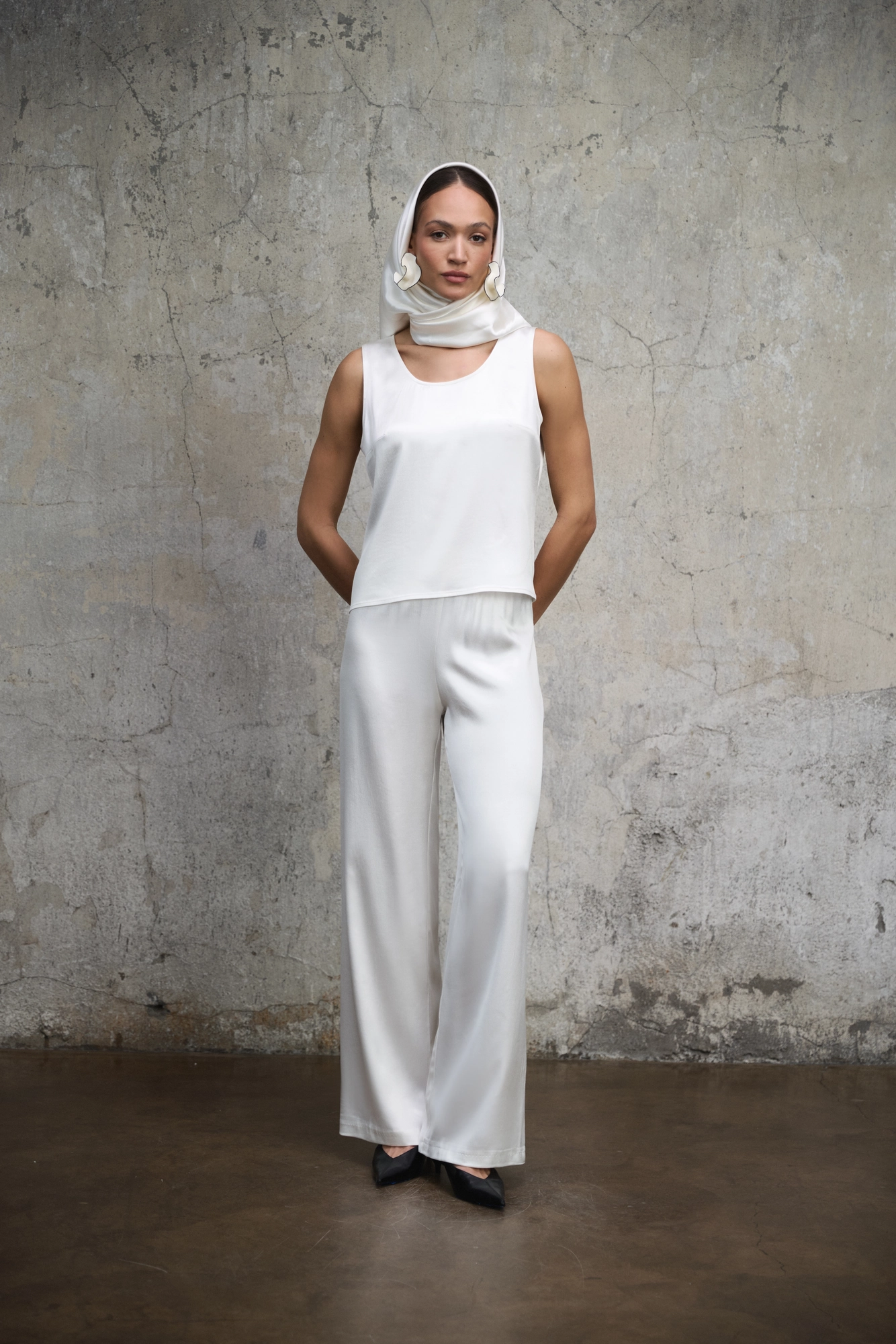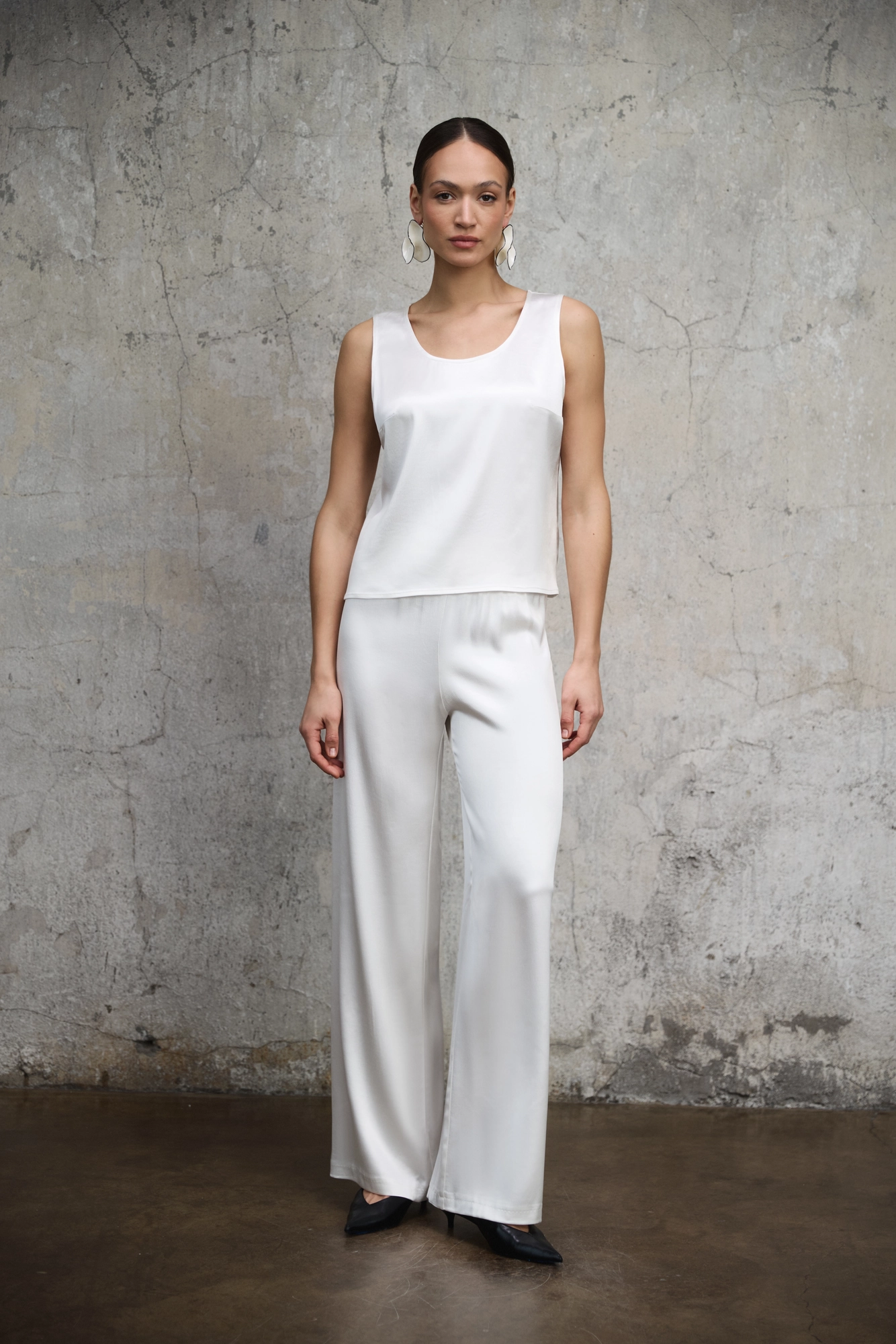 Top Soho w odcieniu perłowej bieli to esencja czystej, nowoczesnej prostoty. Minimalistyczna forma i subtelnie świetlista tkanina tworzą model, który naturalnie wpisuje się w ponadczasową garderobę. Uszyty z wysokiej jakości wiskozy o satynowym wykończeniu, miękko układa się na sylwetce i delikatnie odbija światło. Luźniejszy krój zapewnia swobodę ruchu, a szerokie ramiączka i klasyczny, zaokrąglony dekolt nadają mu harmonijne, wyważone proporcje. Perłowa biel podkreśla czystość linii i szlachetność tkaniny. Top sprawdzi się zarówno pod marynarką jako elegancka baza stylizacji, jak i w swobodnym zestawieniu ze spodniami Aura czy spódnicą. To uniwersalny element, który buduje przemyślaną, spójną garderobę. Każdy top szyty jest pojedynczo w naszym podkrakowskim atelier, w krótkiej serii i z pełną kontrolą nad procesem. To świadome krawiectwo oparte na jakości, a nie masowej produkcji.