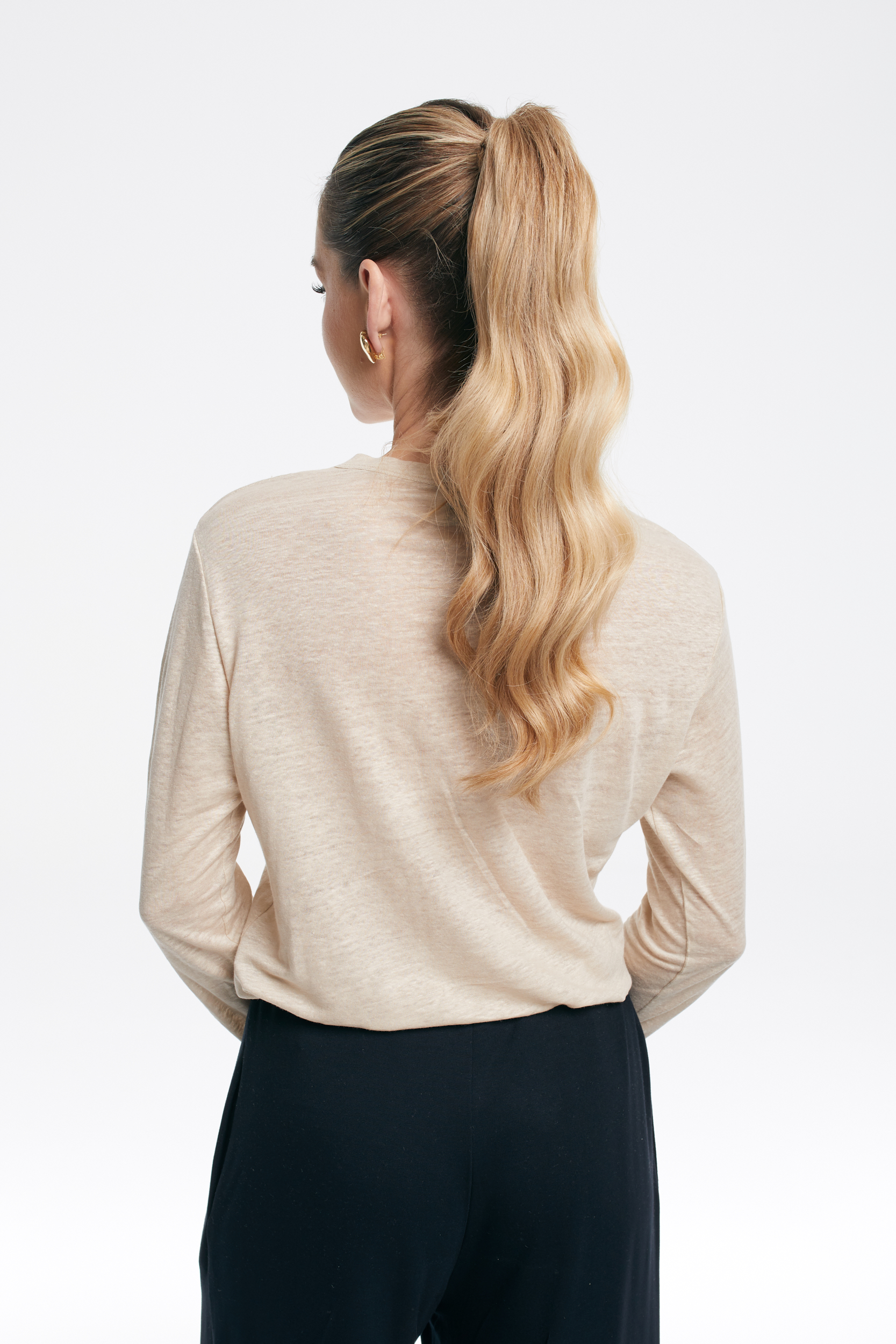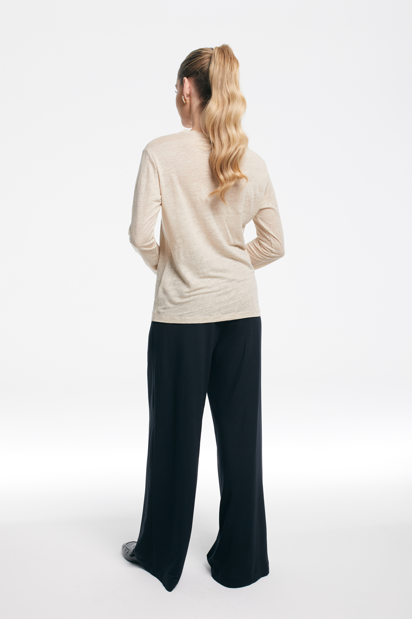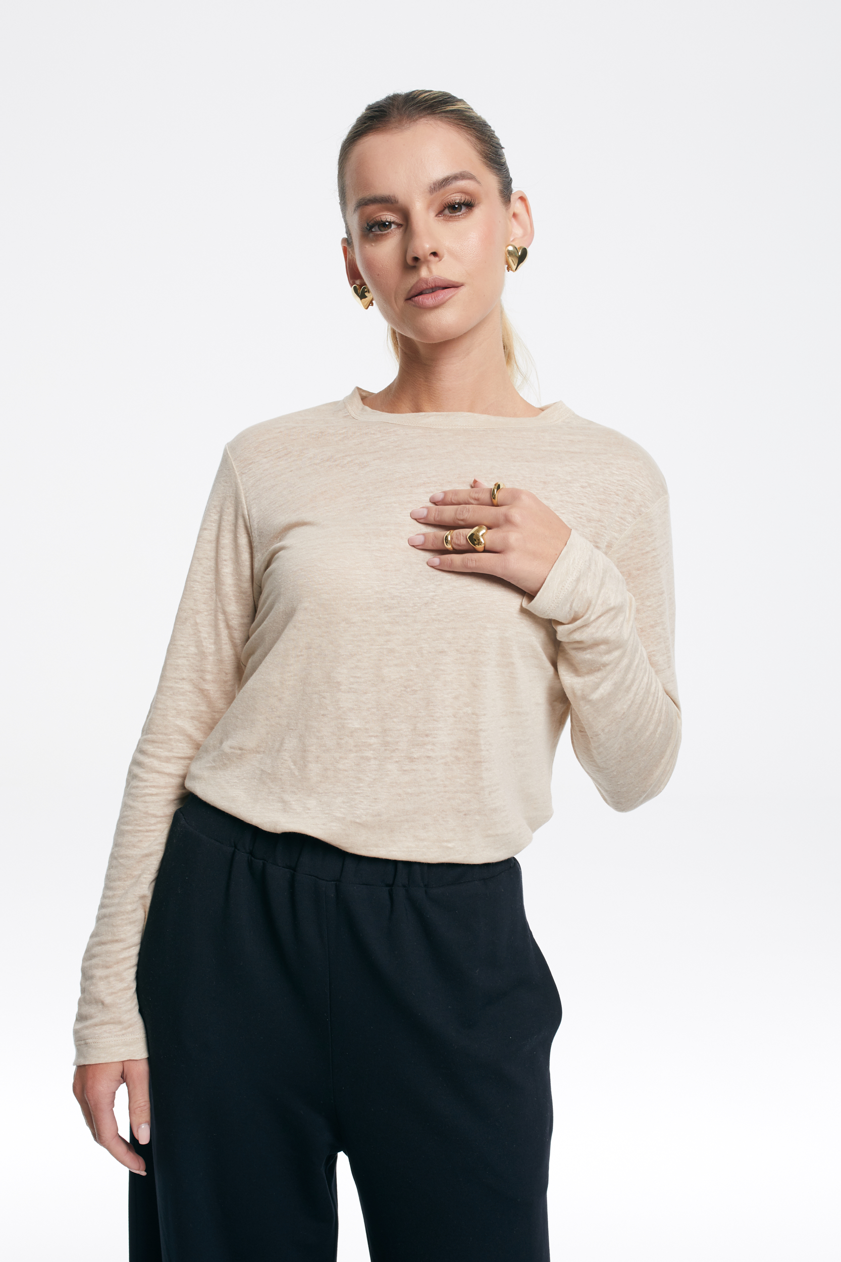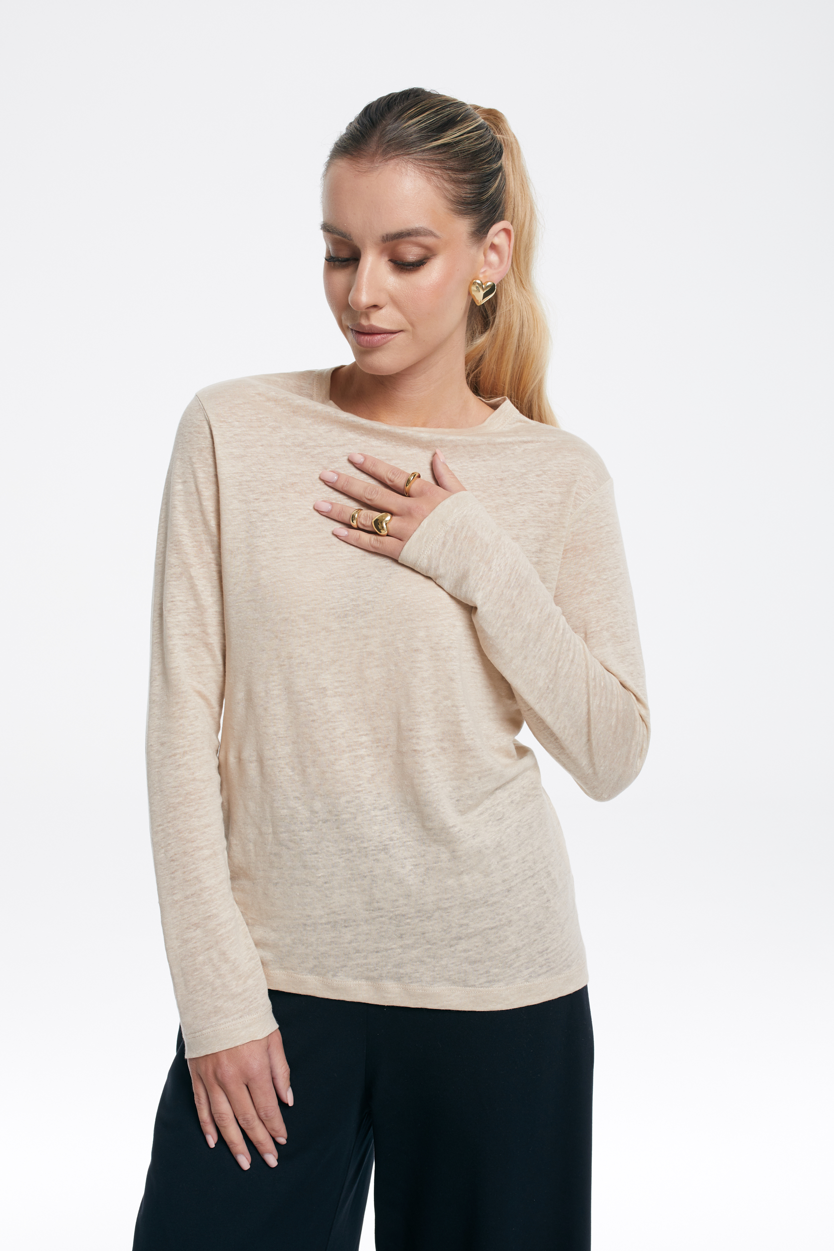 Lekko elastyczny materiał delikatnie układa się na sylwetce, a luźny krój dodaje swobody. Okrągły dekolt i długi rękaw nadają klasyczny, minimalistyczny charakter, dzięki czemu top świetnie wpasuje się w codzienne stylizacje.